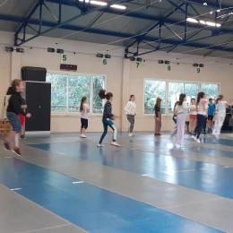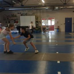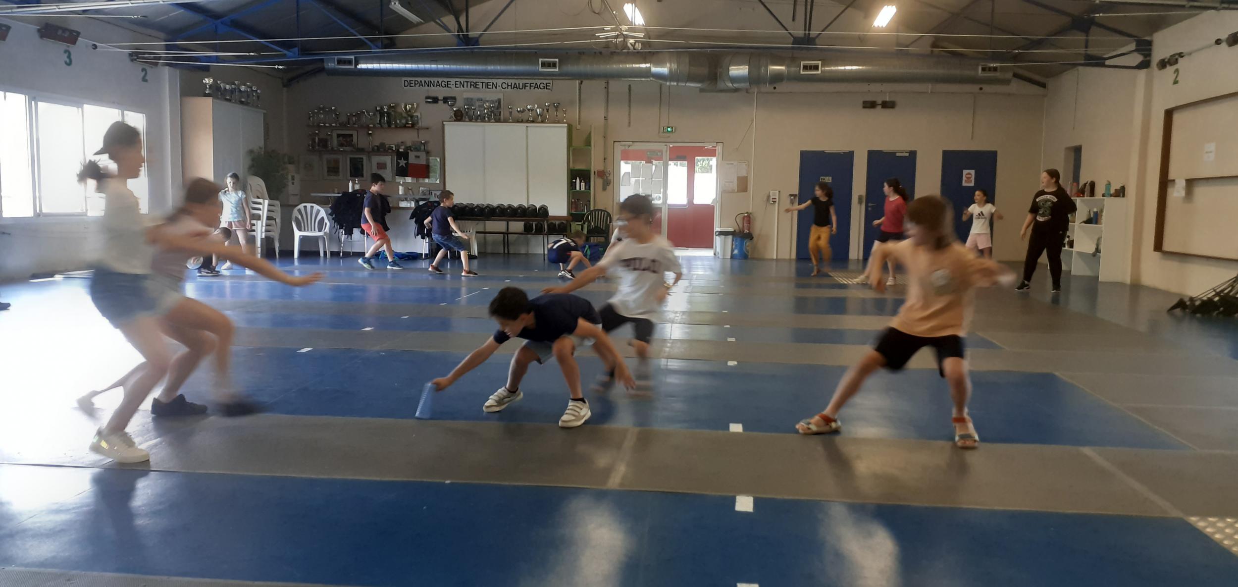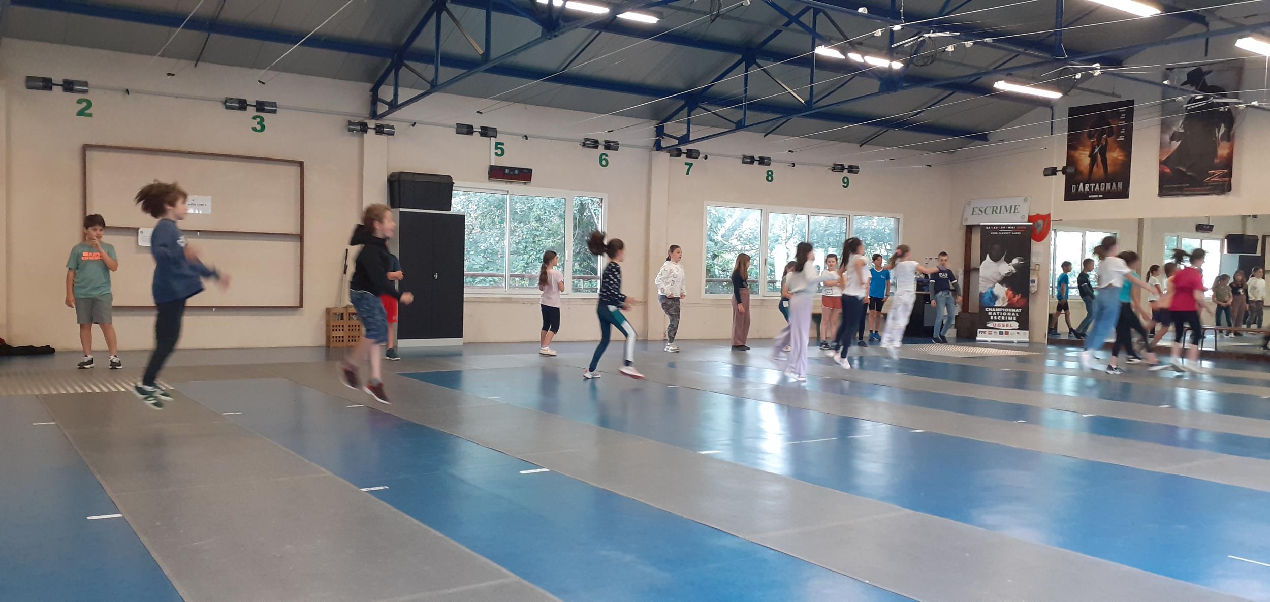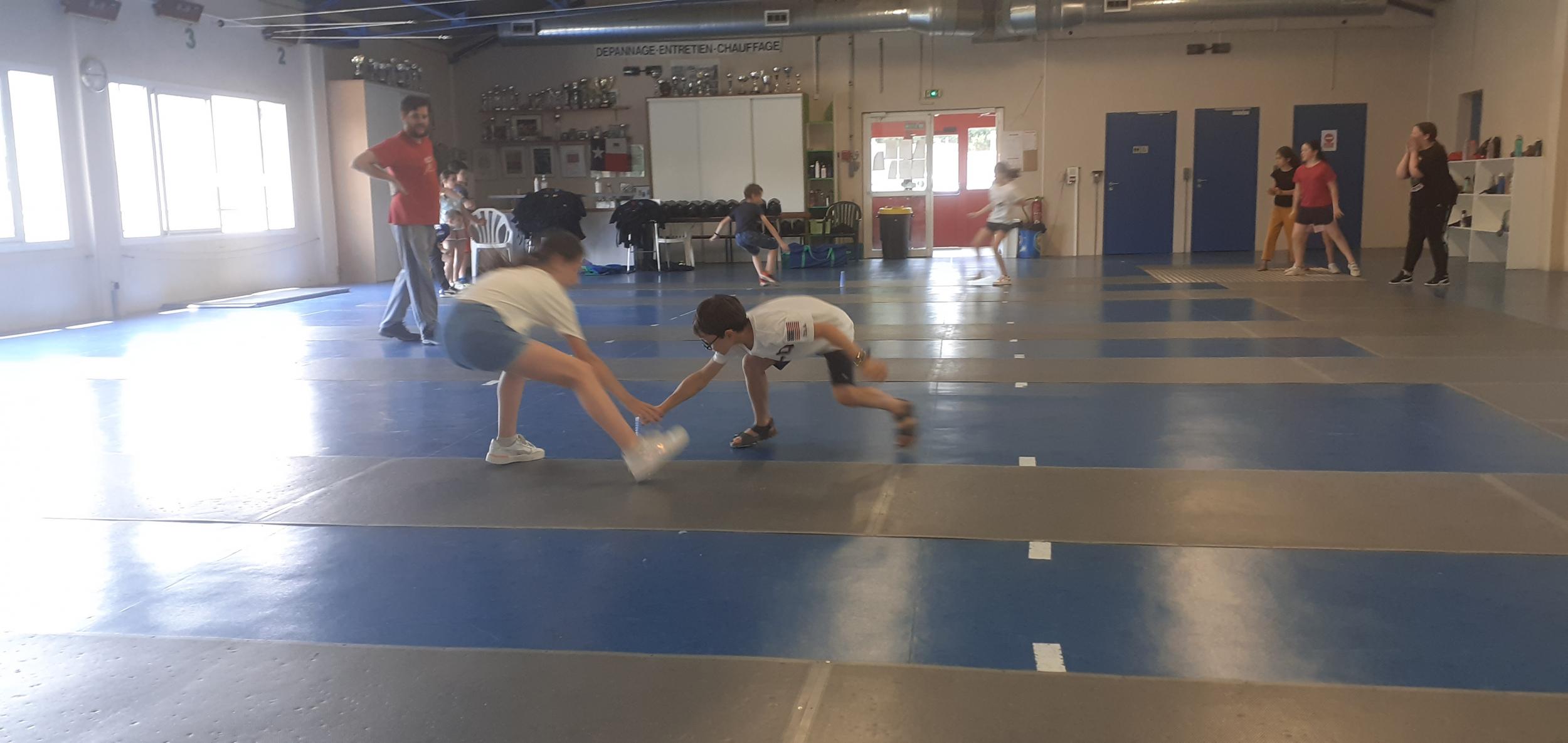 Après des échauffements sous forme de jeux (mobilisant aussi coopération et calcul mental), les élèves travaillent les techniques d'attaque, de parade et de riposte, pour mener de petits duels.