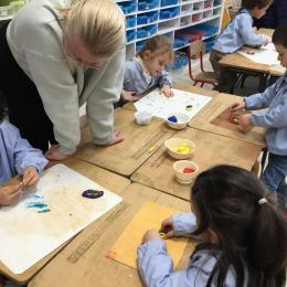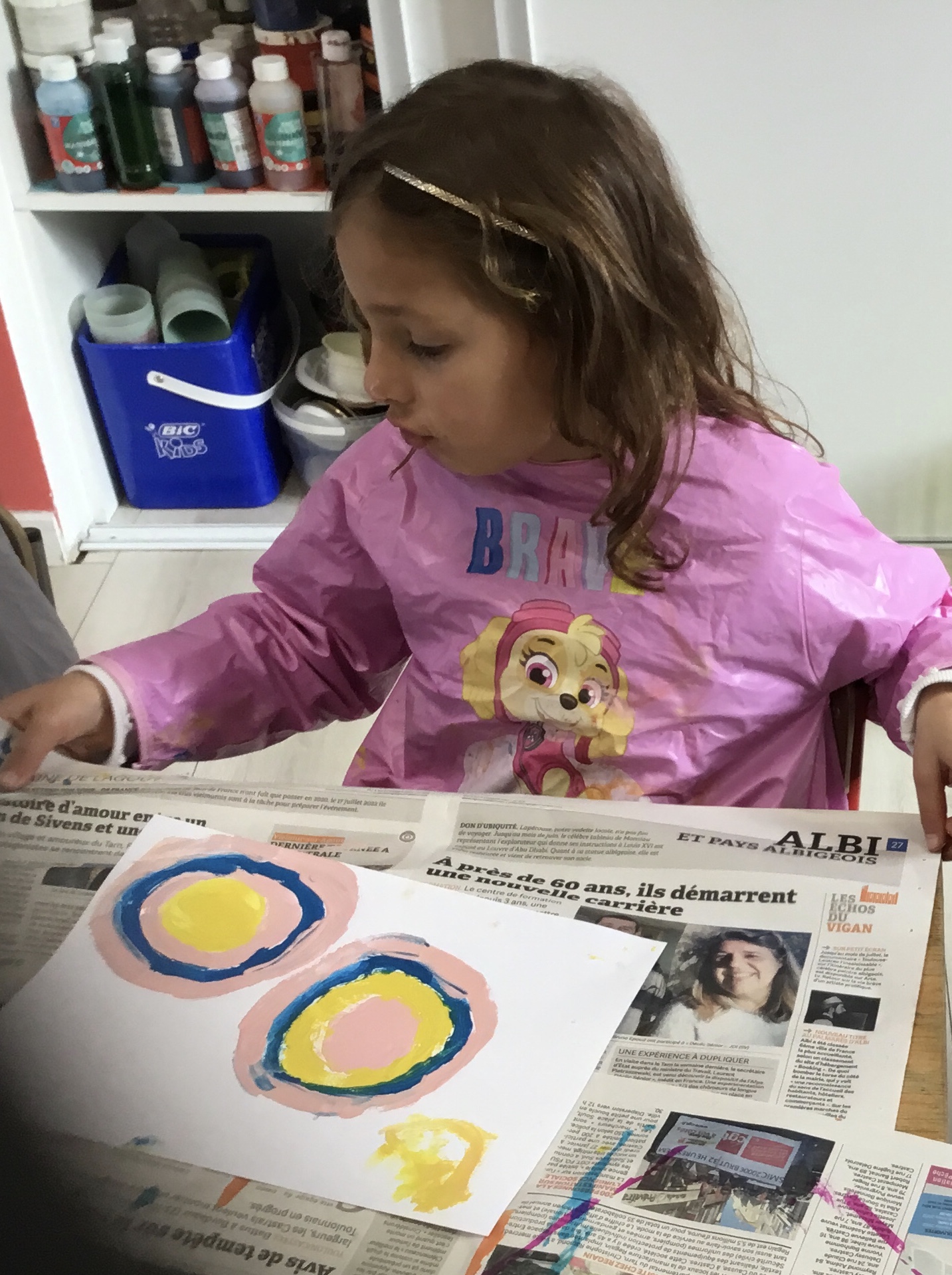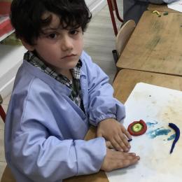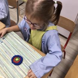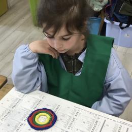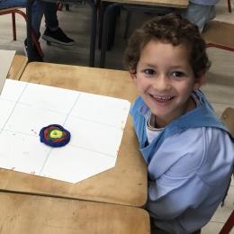 Ils ont ensuite découvert les œuvres de Robert Delaunay, ils ont peint en faisant des ronds avec différentes couleurs, du plus petit au plus grand.Ces ronds ont ensuite été découpés en quatre et assemblés par groupe, à la manière de Robert Delaunay.