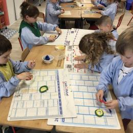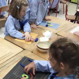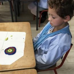 Après l’apprentissage d’une comptine, « des ronds bien rangés »,les élèves ont représenté avec de la pâte à modeler ce qu’ils ont appris.