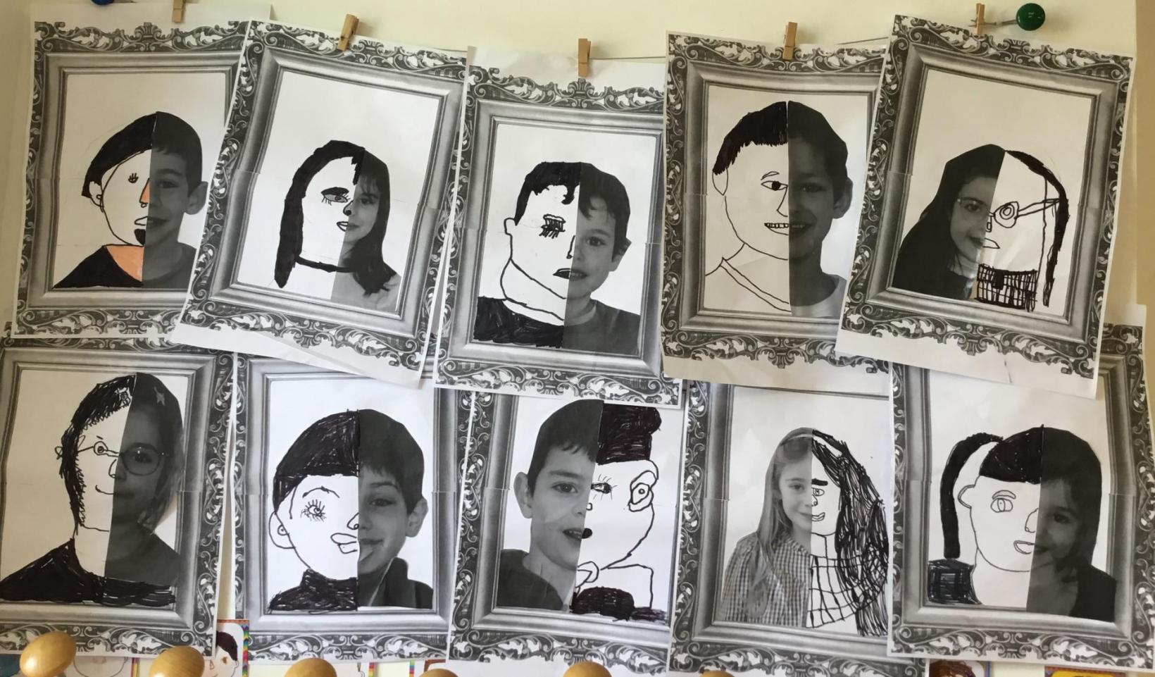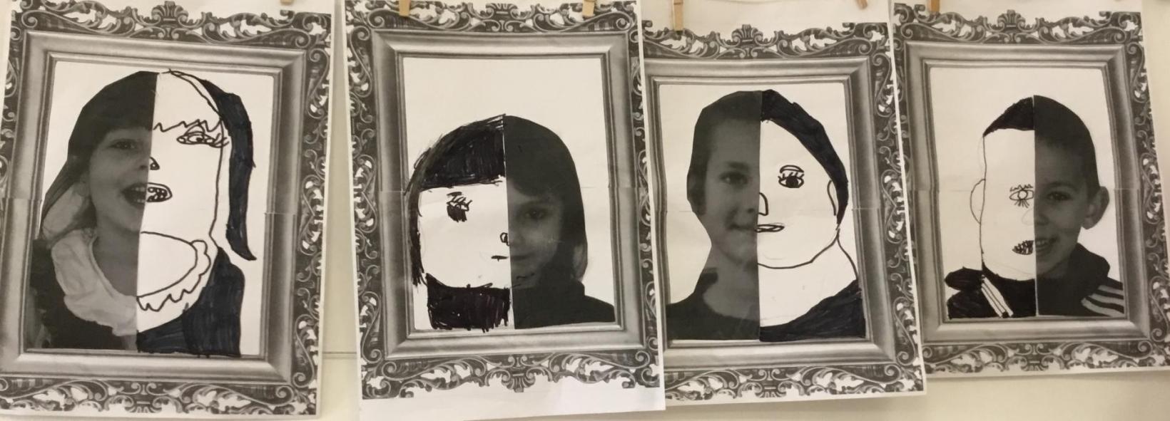 Après avoir collé leur demi-visage sur une feuille représentant un cadre de tableau,ils ont dessiné la seconde partie de leur visage. Après quelques corrections, ils ont repassé au feutre noir et colorié les parties les plus sombres.