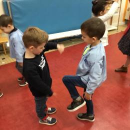 Les enfants jouent au jeu du marionnettiste. Ils se mettent en binôme, l’un fait le rôle de la marionnette et l’autre du marionnettiste. On imagine des ficelles accrochées aux poignets et aux pieds des élèves dans le rôle de la marionnette . Ils se laissent guider par le marionnettiste qui leur fait lever les bras ou les pieds en tirant sur la ficelle.Ce jeu oblige les enfants à prendre en compte l’autre . Il permet une relation attentive entre les enfants. Puis on permute et on change les rôles.