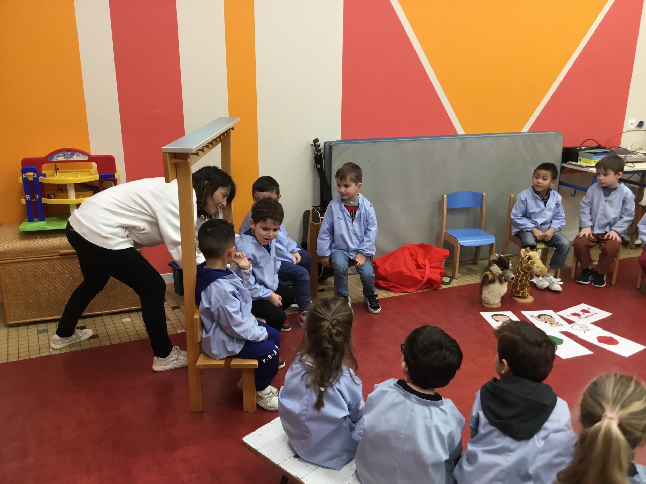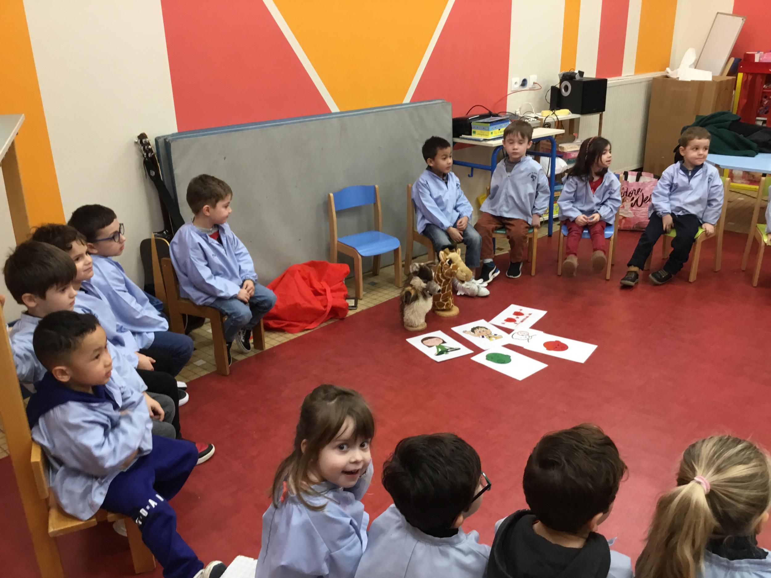 Petite et moyenne section 27/01/2024 Stéphanie a appris aux élèves à énoncer oralement un message clair en cas de conflit entre élèves par l’intermédiaire de Gigi et Loulou les marionnettes .