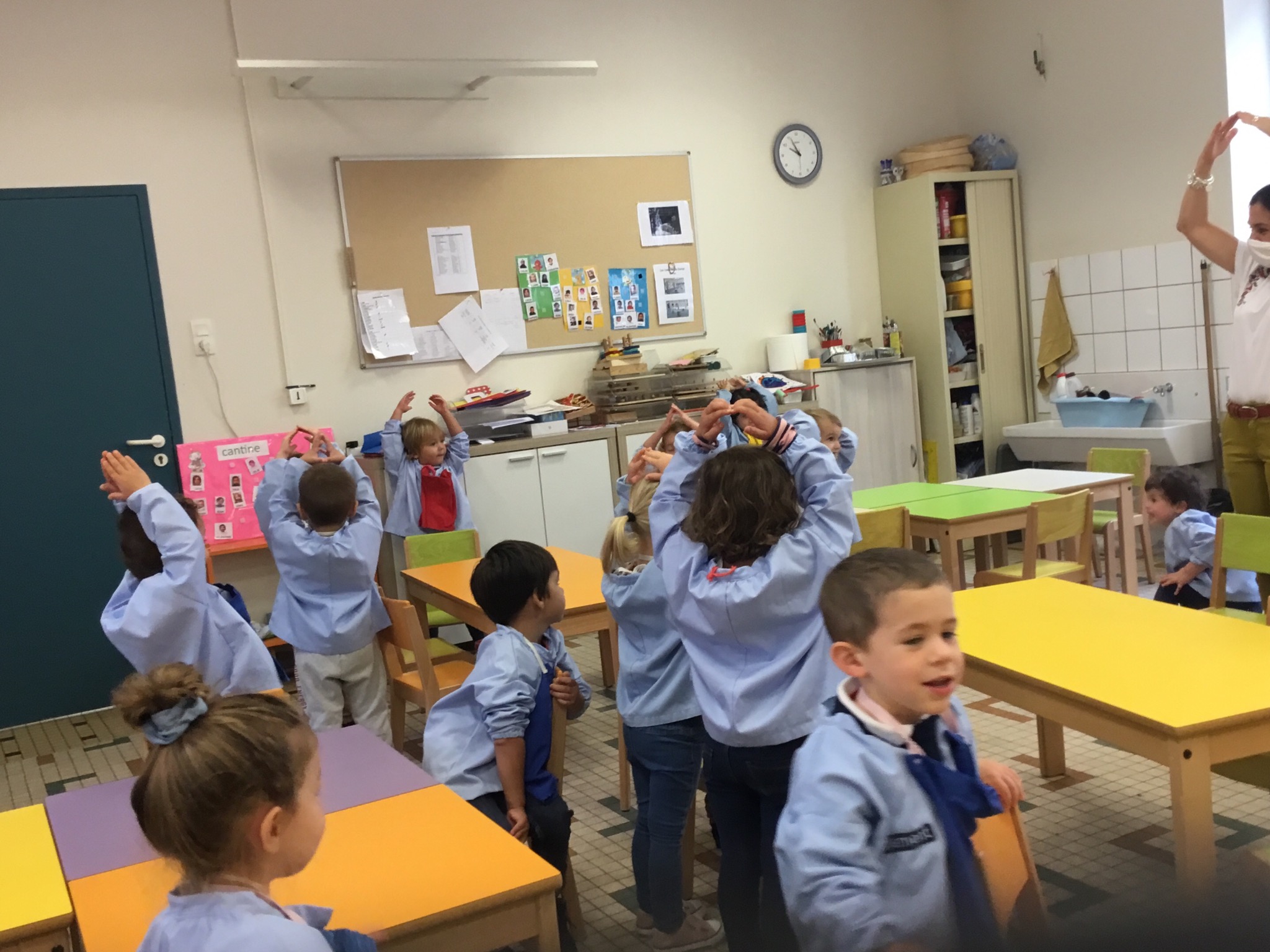 Petite et moyenne section 25/09/2020 Les enfants ont aimé se cacher sous les tables, monter sur la chaise, mettre les mains sur ou au dessus de la tête.... se placer devant ou derrière la chaise.....