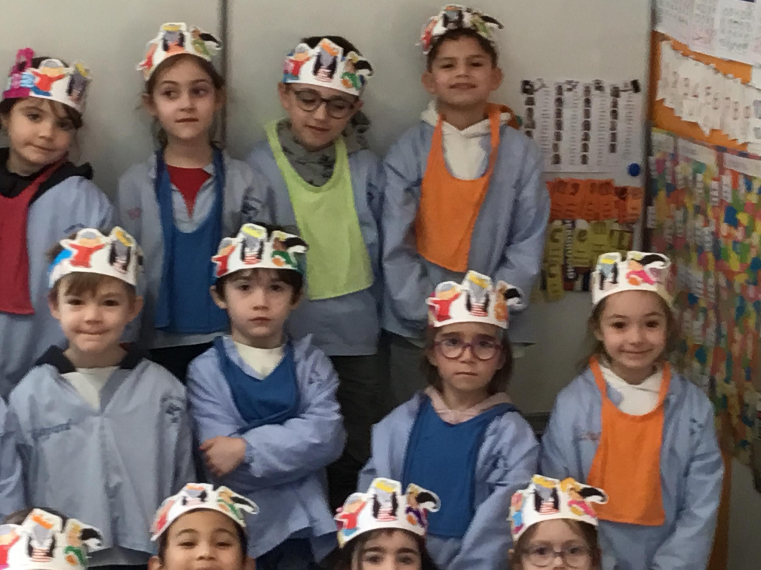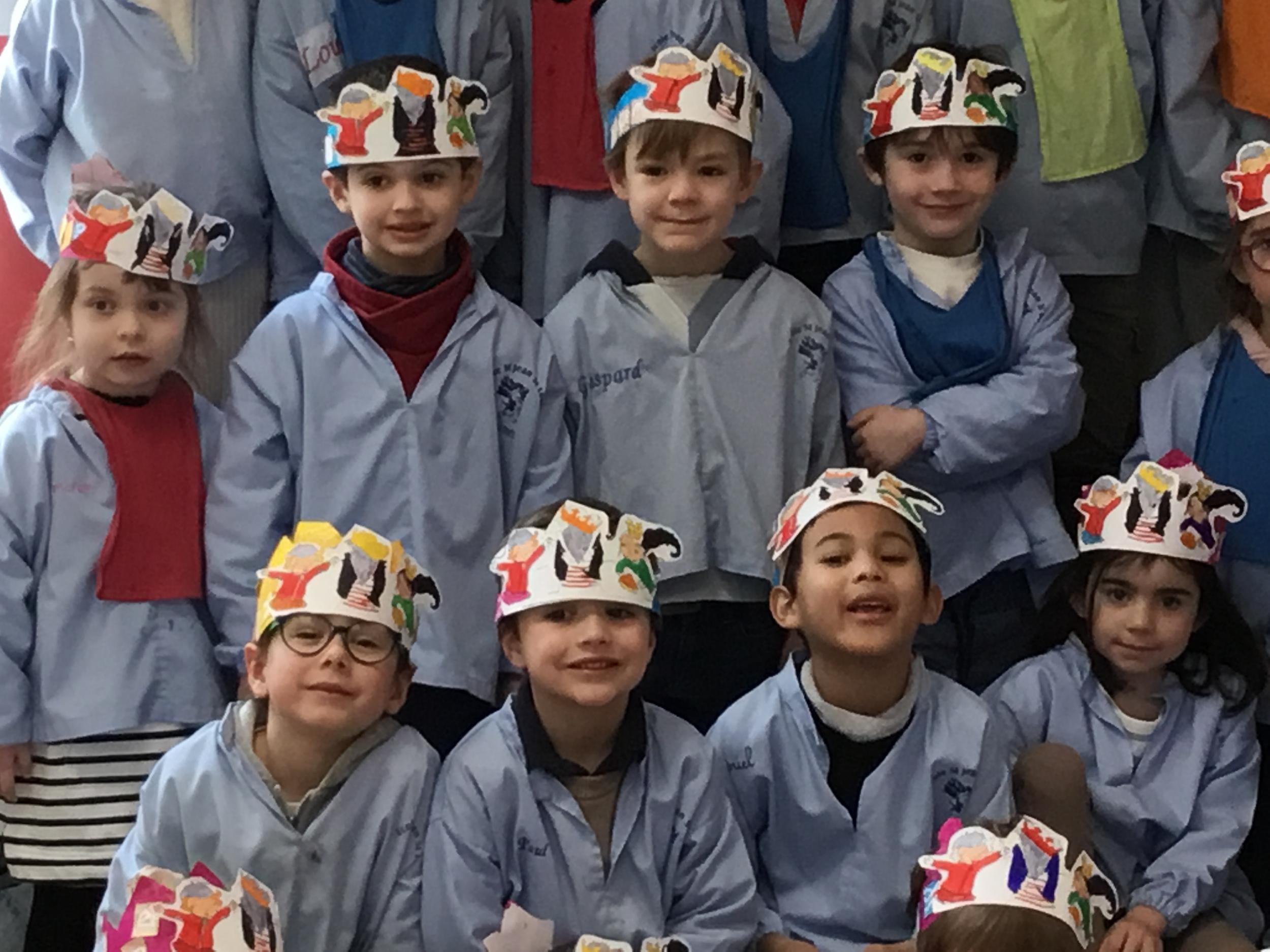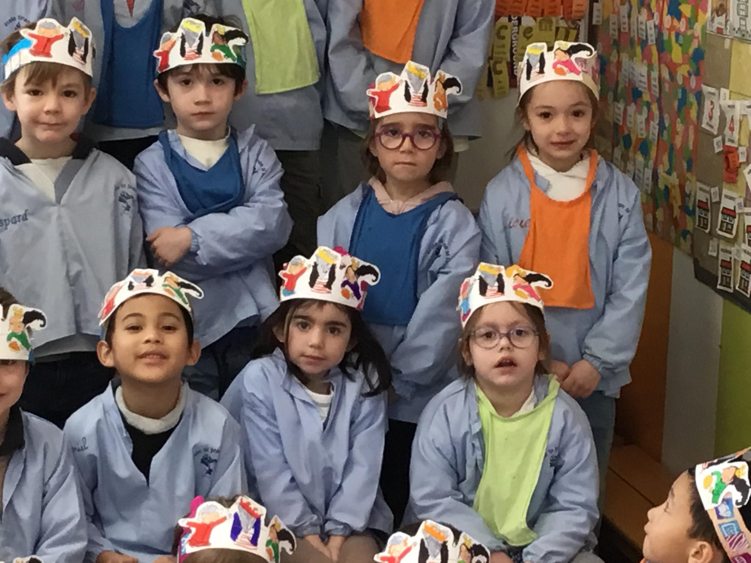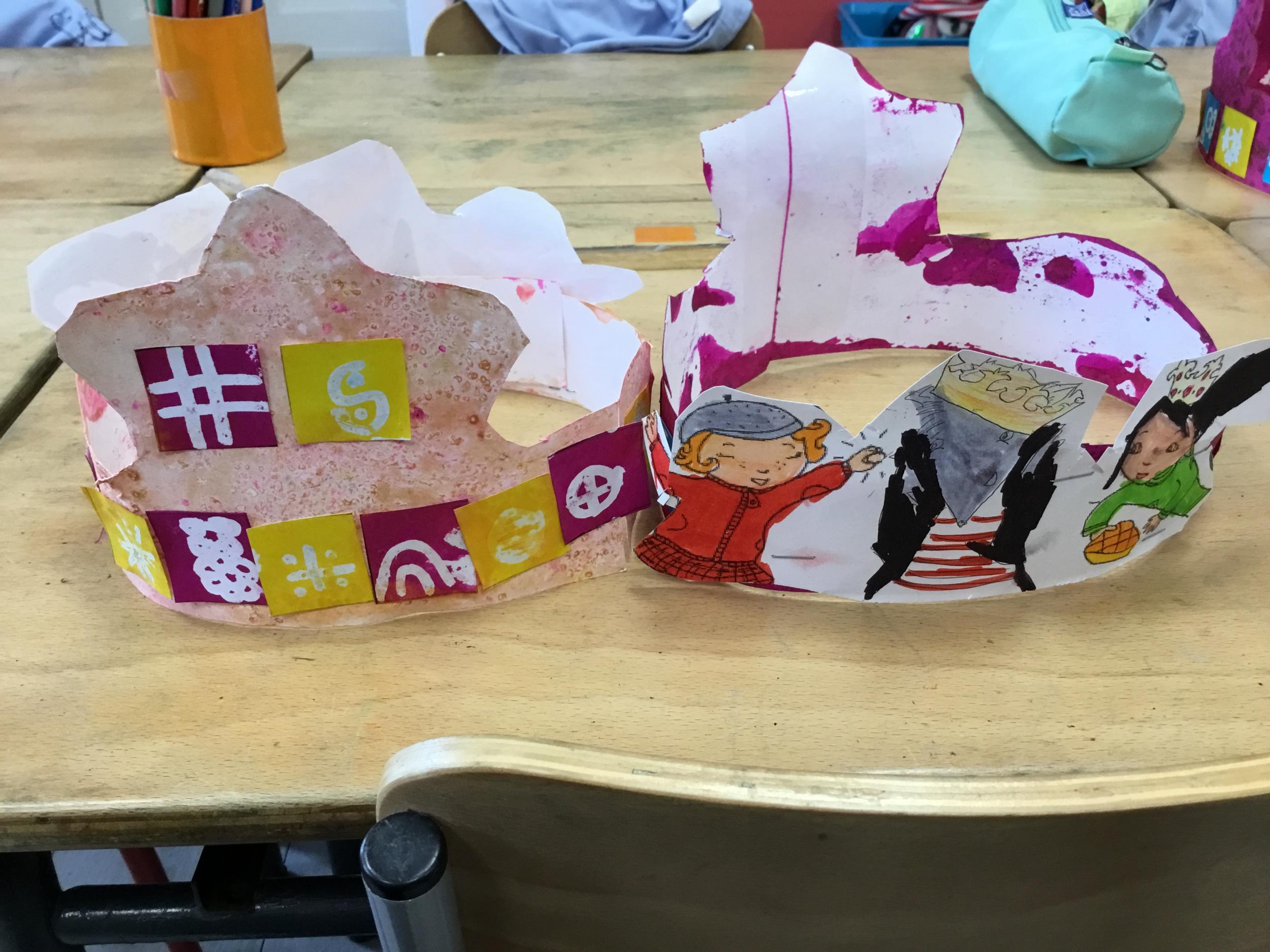 Nous avons travaillé sur un album de galette "la galette du roi loup". Les élèves ont inventé et dessiné plusieurs fins de cette histoire. Ils ont aussi réalisé une couronne en utilisant diverses techniques : choisir un gabarit de couronne, tracer les contours et la découper précisément. La peindre à l'encre et au gros sel : en l'enlevant après séchage, le sel a laissé divers motifs.