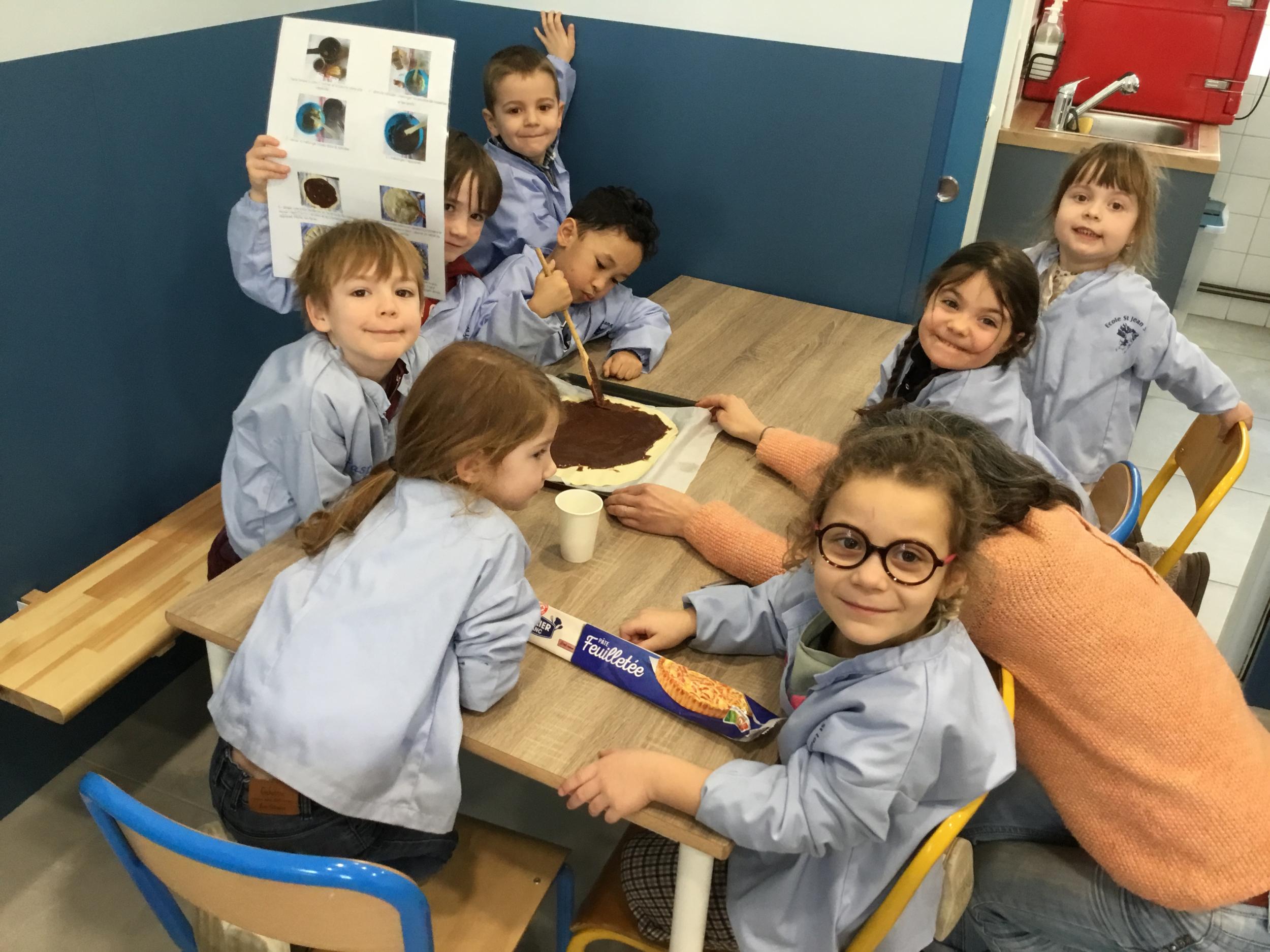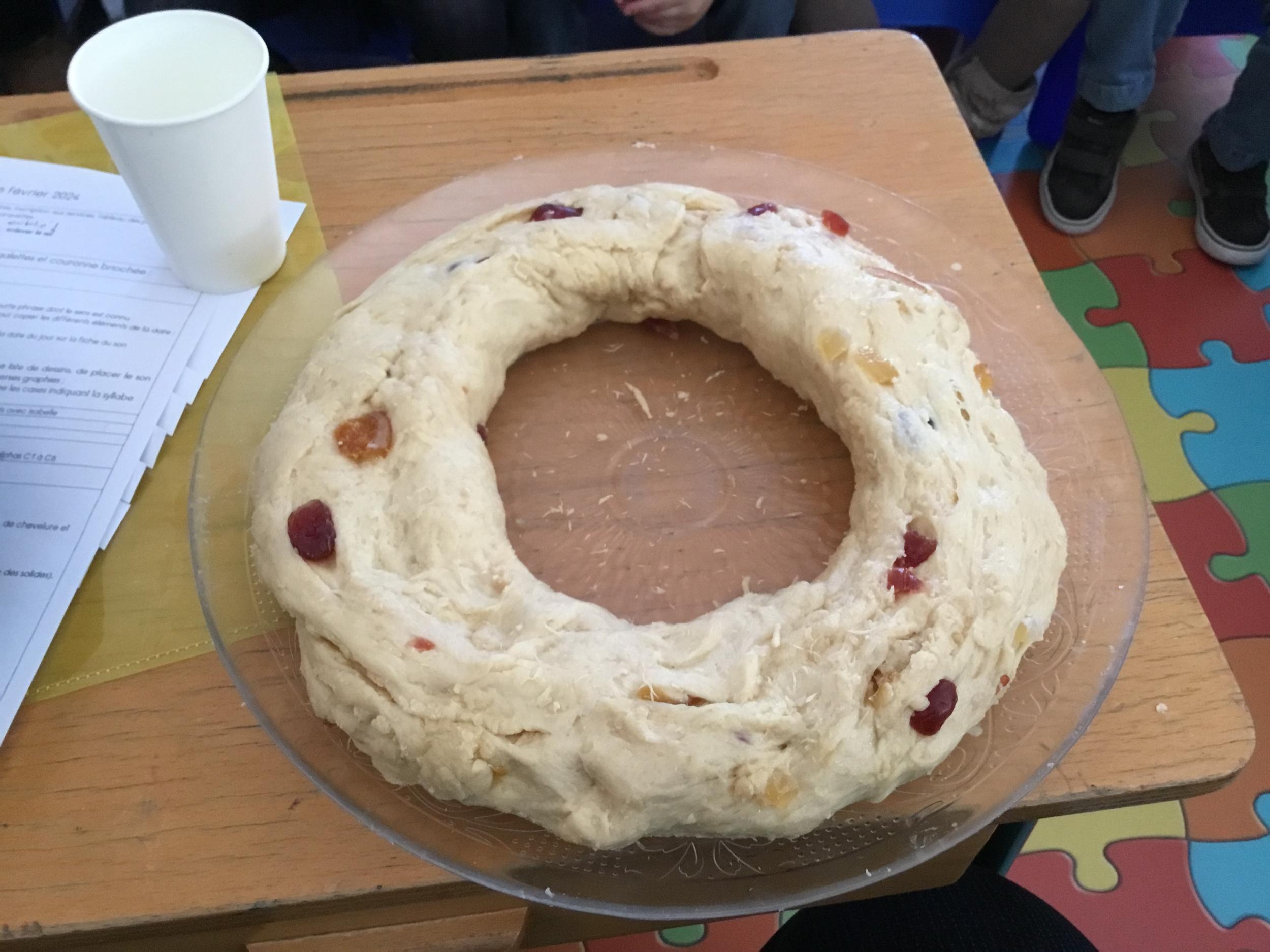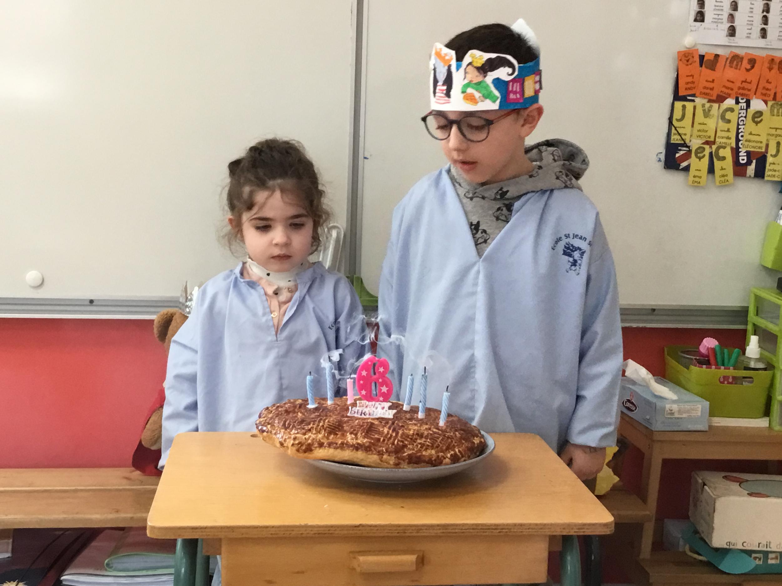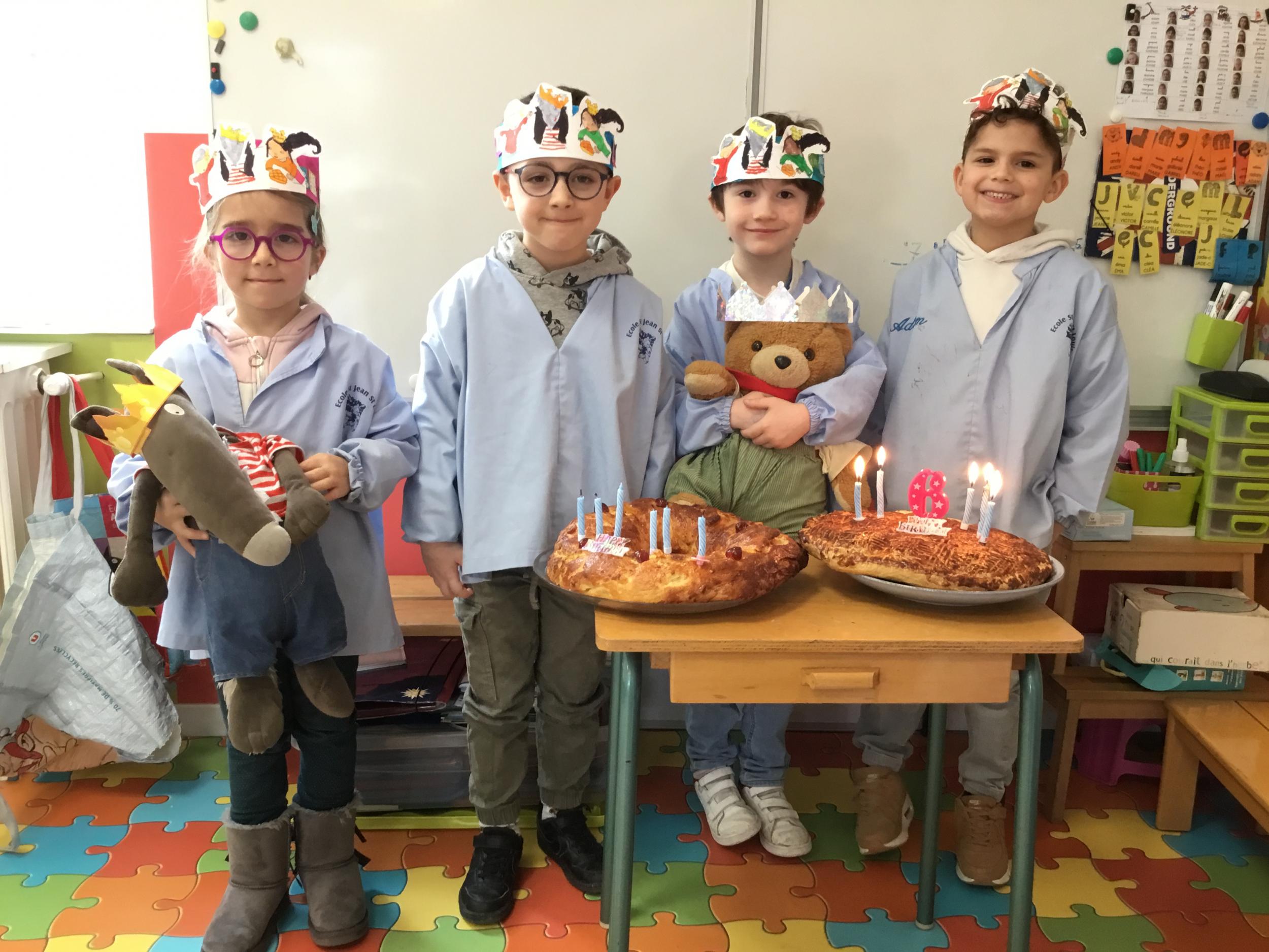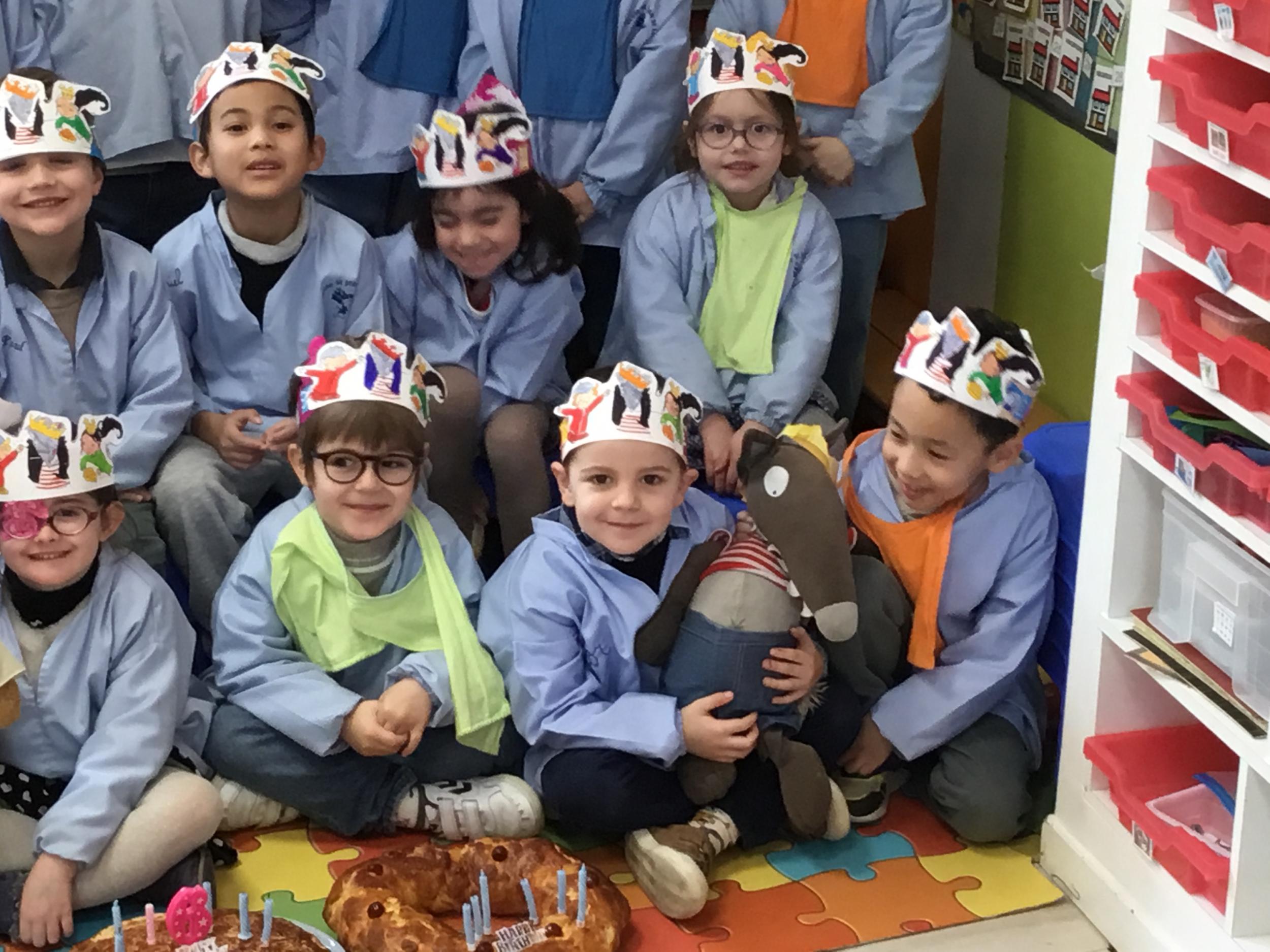 Nous avons travaillé sur un album de galette "la galette du roi loup". Les élèves ont inventé et dessiné plusieurs fins de cette histoire. Ils ont aussi réalisé une couronne en utilisant diverses techniques : choisir un gabarit de couronne, tracer les contours et la découper précisément. La peindre à l'encre et au gros sel : en l'enlevant après séchage, le sel a laissé divers motifs.