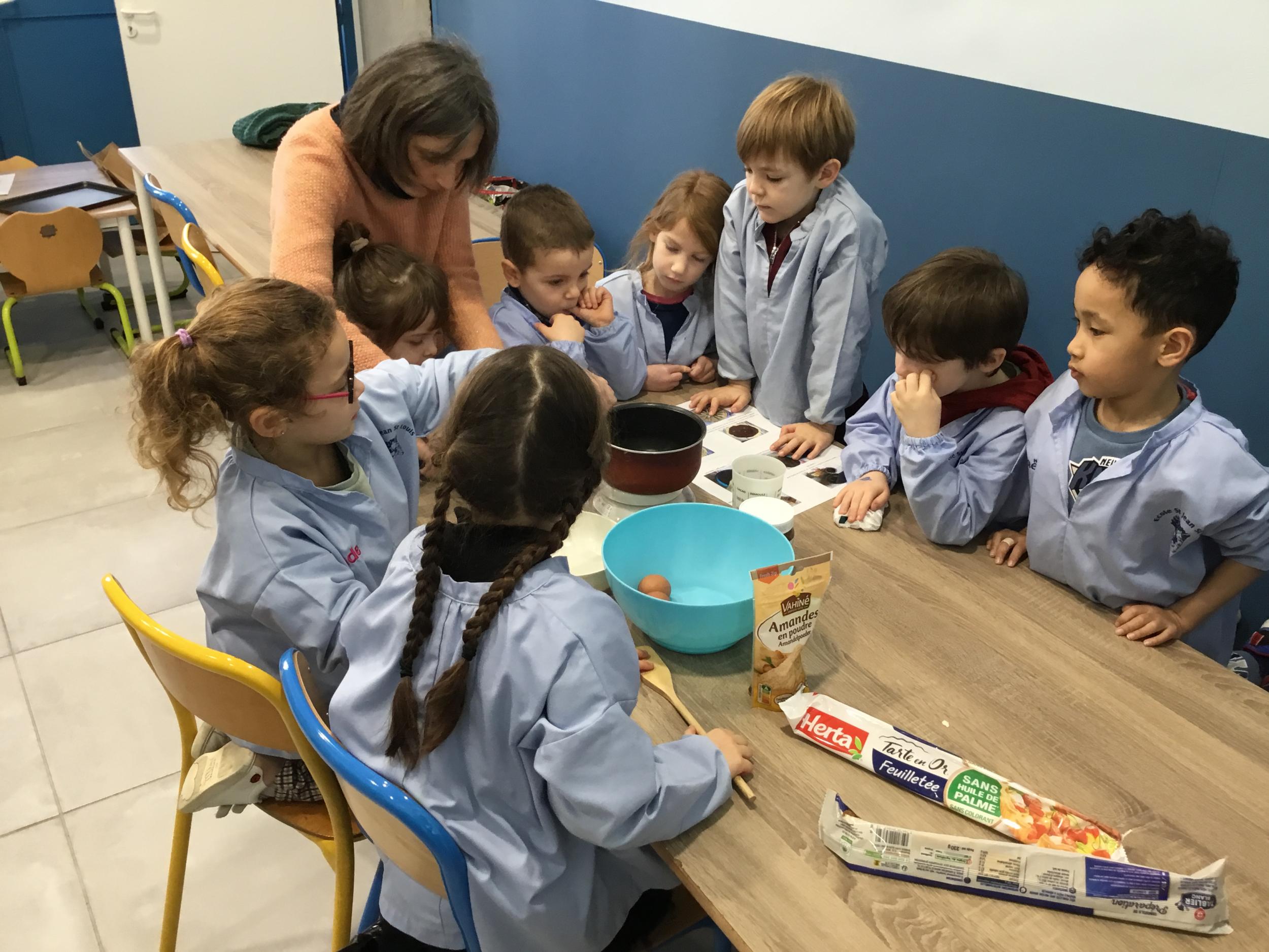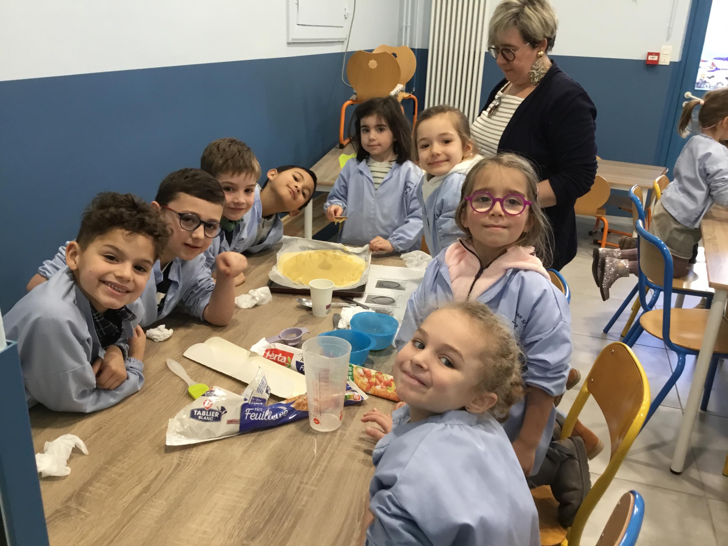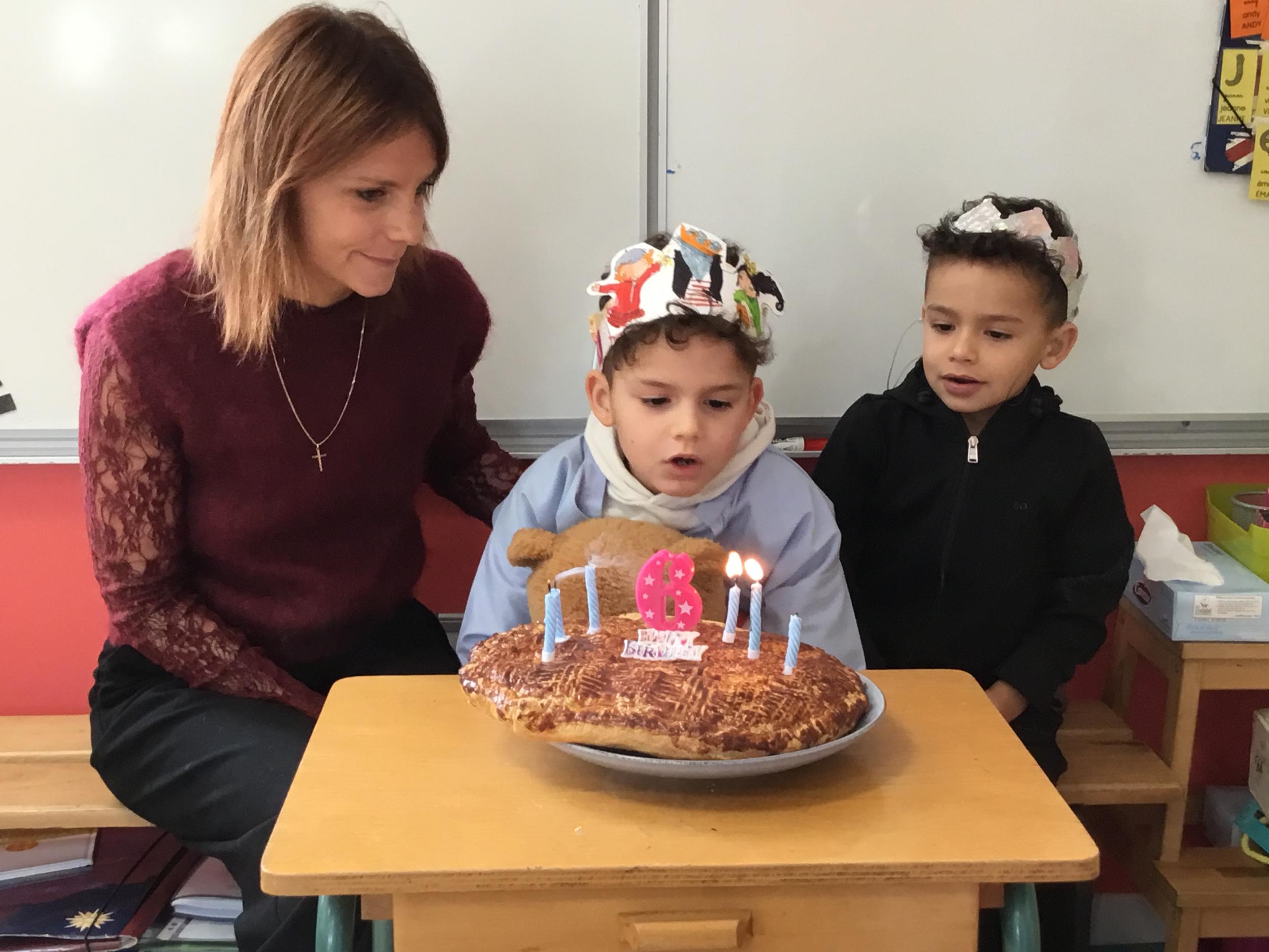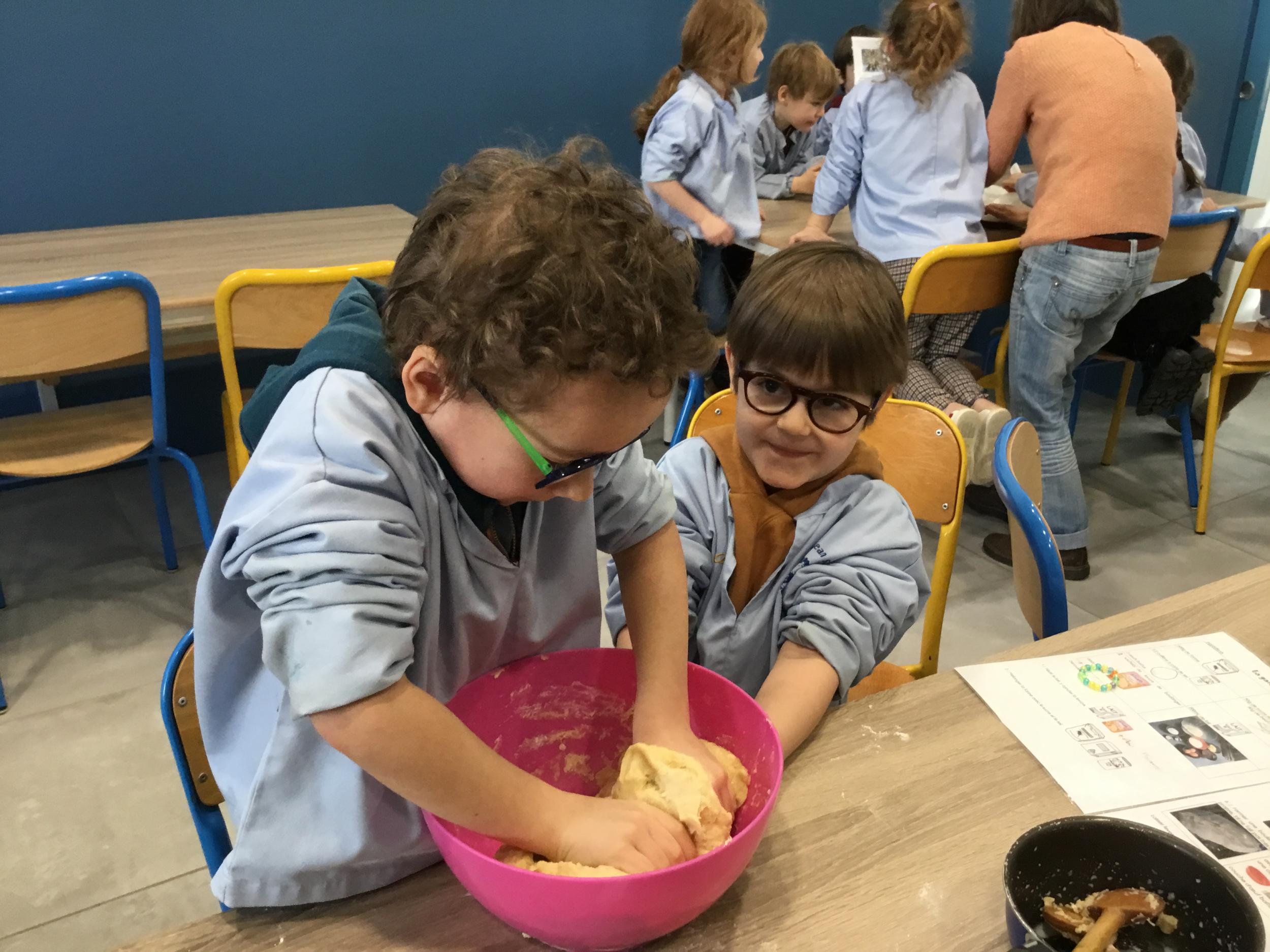 Nous avons travaillé sur un album de galette "la galette du roi loup". Les élèves ont inventé et dessiné plusieurs fins de cette histoire. Ils ont aussi réalisé une couronne en utilisant diverses techniques : choisir un gabarit de couronne, tracer les contours et la découper précisément. La peindre à l'encre et au gros sel : en l'enlevant après séchage, le sel a laissé divers motifs.
