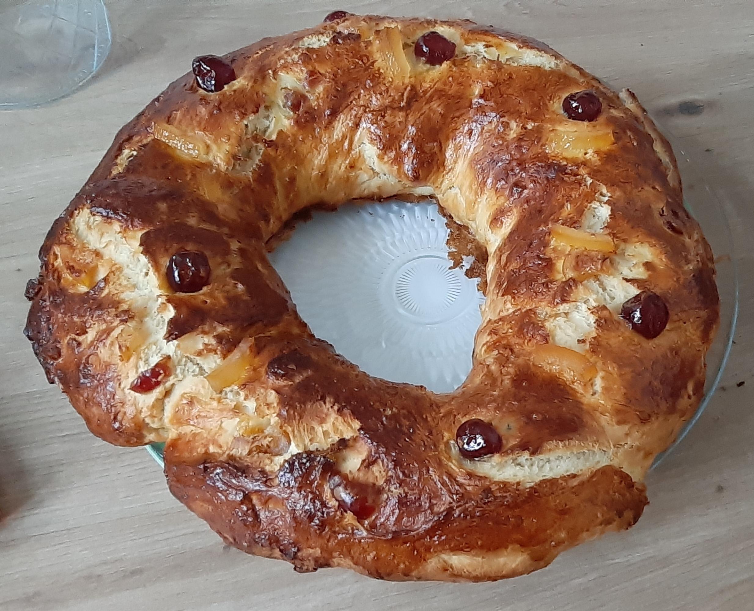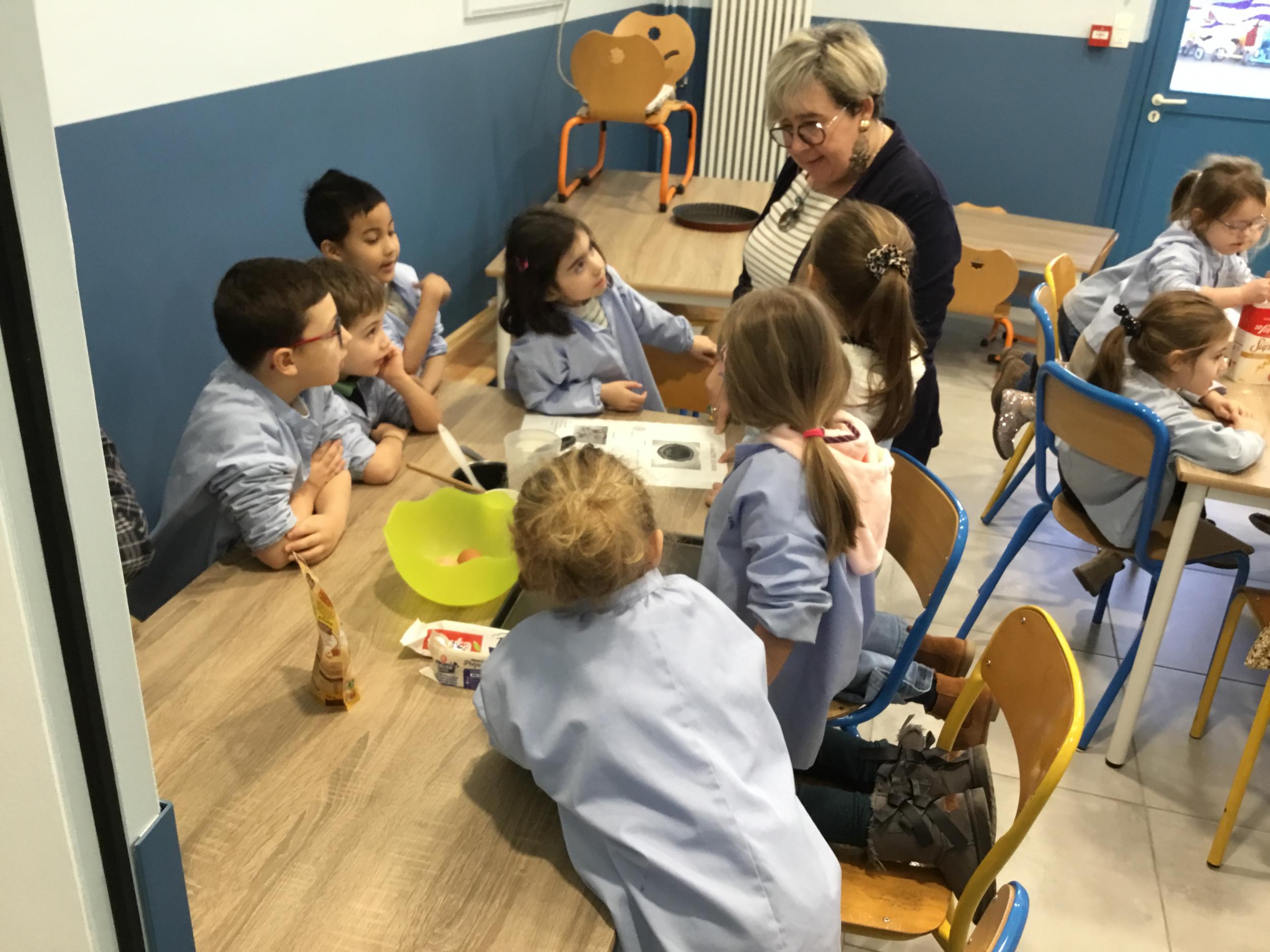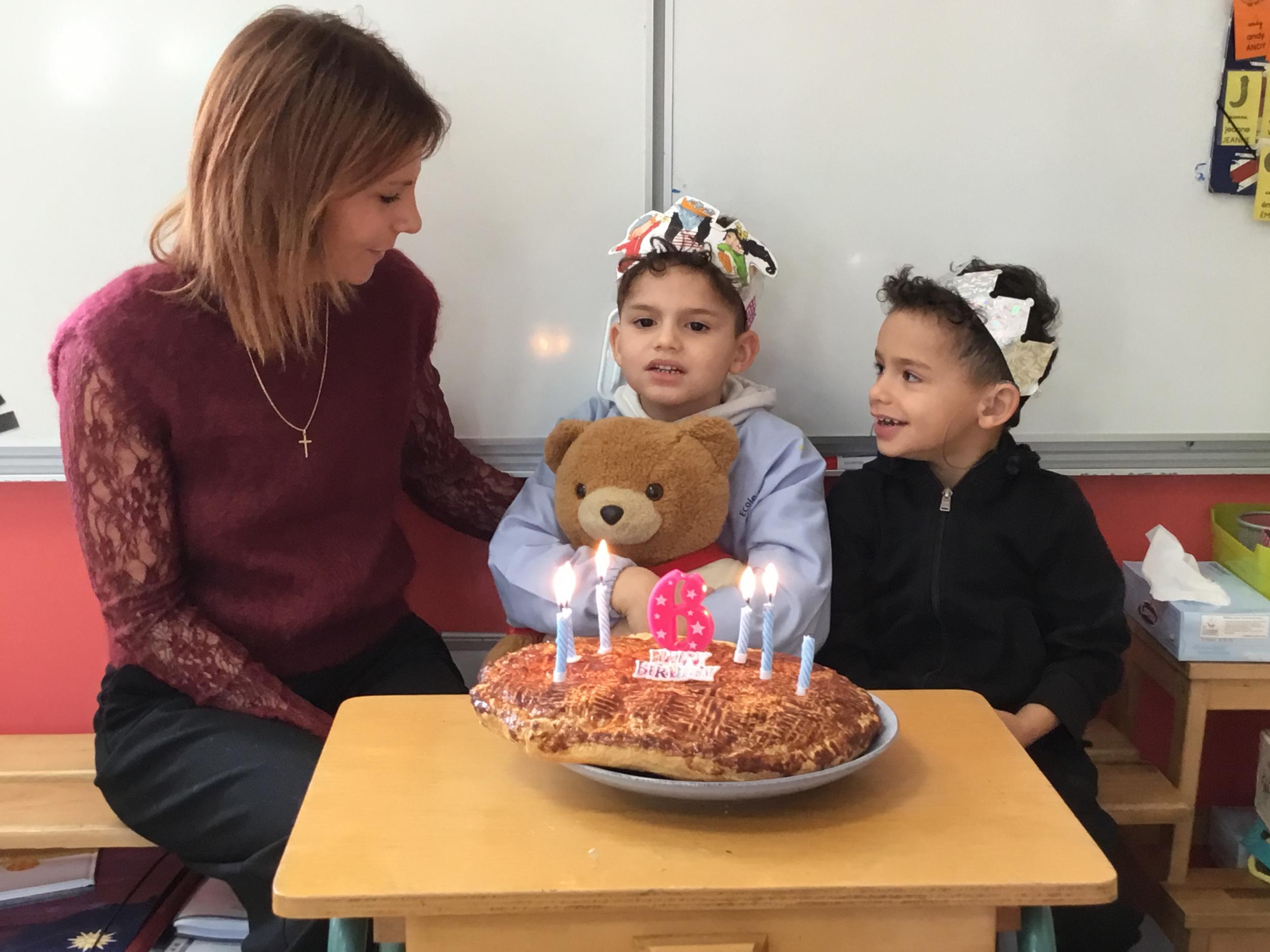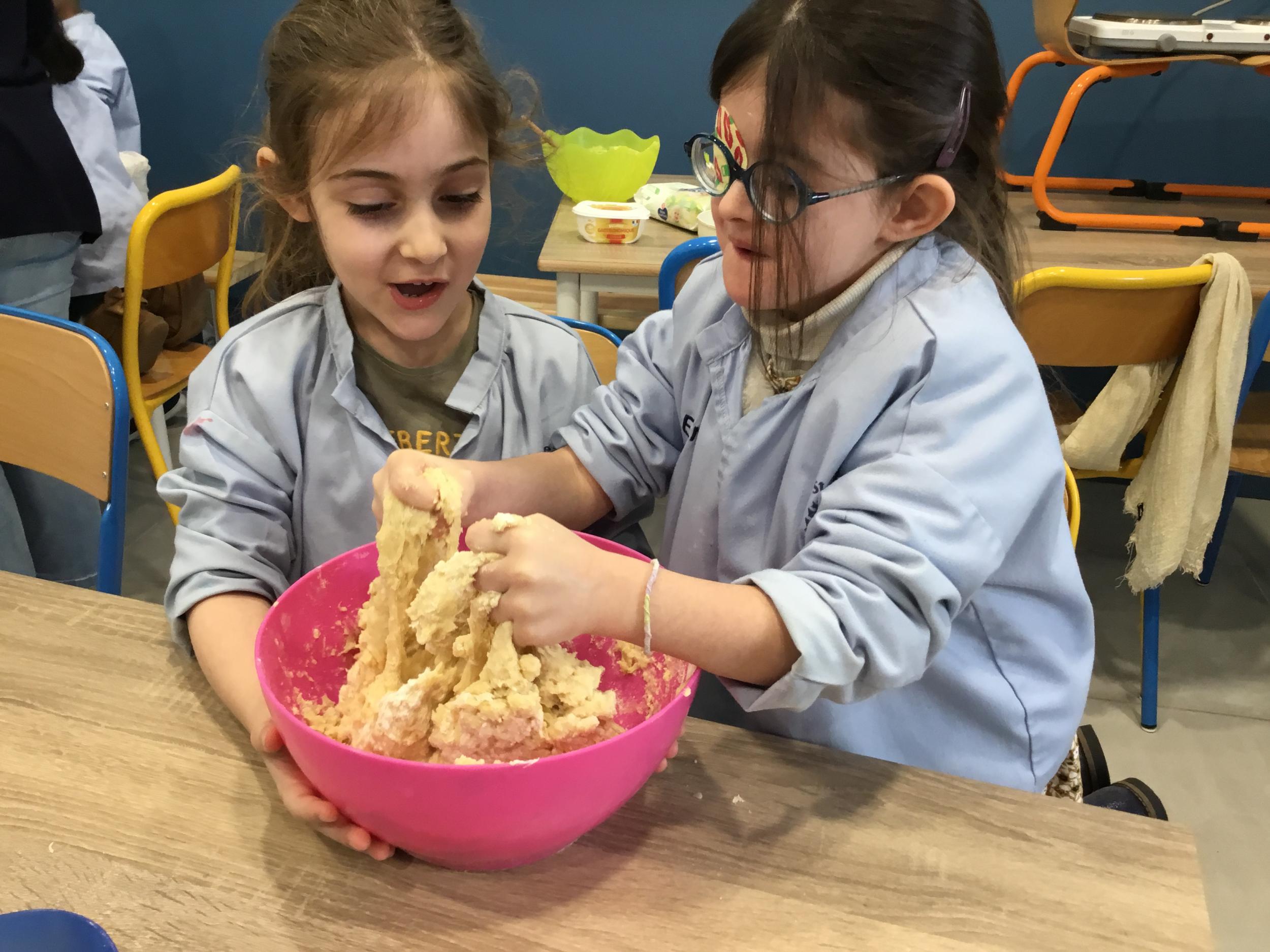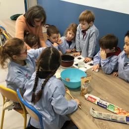 Nous avons travaillé sur un album de galette "la galette du roi loup". Les élèves ont inventé et dessiné plusieurs fins de cette histoire. Ils ont aussi réalisé une couronne en utilisant diverses techniques : choisir un gabarit de couronne, tracer les contours et la découper précisément. La peindre à l'encre et au gros sel : en l'enlevant après séchage, le sel a laissé divers motifs.
