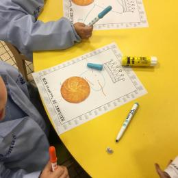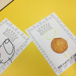 Ce mois-ci le bonhomme a un drôle de ventre en forme de galette et une bien jolie couronne. Ils ont d’abord dessiné une tête toute ronde sans oublier les yeux, la bouche, le nez et les oreilles pour certains élèves. Ensuite ils ont collé la galette et dessiné les bras et les jambes. Le résultat est magnifique.