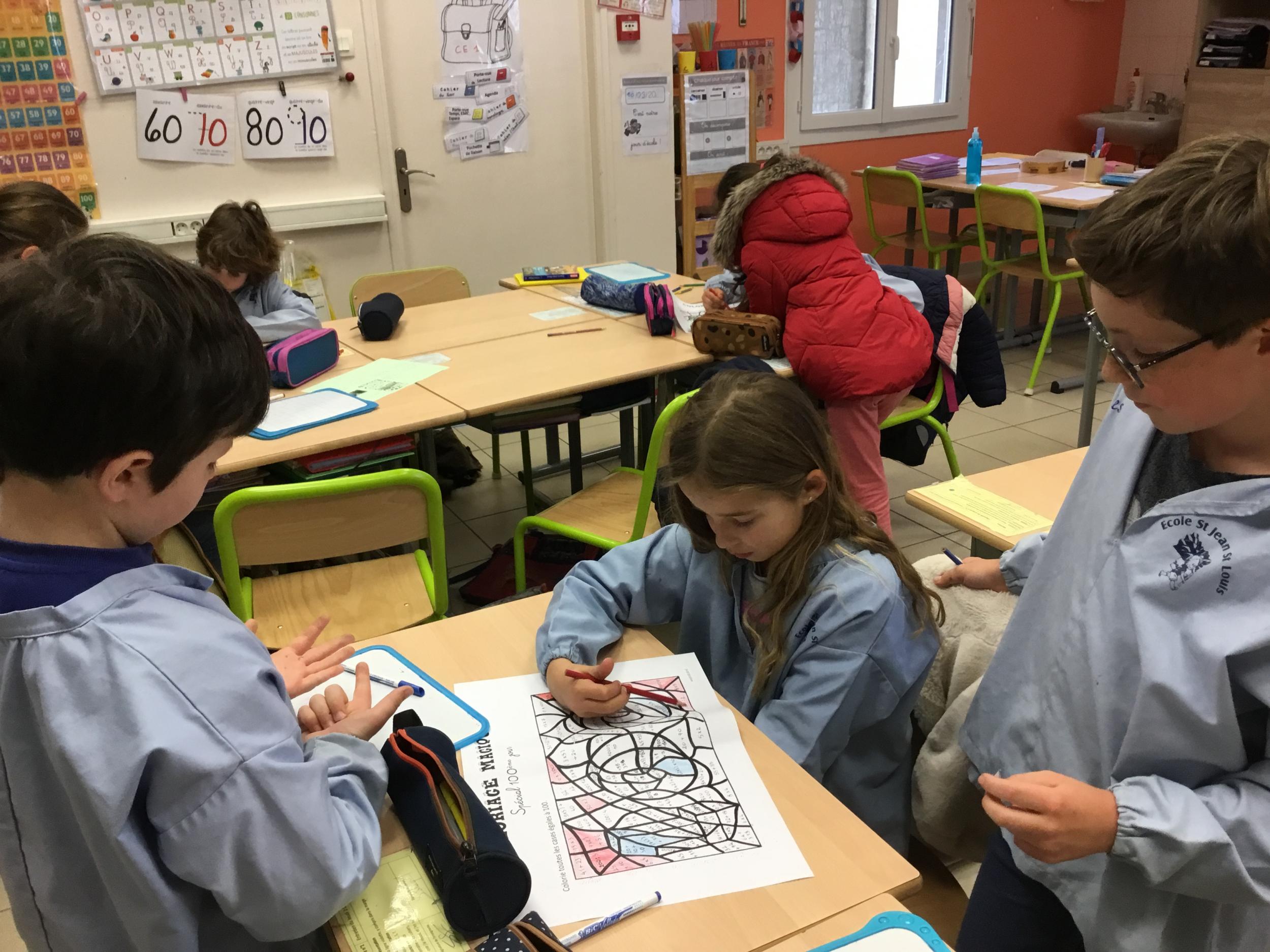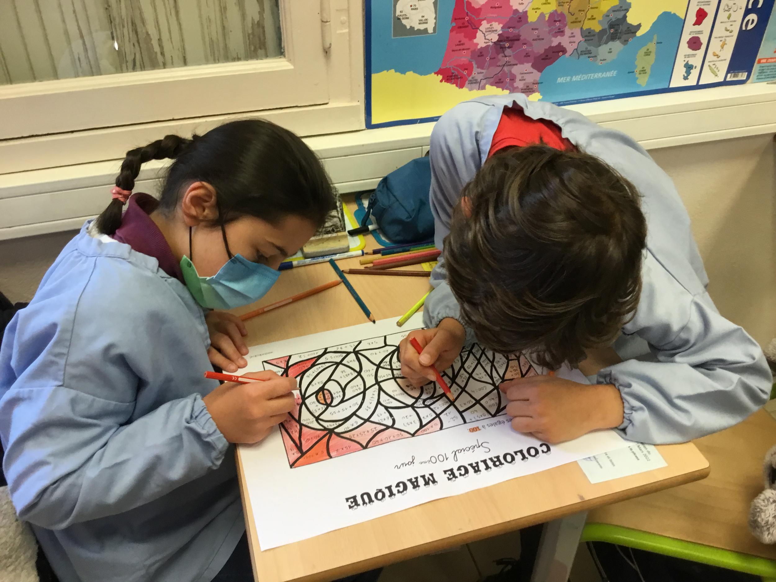 Enfin, par équipes mixtes (1 CE1 avec 2 CM1), ils ont collaboré pour faire un coloriage magique, composé de calculs faciles et de quelques divisions... pour les deux niveaux.