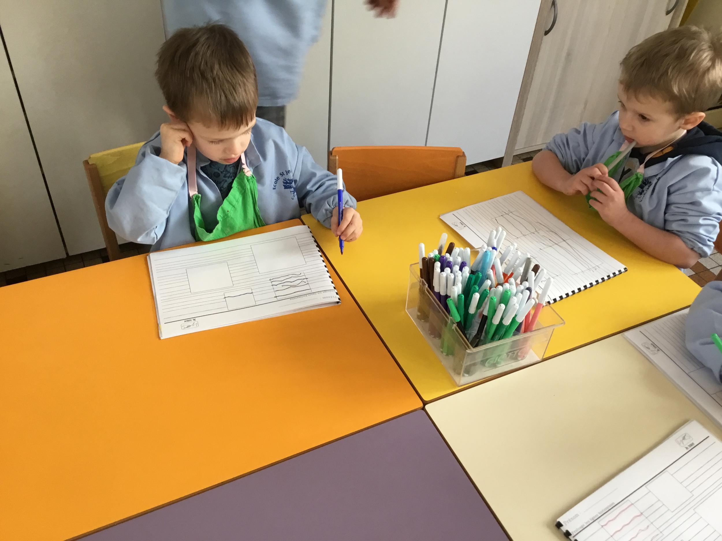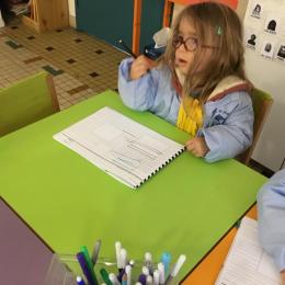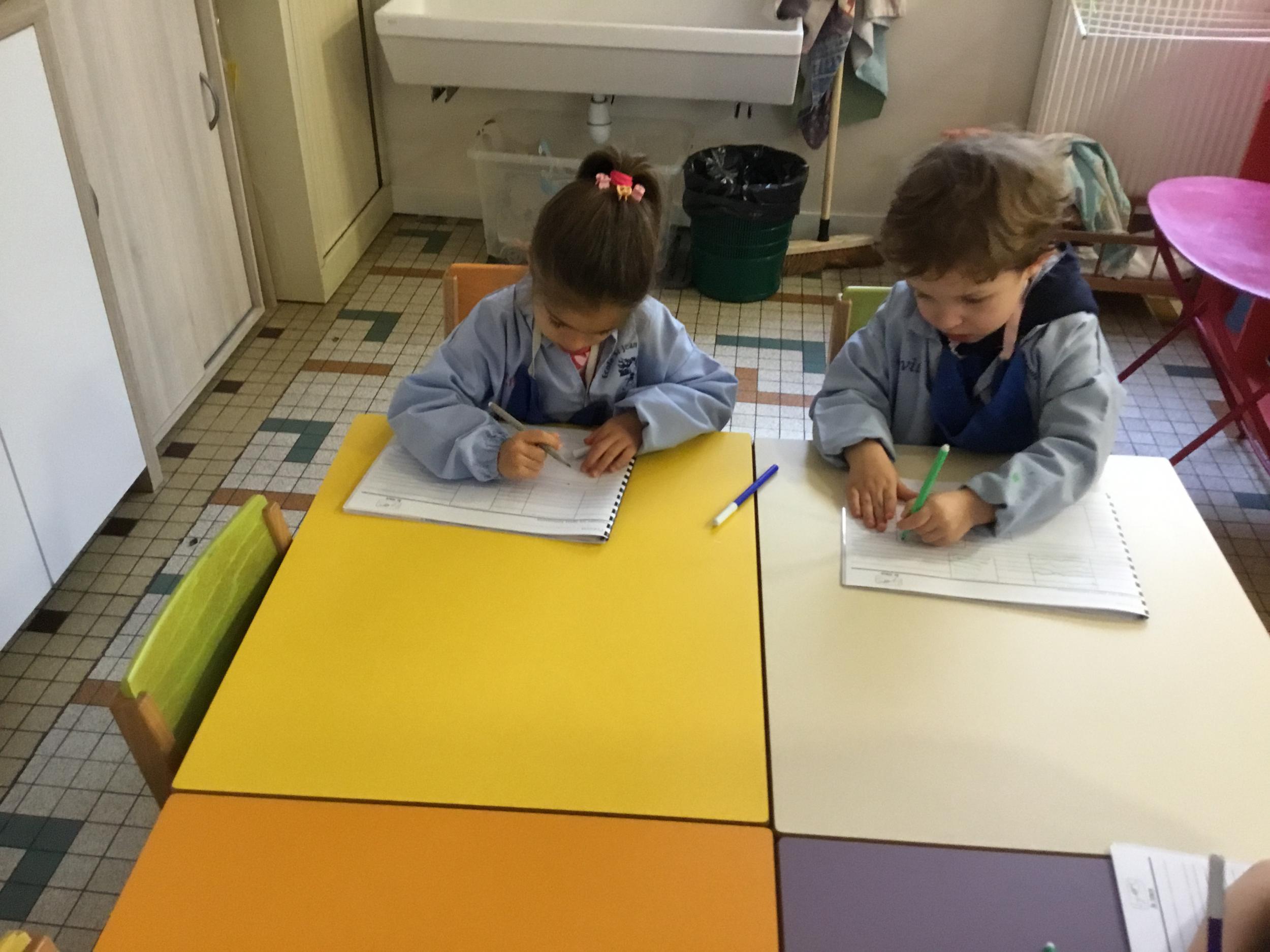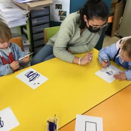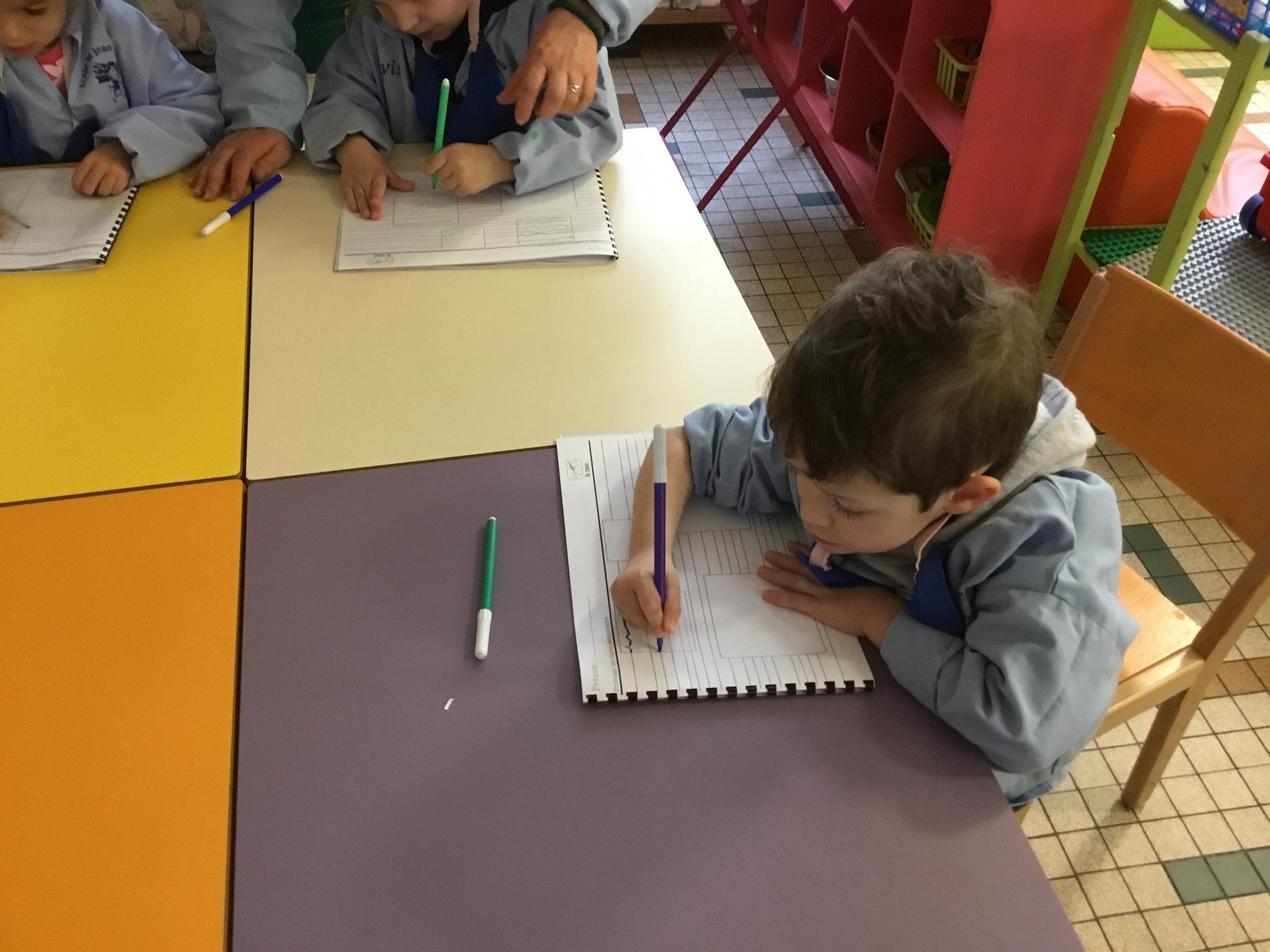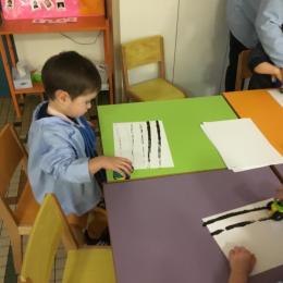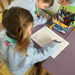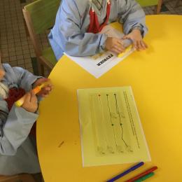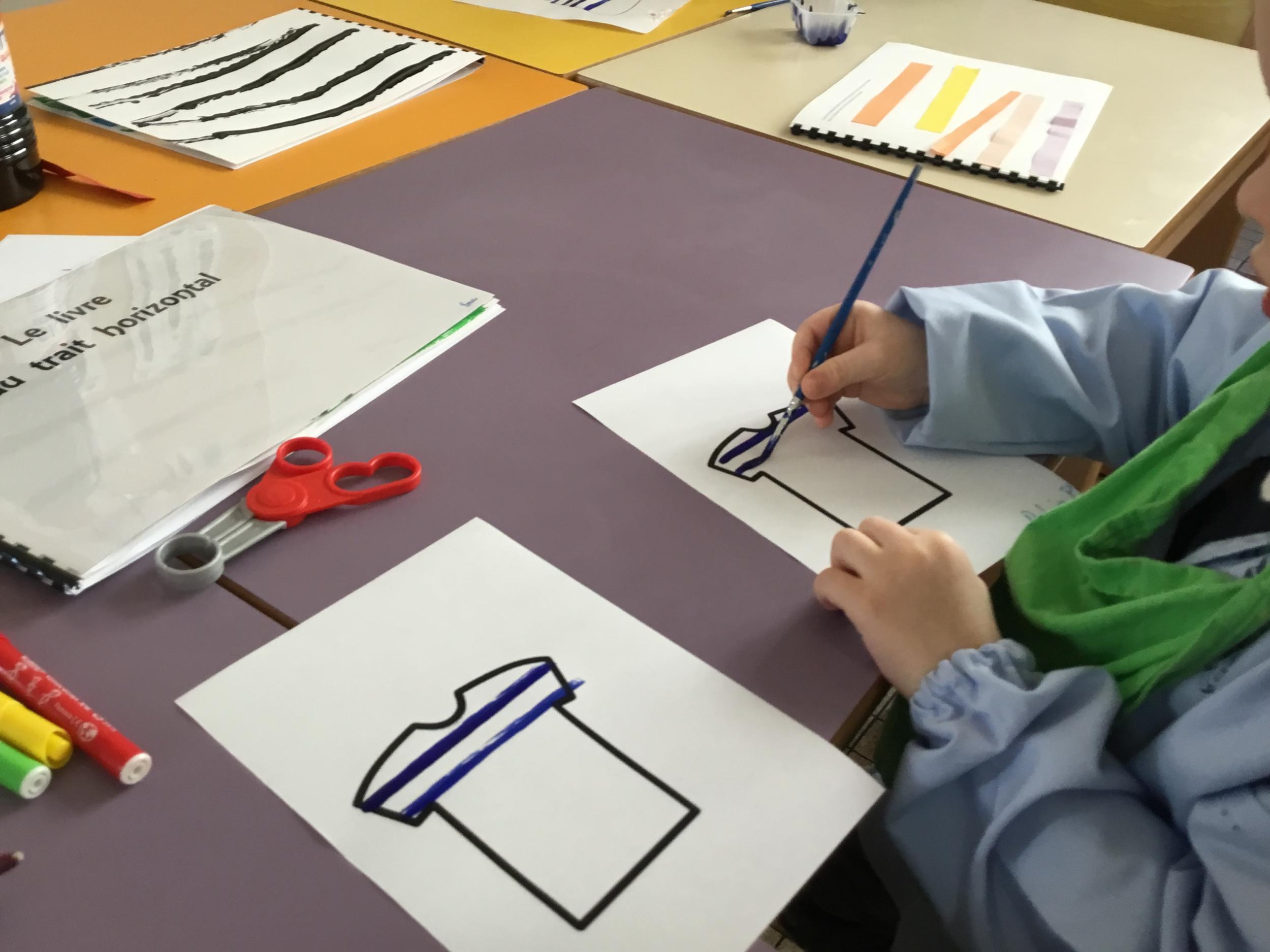 Après le trait vertical, les élèves ont travaillé autour du trait horizontal. Ces séances leur ont permis d’appréhender le sens de l’écrit de la gauche vers la droite et de maîtriser leur geste.