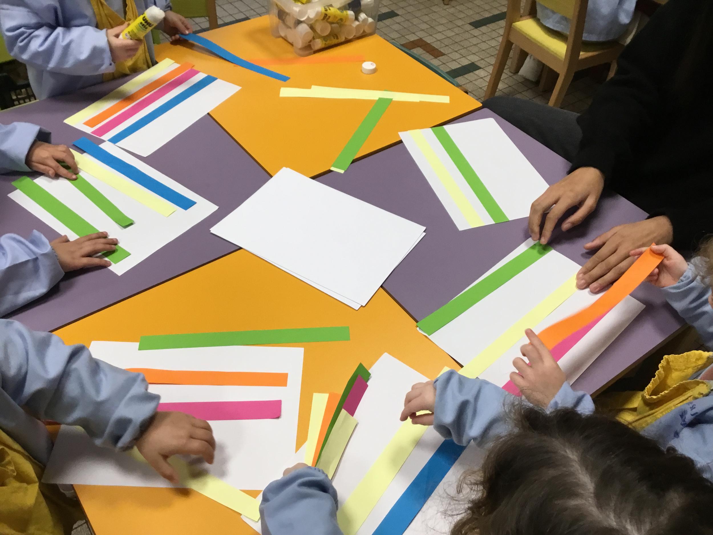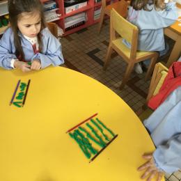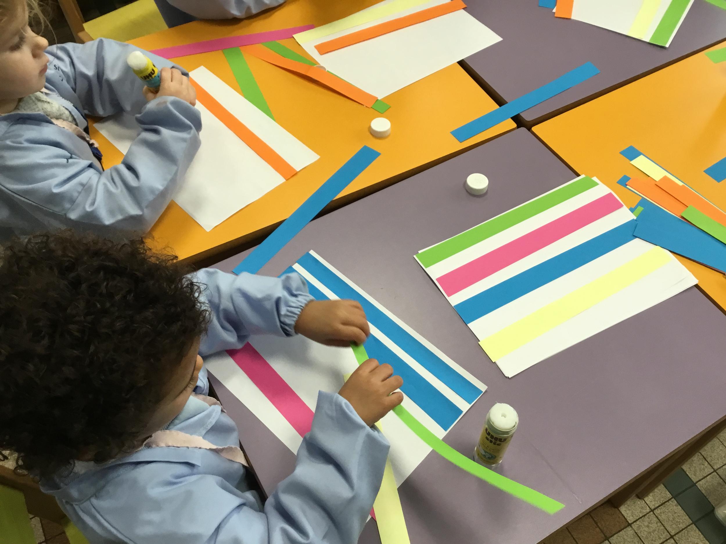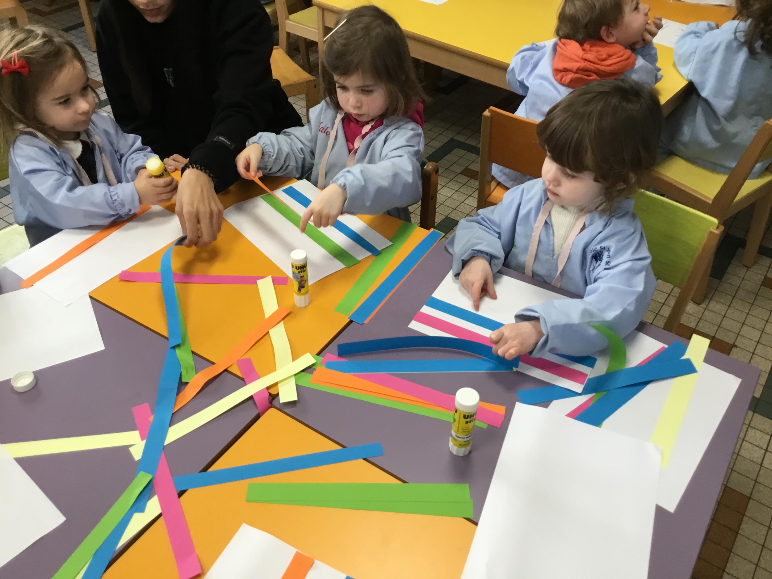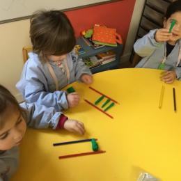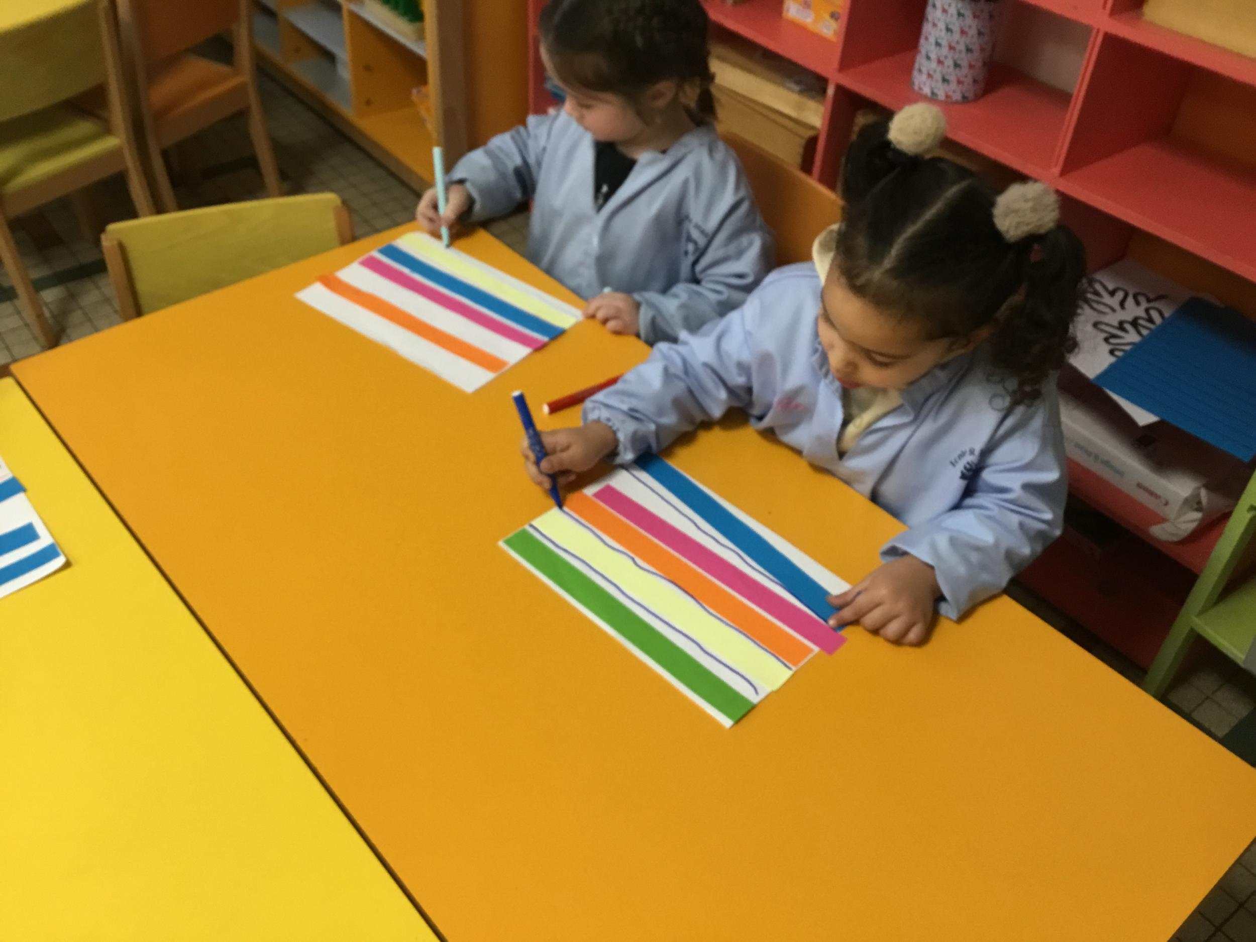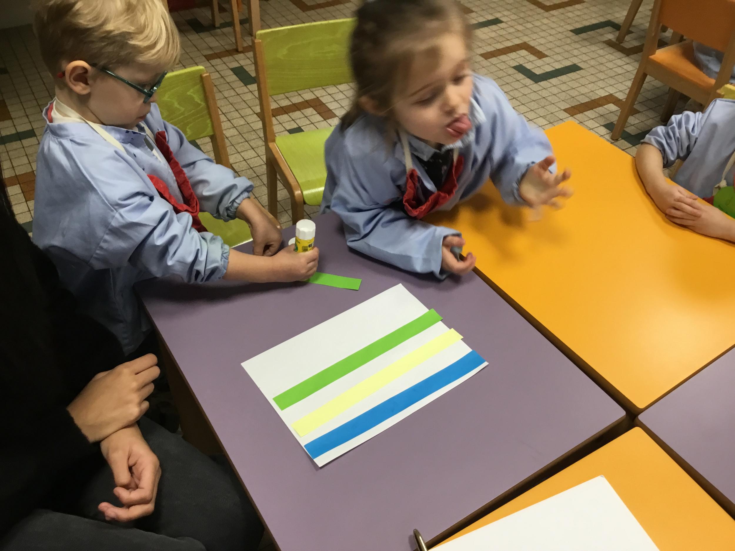 Petite et moyenne section 01/02/2026 Laisser une trace horizontale Coller des bandes papier dans le sens horizontal et tracer un trait horizontal entre chaque bande Modeler des boudins et les ranger de manière horizontale Ranger des objets du plus petit au plus grand Bravo à Victoria et Louna