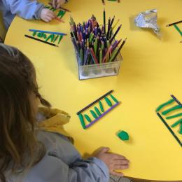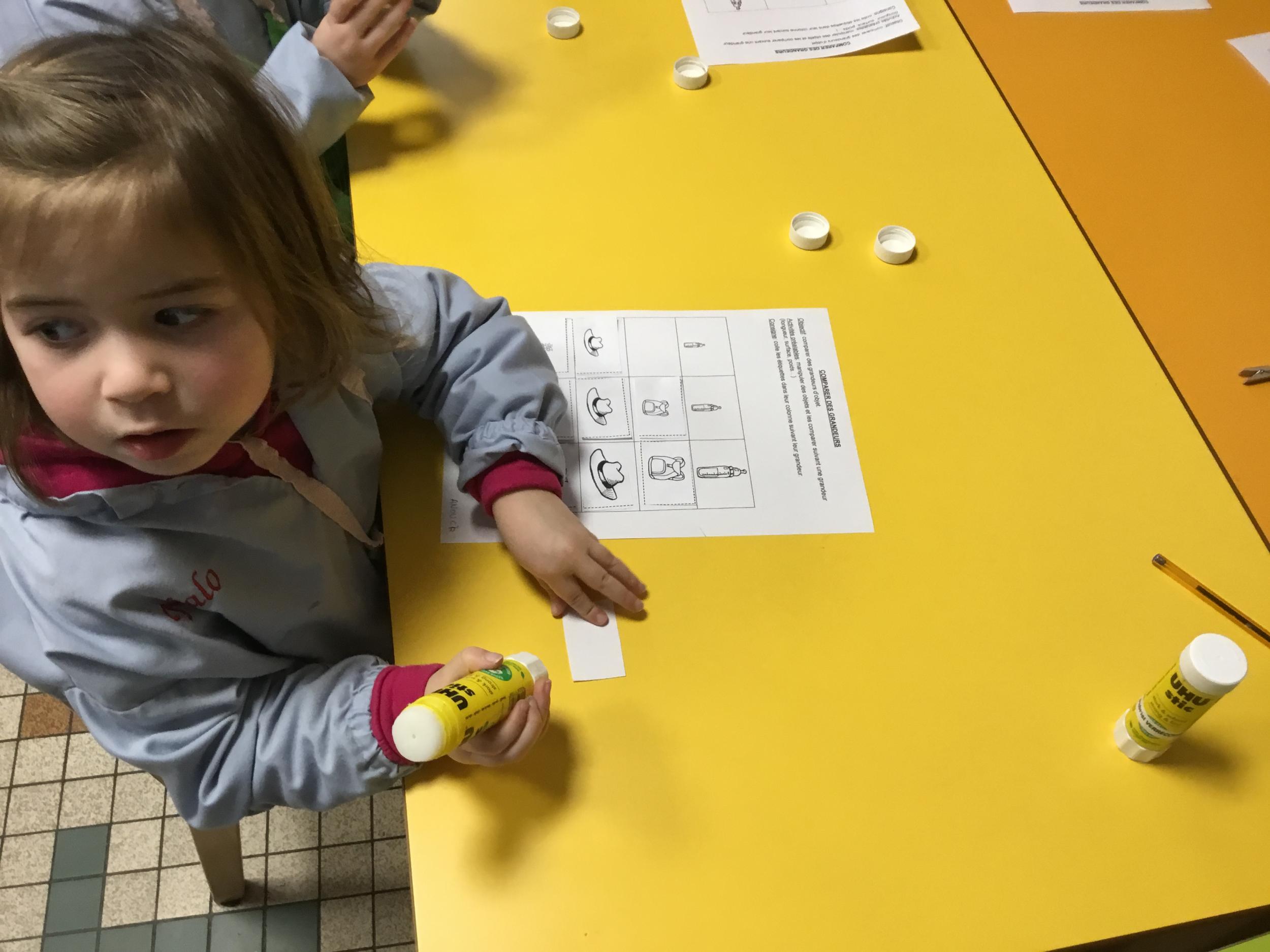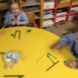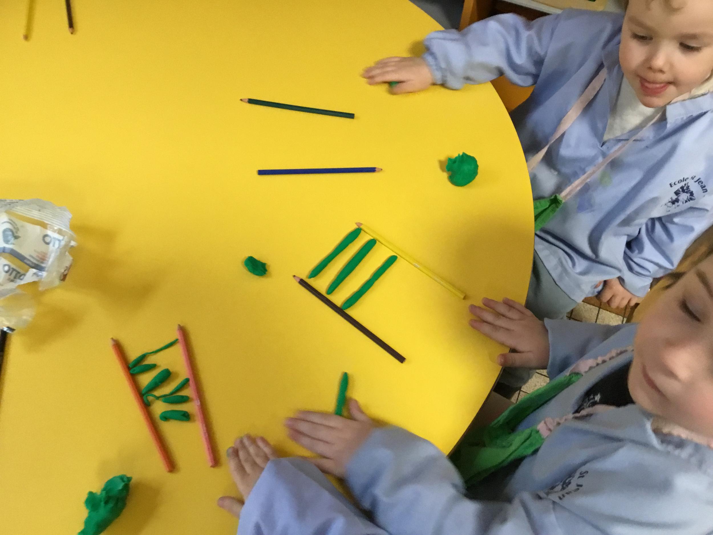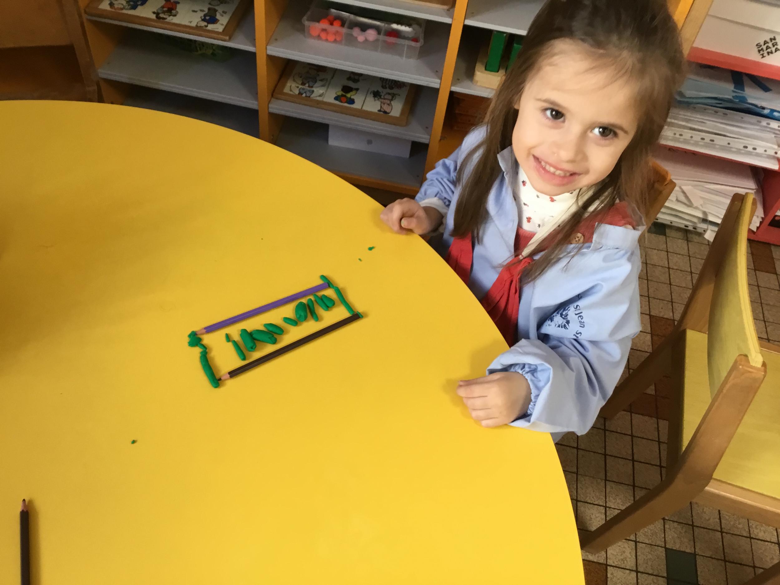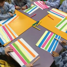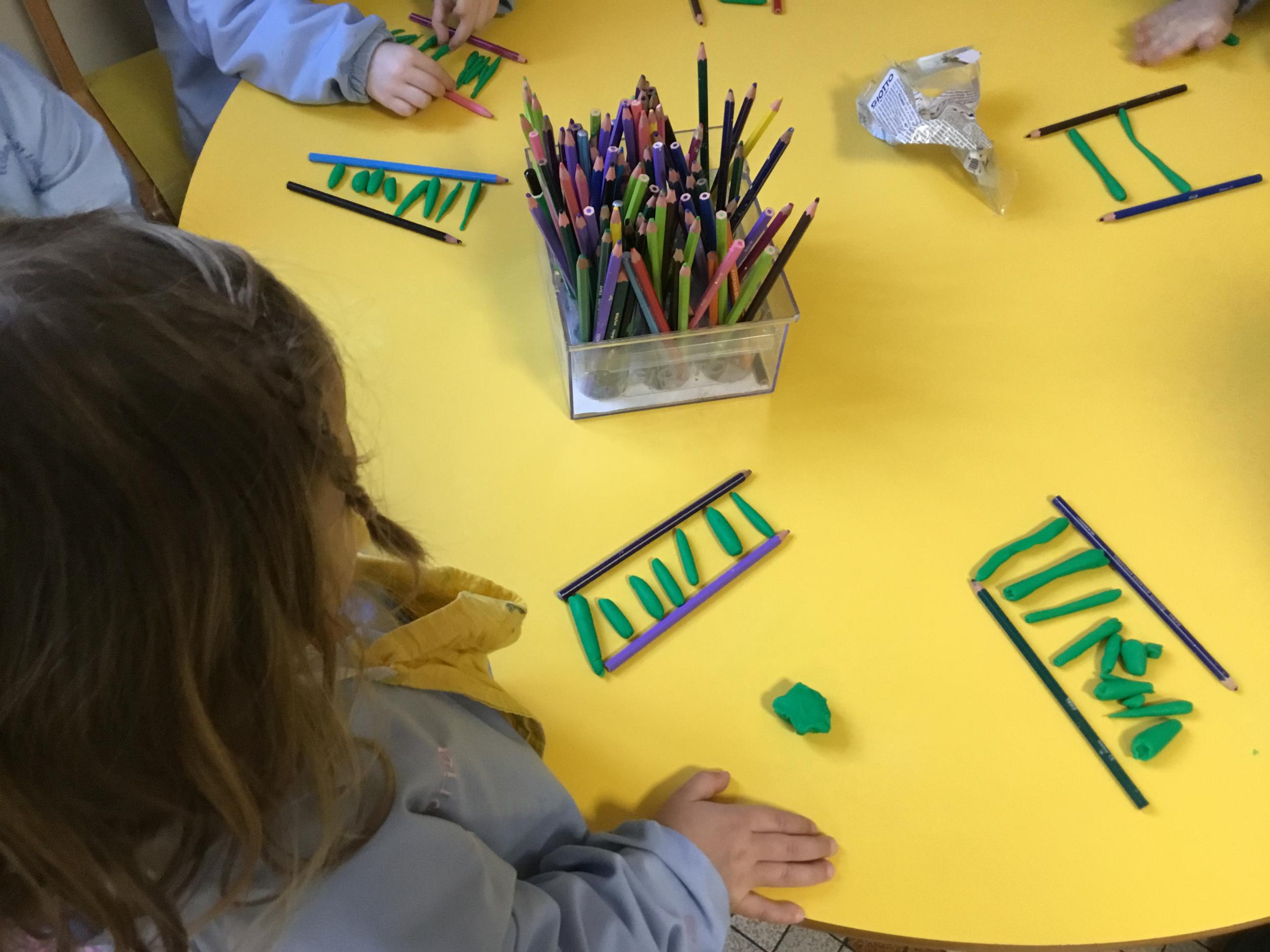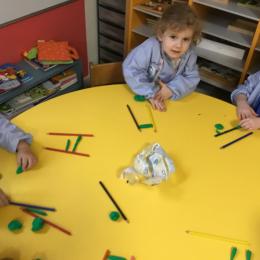 Petite et moyenne section 01/02/2026 Laisser une trace horizontale Coller des bandes papier dans le sens horizontal et tracer un trait horizontal entre chaque bande Modeler des boudins et les ranger de manière horizontale Ranger des objets du plus petit au plus grand Bravo à Victoria et Louna