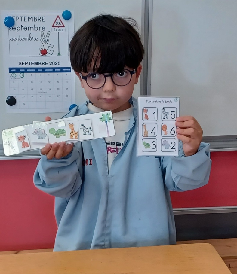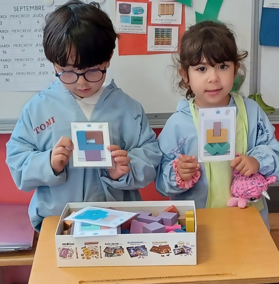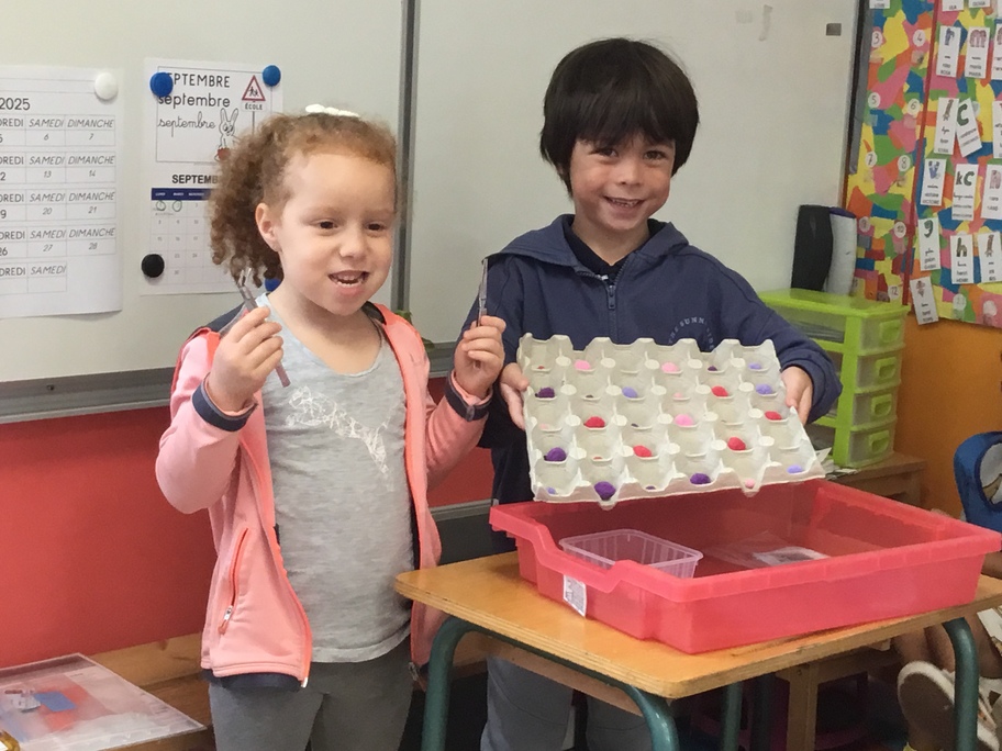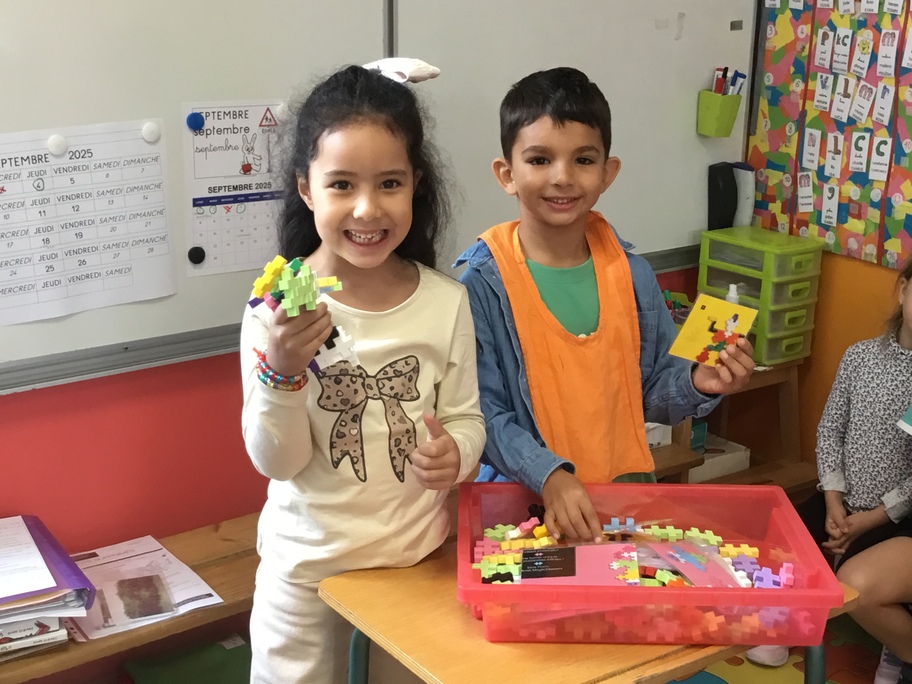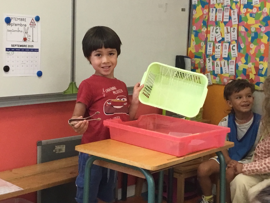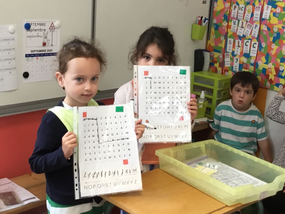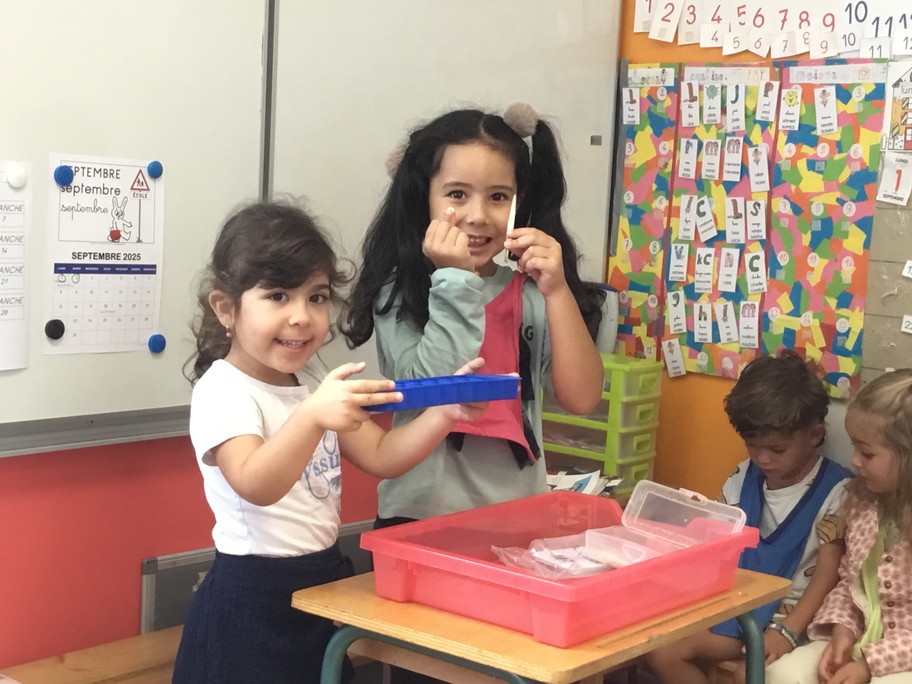 Les élèves ont découvert ces premiers jours les différents ateliers barquettes de type Montessori qu'il y a dans la classe. Nous considérons que les enfants apprennent plus facilement de façon ludique. C'est pour cette raison qu'ils disposent de nombreux ateliers regroupant les différents domaines d'apprentissages. Le matin, plus d'une heure sera consacrée à ces jeux. Les élèves disposeront d'un plan de travail pour se repérer : une grande feuille sur laquelle tous les jeux sont représentés. Ainsi, ils choisissent celui qu'ils ont envie de faire, s'entrainent, puis nous montrent et nous expliquent ce qu'ils ont fait. Si l'on considère l'apprentissage sous-jacent à l'activité suffisamment acquis, les élèves reçoivent un brevet qu'ils vont coller dans leur cahier des brevets. Ce cahier se présente sous la forme d'un répertoire avec un code couleur selon le domaine travaillé : jaune pour tout ce qui touche à la langue orale et le graphisme, blanc pour la découverte du monde, des objets et du vivant, vert pour la construction des nombres, bleu pour le travail dans l'espace et le temps, orange pour l'art visuel, rose pour les activités motrices.