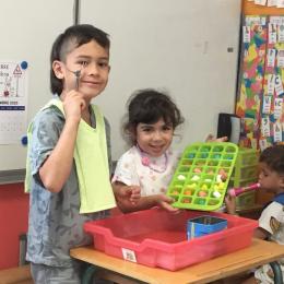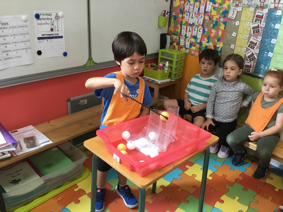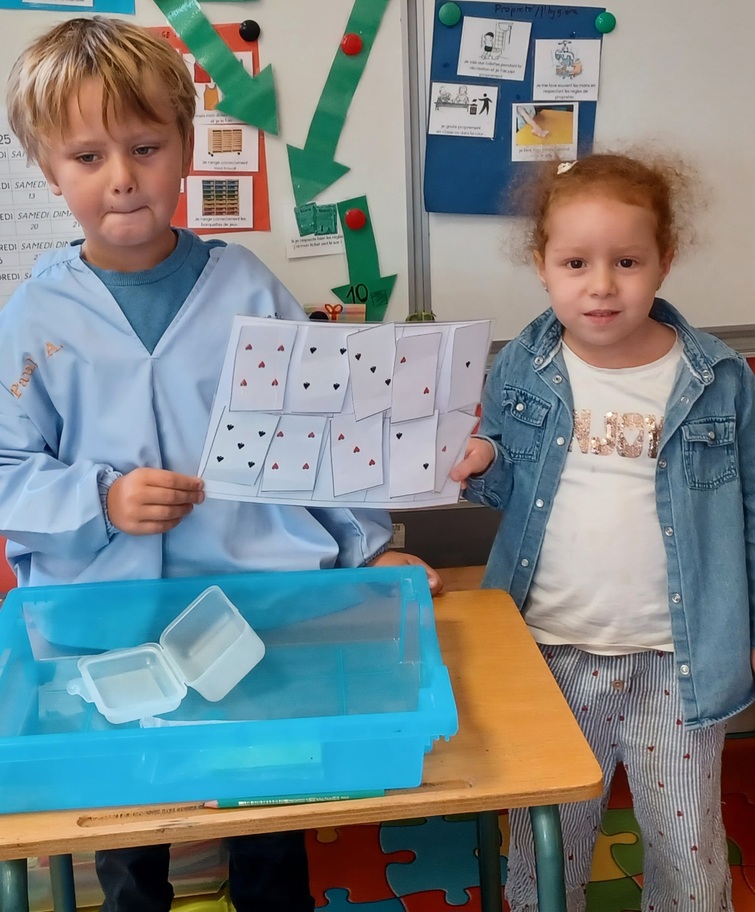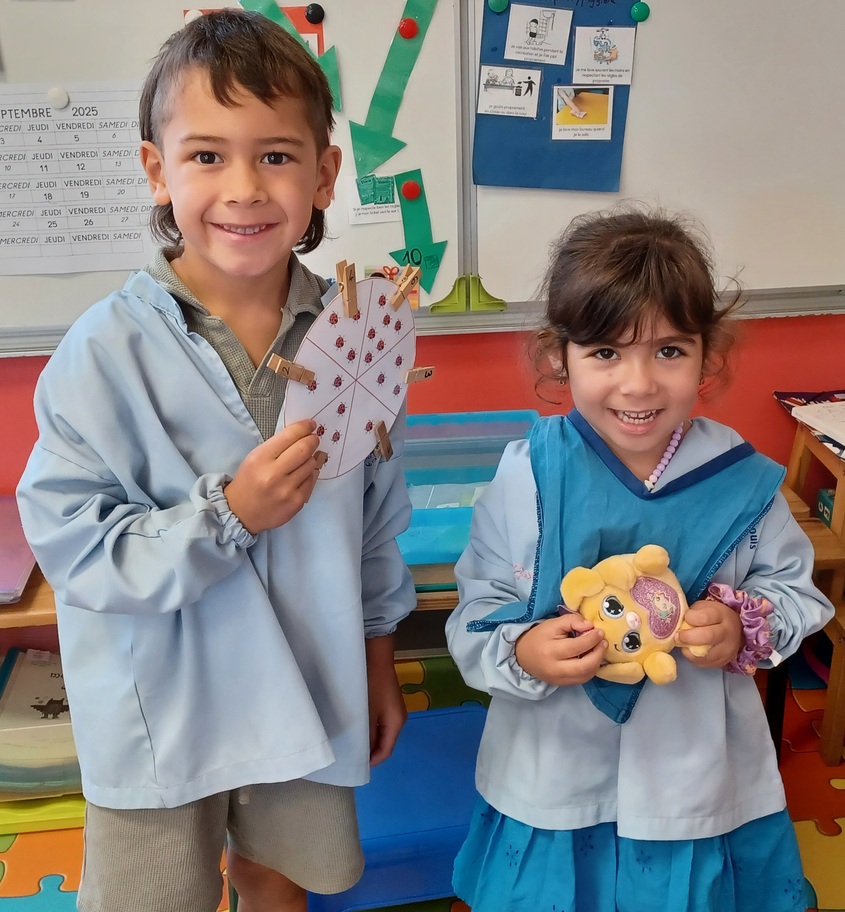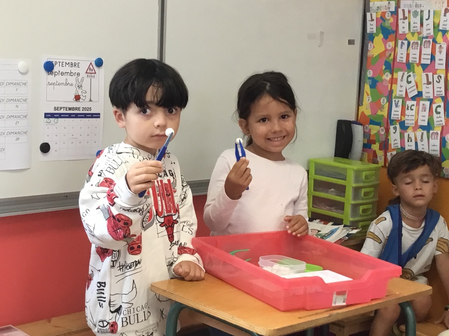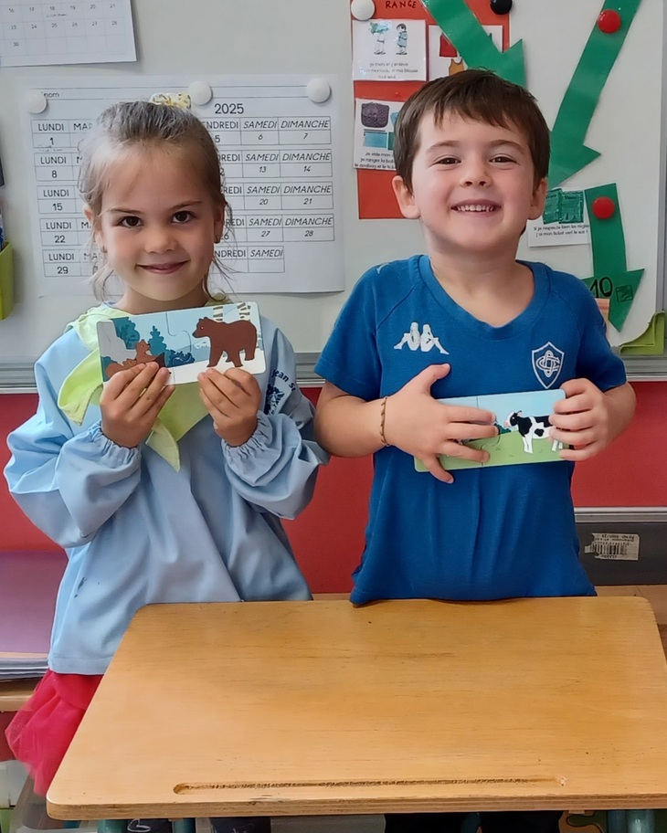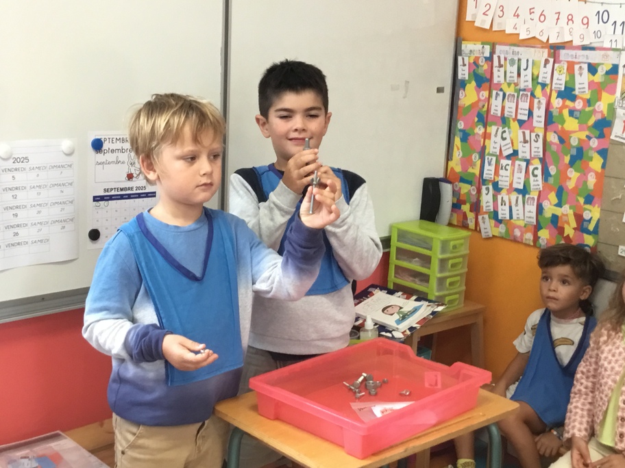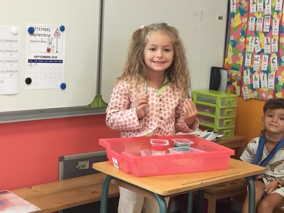 Les élèves ont découvert ces premiers jours les différents ateliers barquettes de type Montessori qu'il y a dans la classe. Nous considérons que les enfants apprennent plus facilement de façon ludique. C'est pour cette raison qu'ils disposent de nombreux ateliers regroupant les différents domaines d'apprentissages. Le matin, plus d'une heure sera consacrée à ces jeux. Les élèves disposeront d'un plan de travail pour se repérer : une grande feuille sur laquelle tous les jeux sont représentés. Ainsi, ils choisissent celui qu'ils ont envie de faire, s'entrainent, puis nous montrent et nous expliquent ce qu'ils ont fait. Si l'on considère l'apprentissage sous-jacent à l'activité suffisamment acquis, les élèves reçoivent un brevet qu'ils vont coller dans leur cahier des brevets. Ce cahier se présente sous la forme d'un répertoire avec un code couleur selon le domaine travaillé : jaune pour tout ce qui touche à la langue orale et le graphisme, blanc pour la découverte du monde, des objets et du vivant, vert pour la construction des nombres, bleu pour le travail dans l'espace et le temps, orange pour l'art visuel, rose pour les activités motrices.