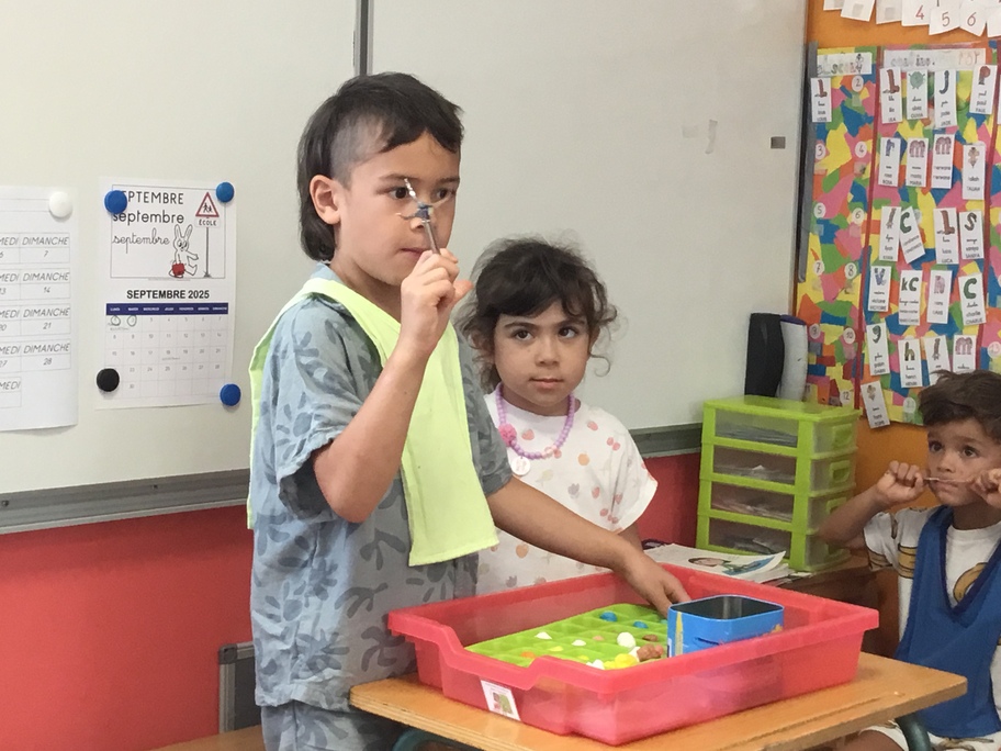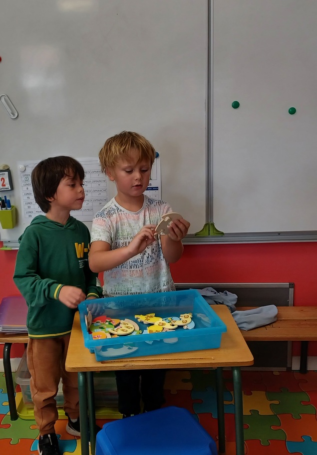 Les Moyennes sections disposent de leur propre plan de travail. En effet, un espace est réservé aux jeux qui leurs sont proposés. En ce début d'année, ils pourront aussi utiliser quelques jeux de manipulation des Grandes Sections, car ce sont des jeux avec des pinces pour muscler les doigts et apprendre à mieux tenir son crayon pour écrire, dessiner...