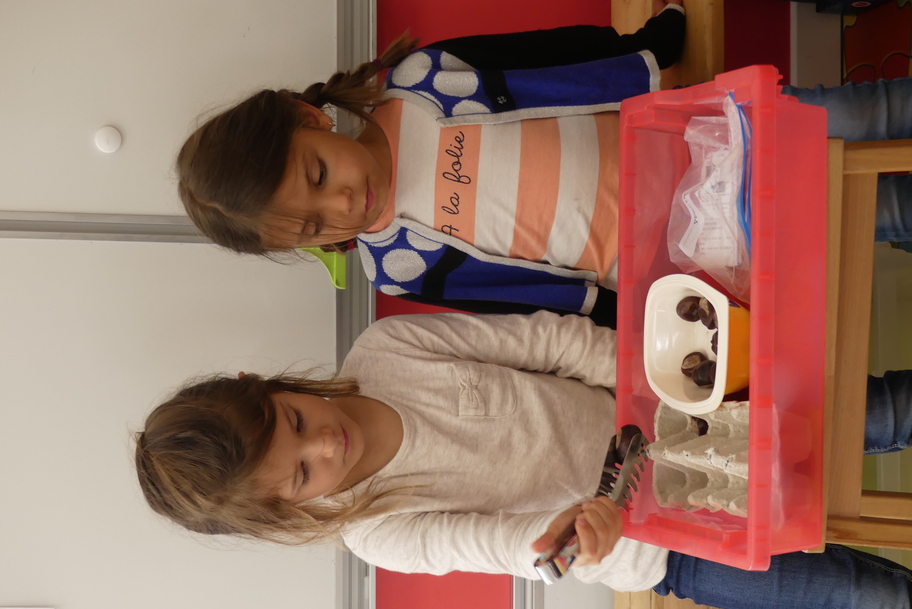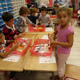 Nous avons commencé par les ateliers de découverte du monde de la matière et du vivant, avec beaucoup de jeux utilisant des pinces très diverses pour attraper des objets très différents. Ces manipulations aident à muscler la main et participent ainsi à une meilleure tenue du crayon pour l'écriture.