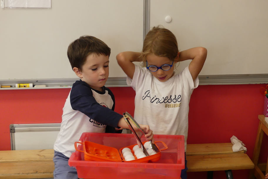 Depuis la rentré, les élèves découvrent les divers ateliers barquettes de style Montessori. Ils recherchent à deux l'utilisation du matériel puis le présentent à la classe et expliquent ce qu'ils ont compris.