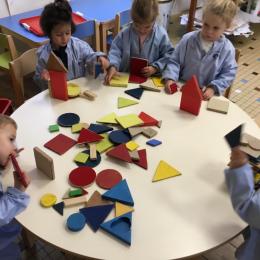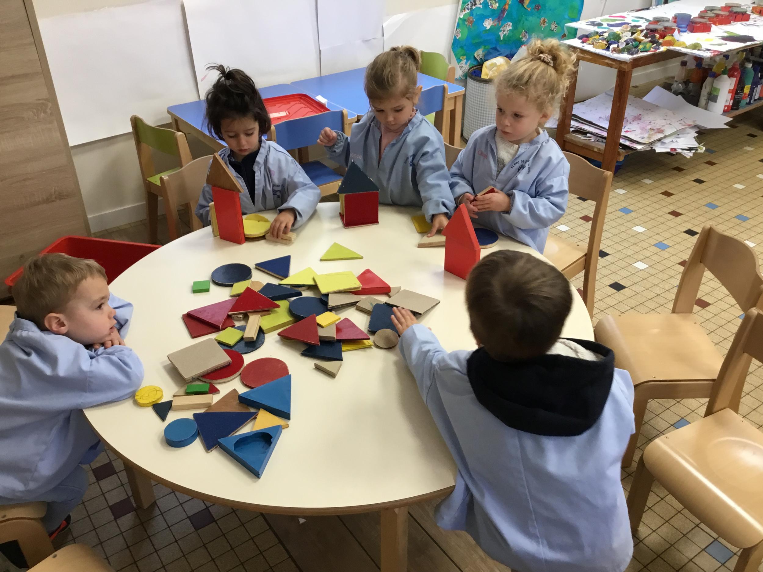 Avec les petites sections , nous avons joué à fabriquer des châteaux avec des blocs logiques. Ils devaient une fois la fabrication réalisée, présenter oralement leur production en la décrivant et en nommant les formes géométriques utilisées et les couleurs. Ils devaient aussi expliquer aux autres comment ils s’y étaient pris.