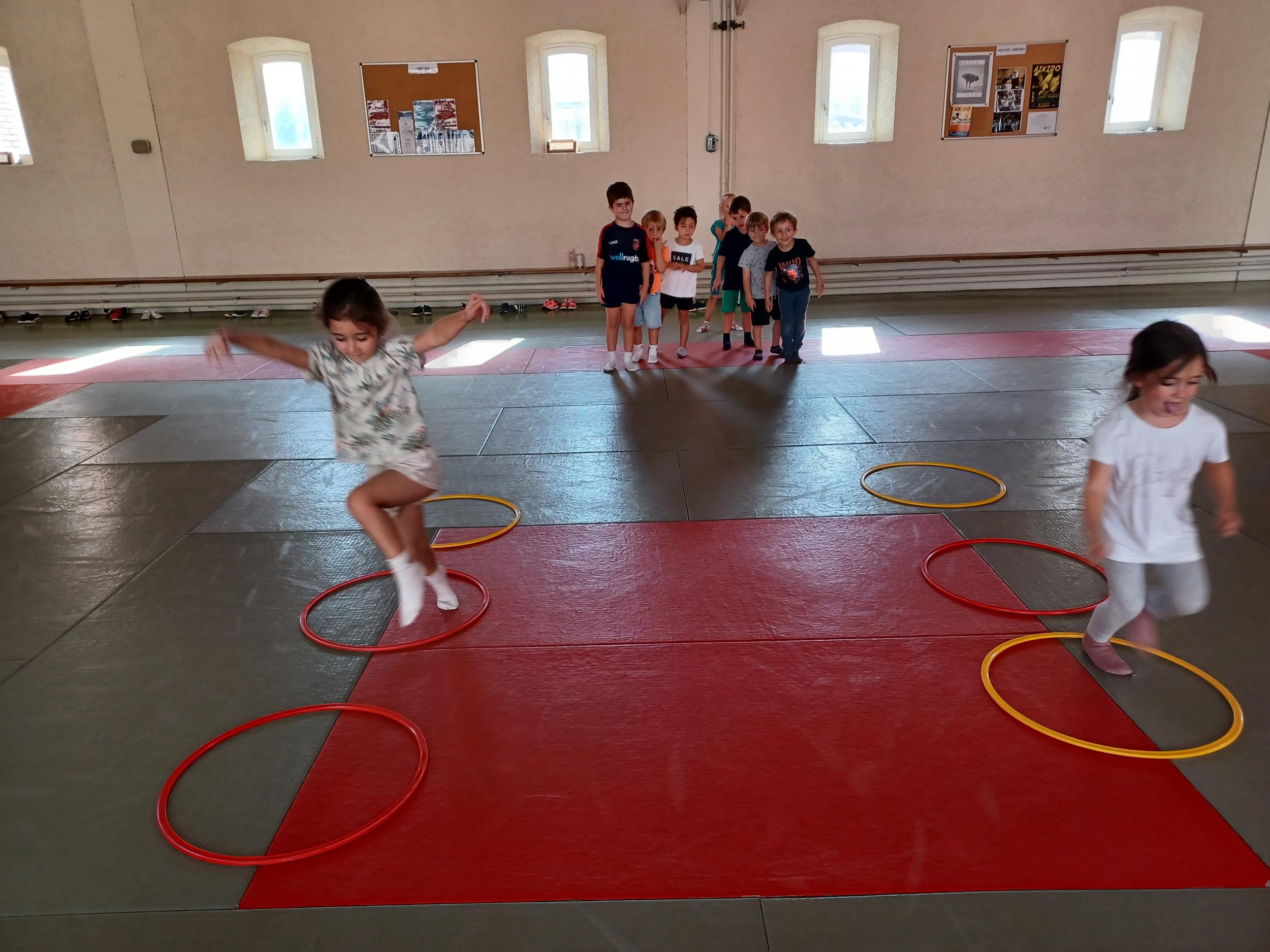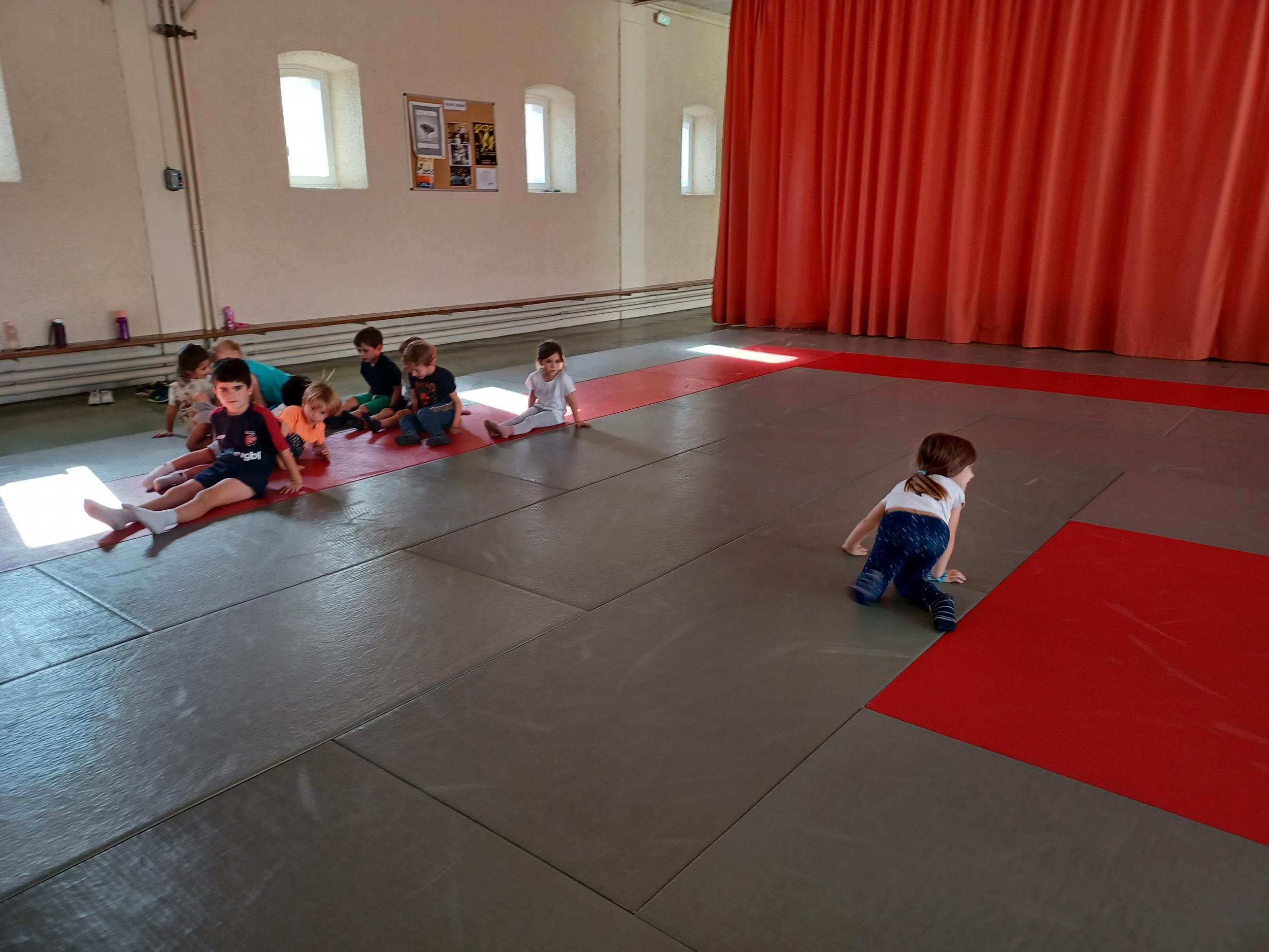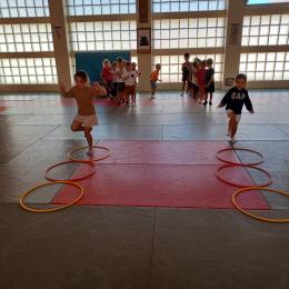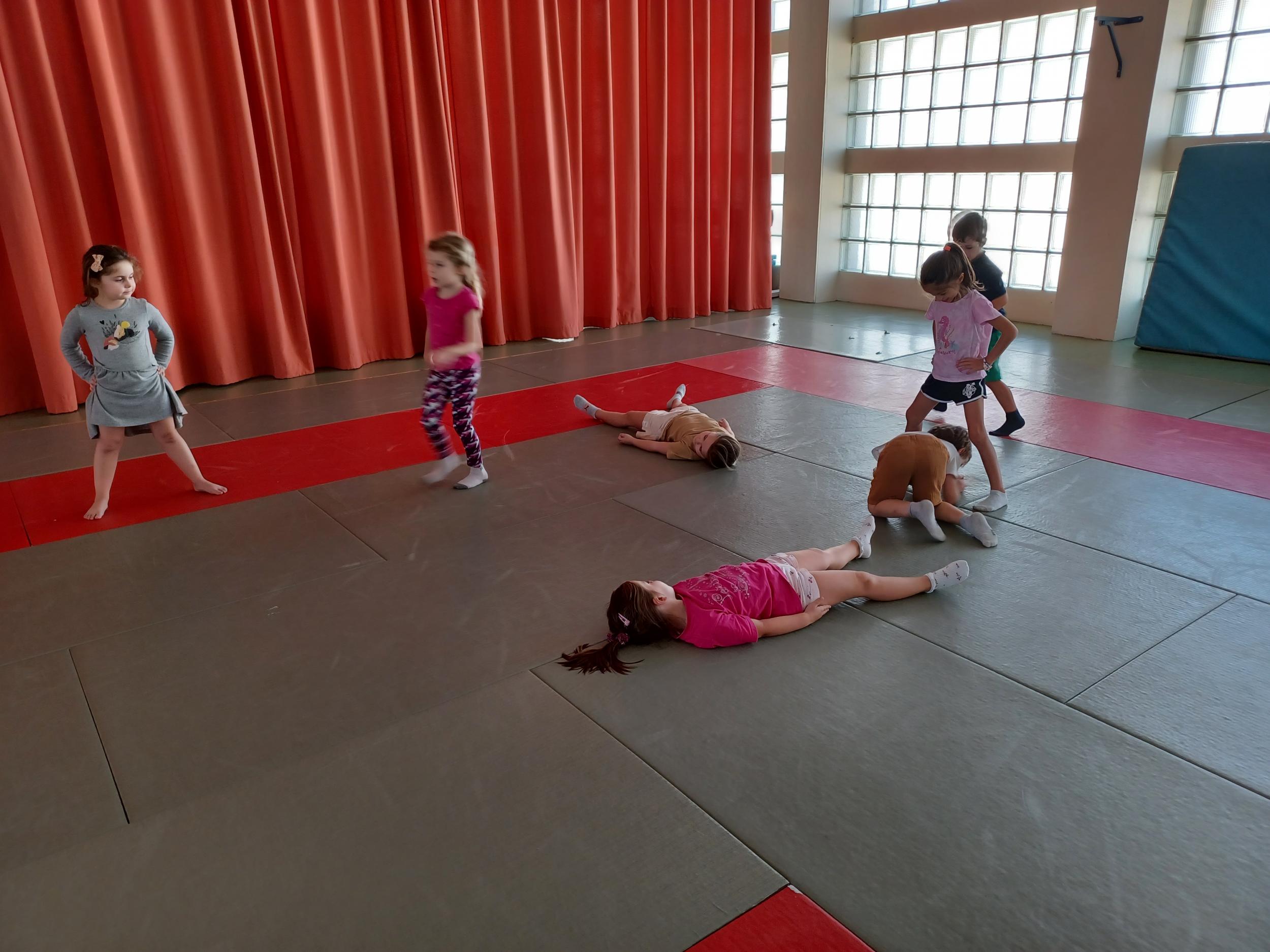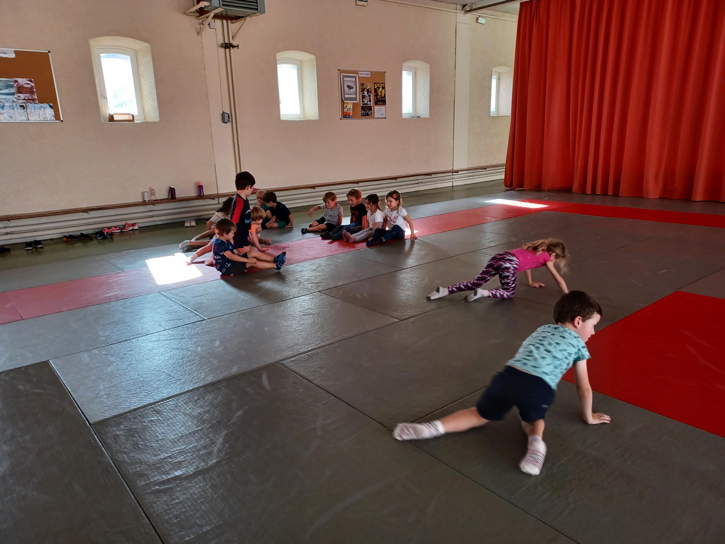 Tous les mardis après-midi, les grandes sections partent à la salle de sport. Nous avons travaillé, lors de ces premiers mois ,différentes façons de se déplacer, sur 3 niveaux : allongé, assis , et debout.