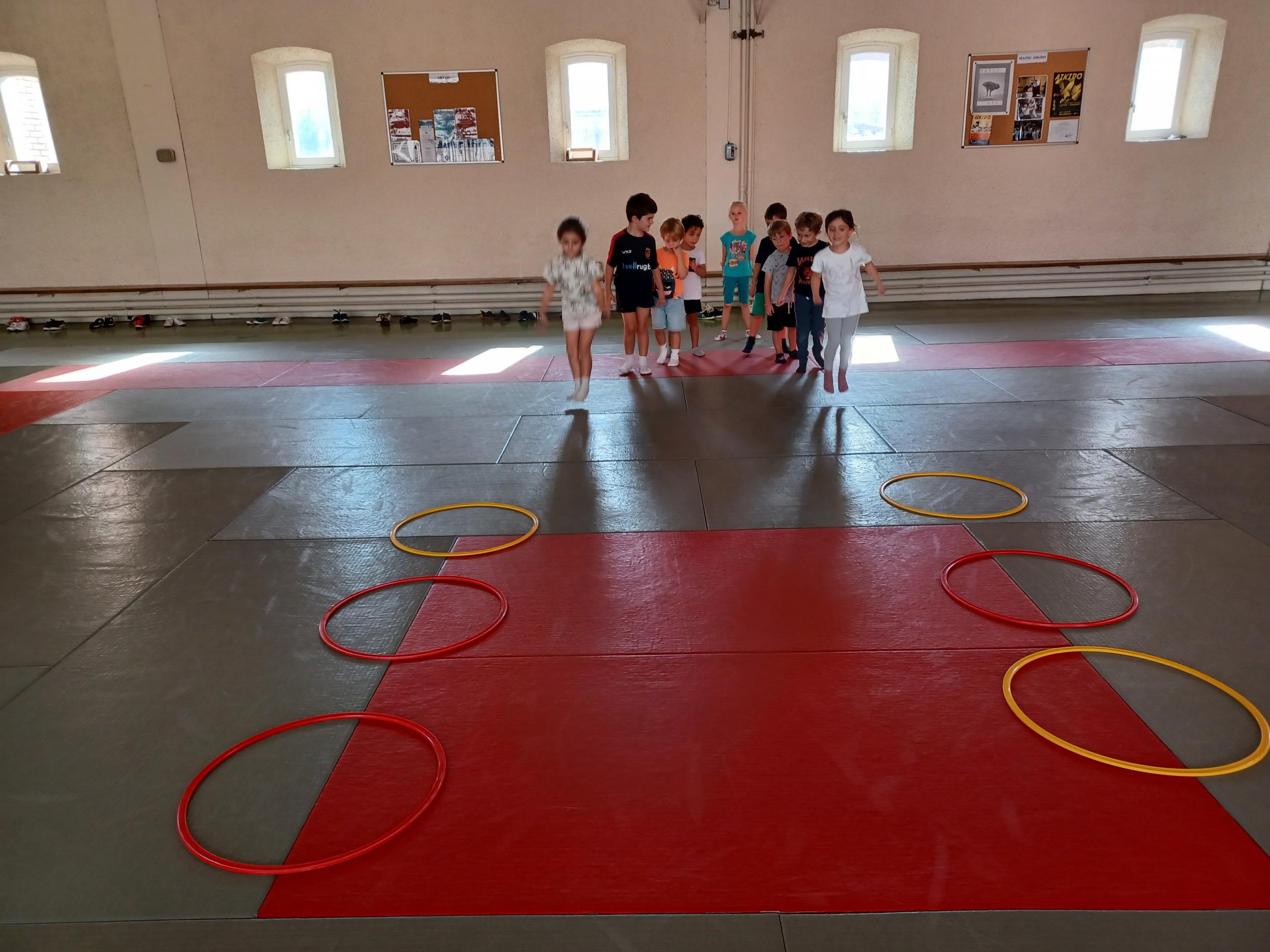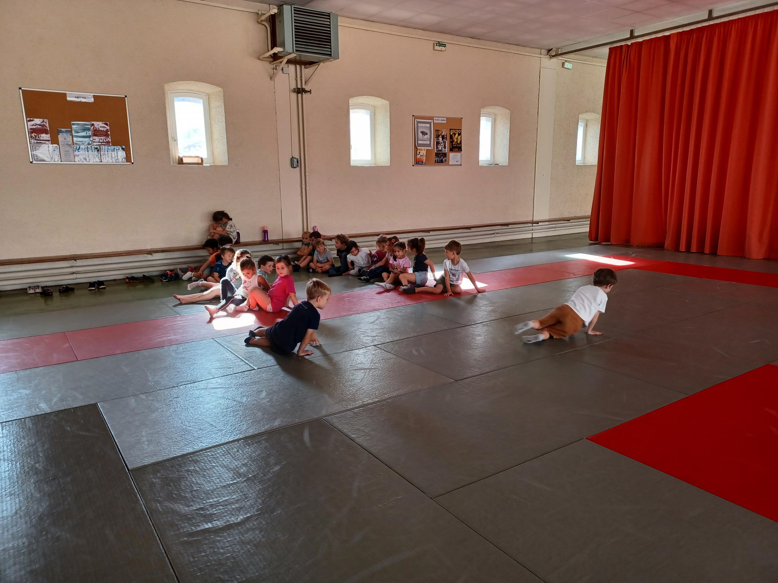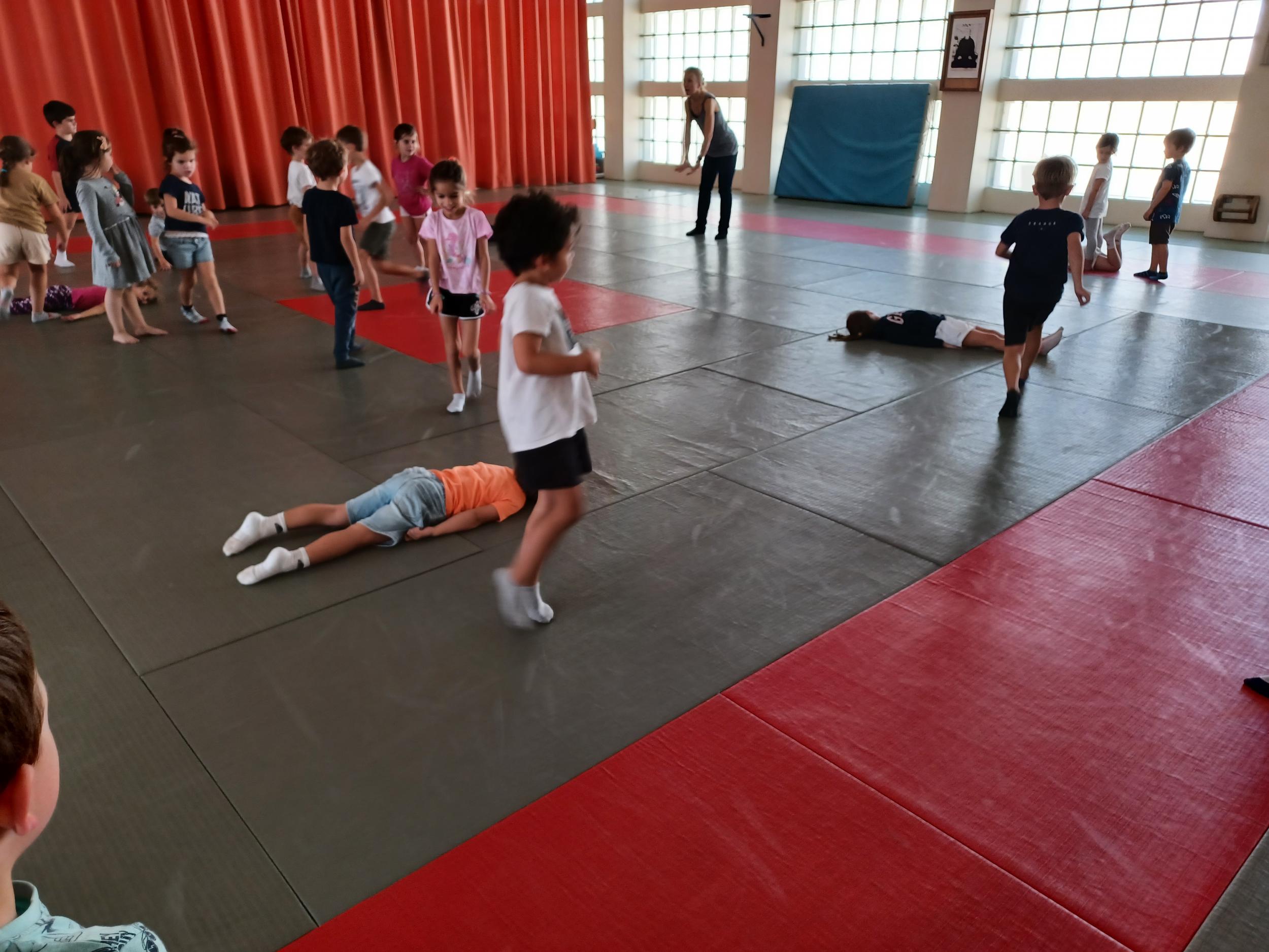 Tous les mardis après-midi, les grandes sections partent à la salle de sport. Nous avons travaillé, lors de ces premiers mois ,différentes façons de se déplacer, sur 3 niveaux : allongé, assis , et debout.