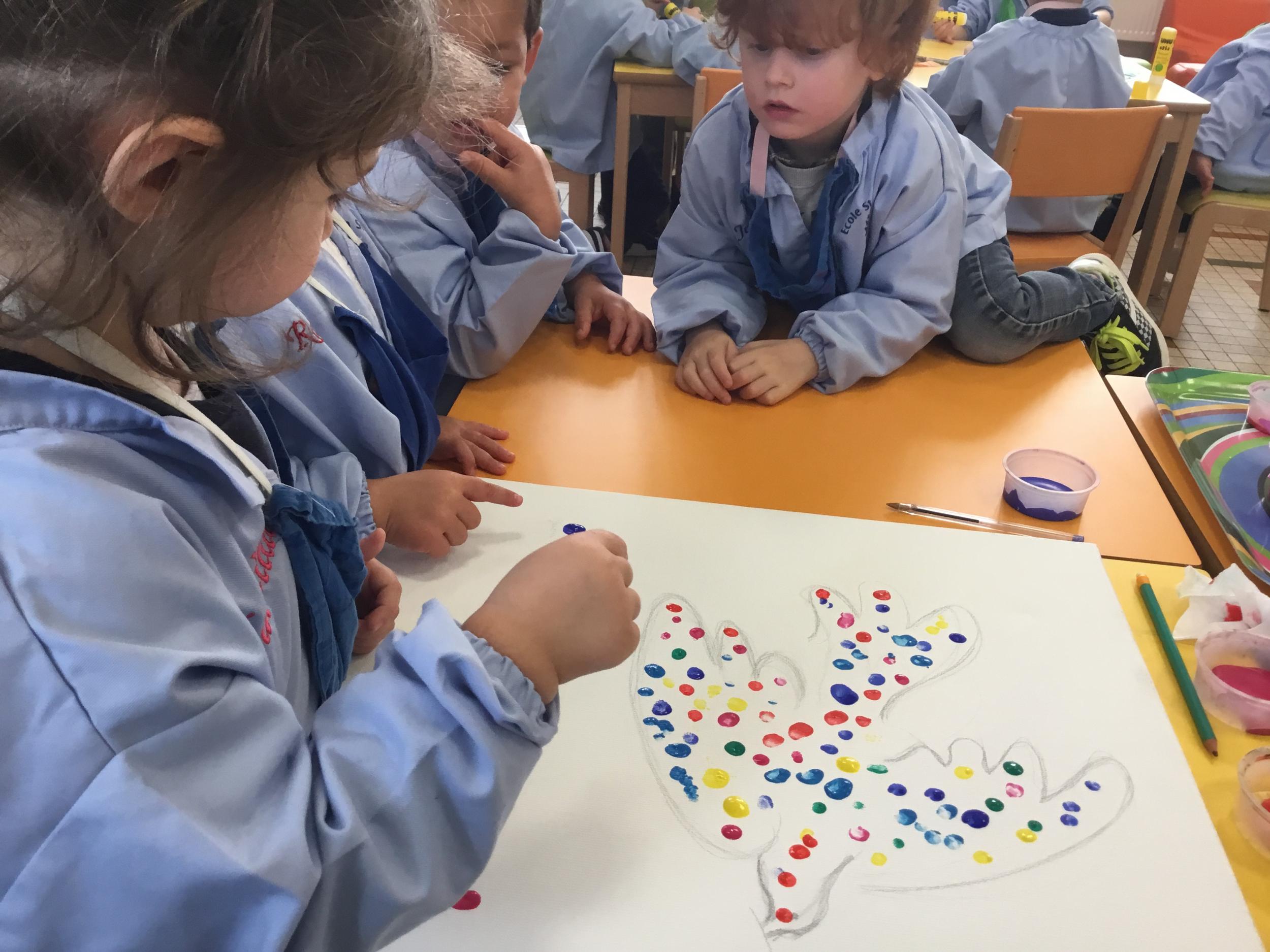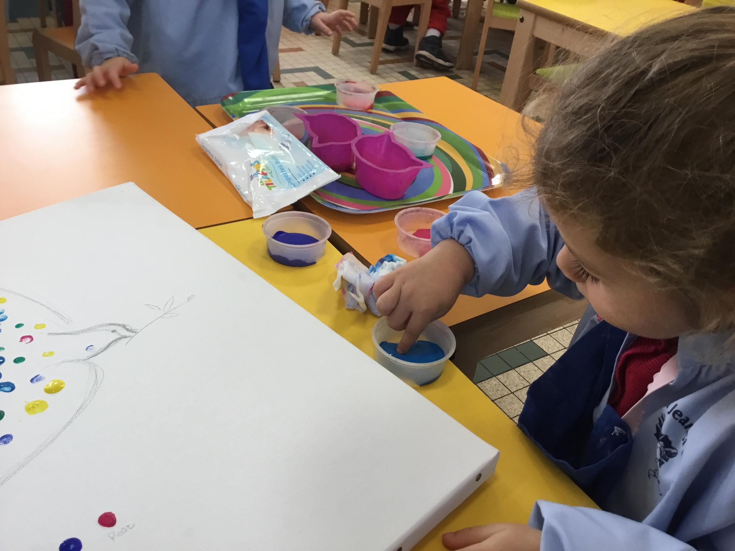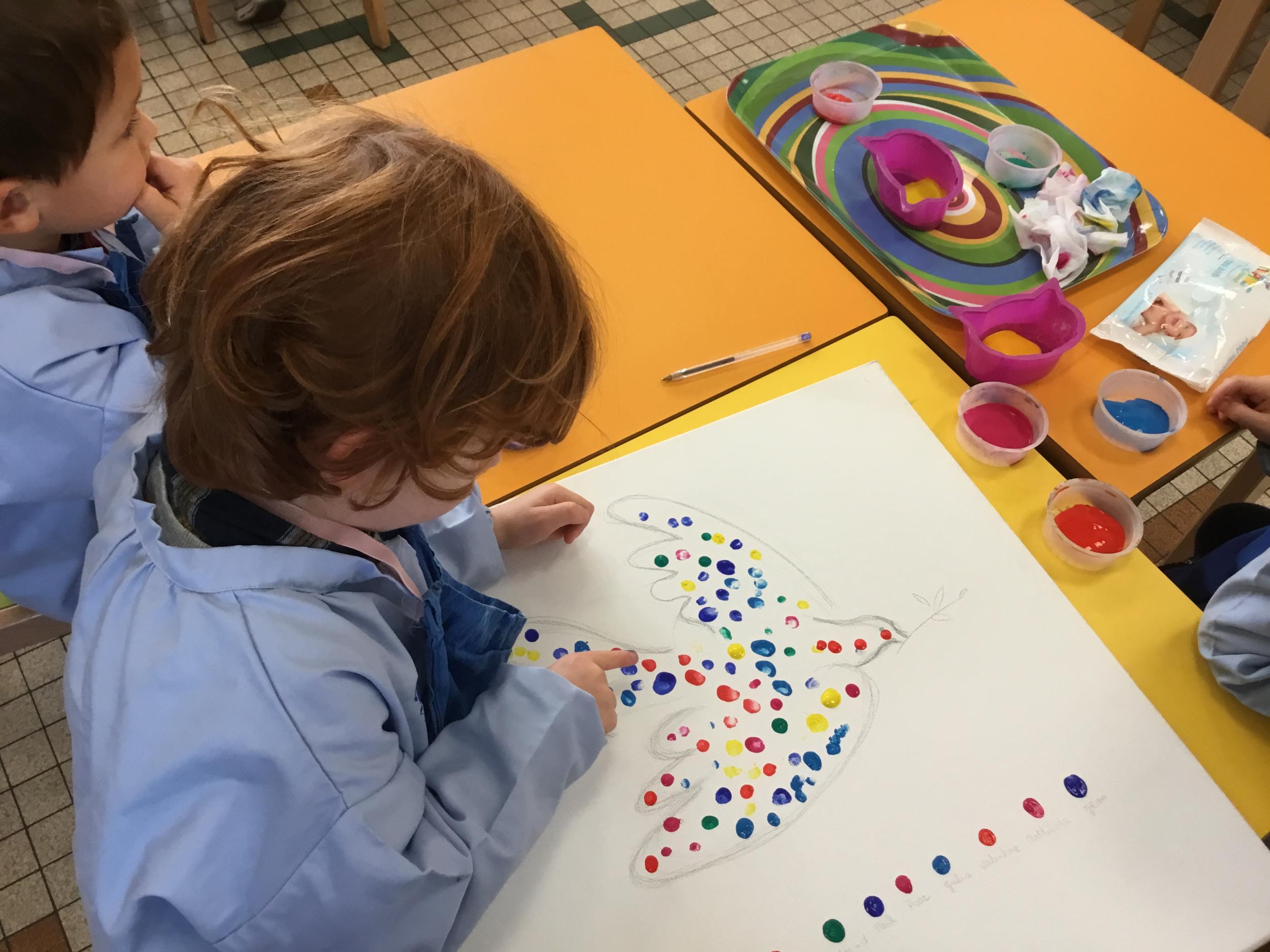 Cette semaine les élèves ont réalisé une œuvre collective. Chaque enfant a choisi une couleur et a rempli le corps de la colombe avec l’ empreinte de leur index. Puis ils ont signé l’œuvre de leur petit doigt.