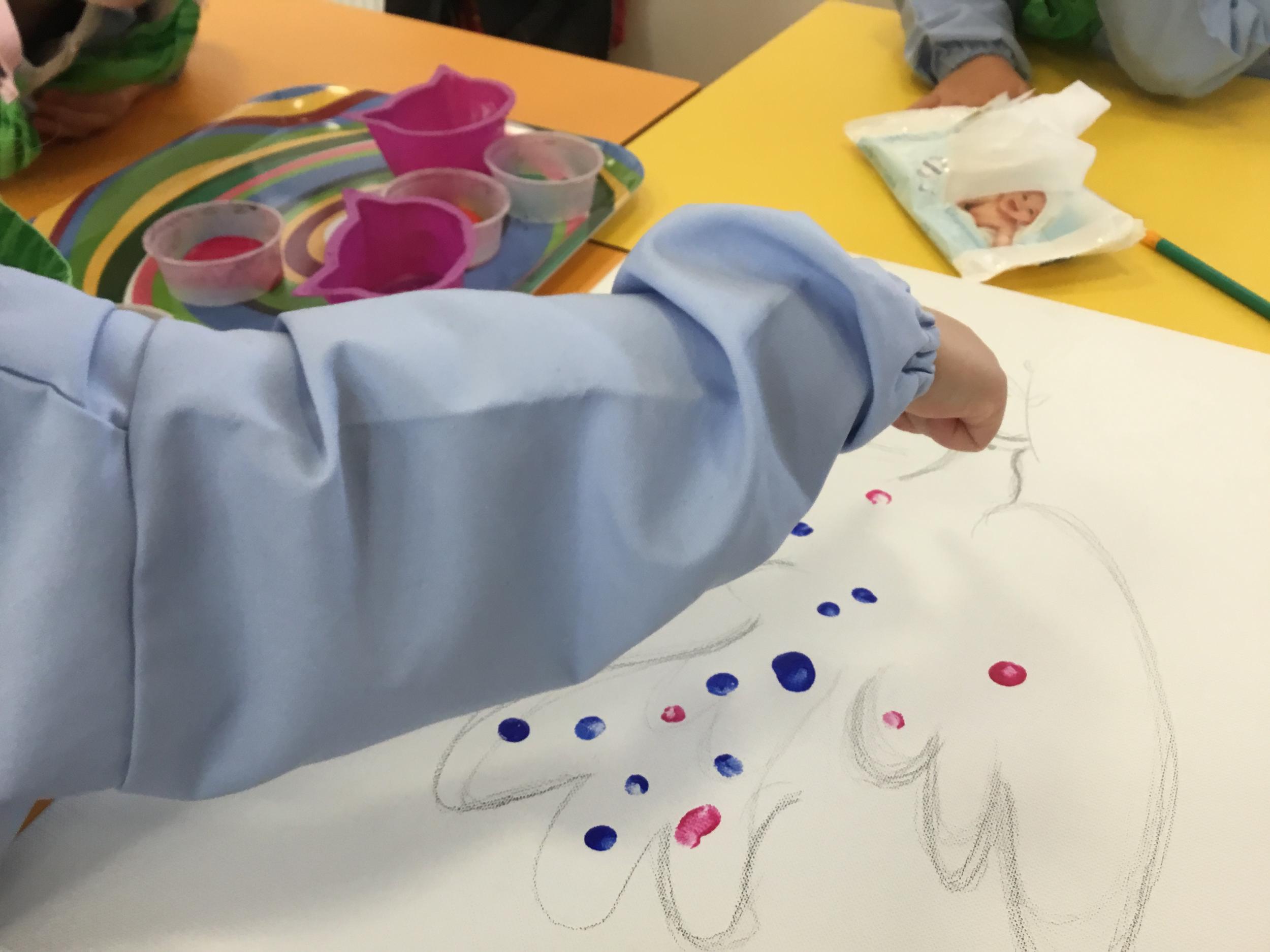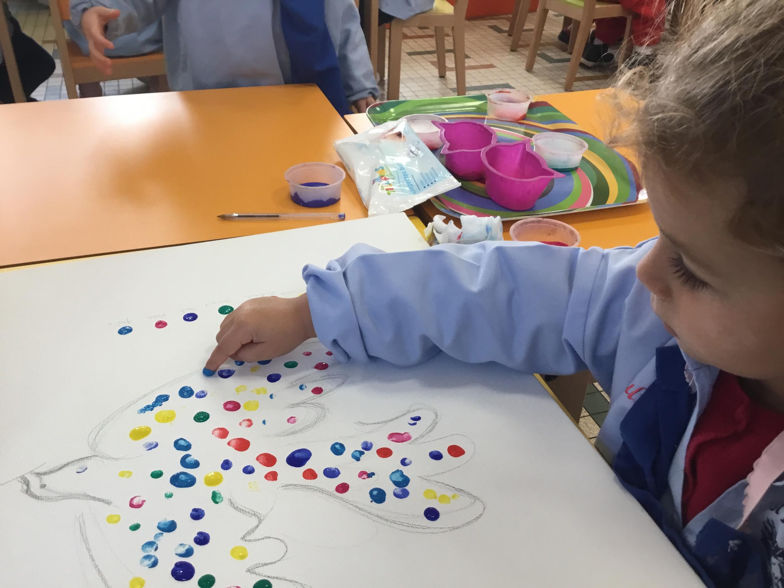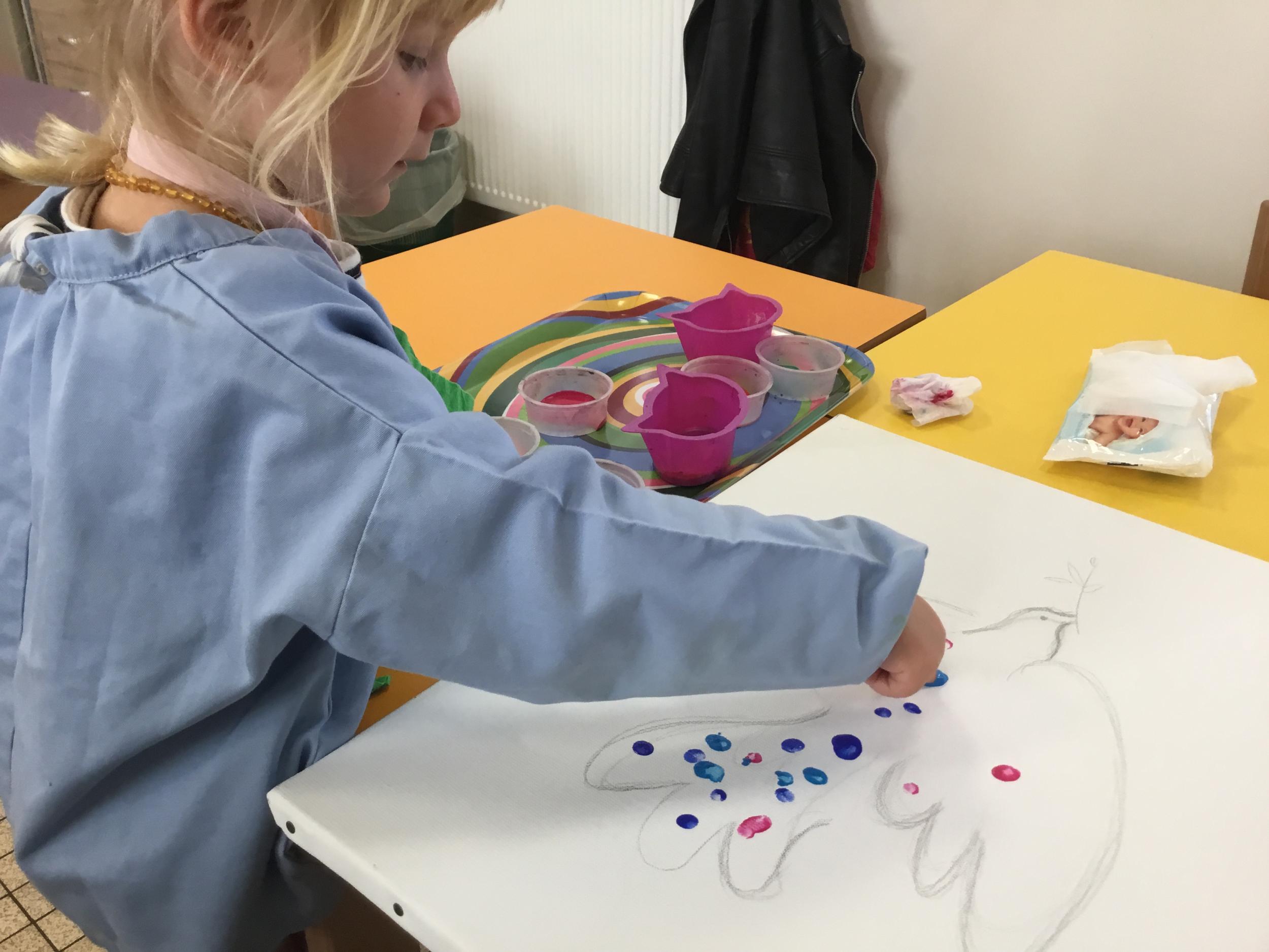 Cette semaine les élèves ont réalisé une œuvre collective. Chaque enfant a choisi une couleur et a rempli le corps de la colombe avec l’ empreinte de leur index. Puis ils ont signé l’œuvre de leur petit doigt.