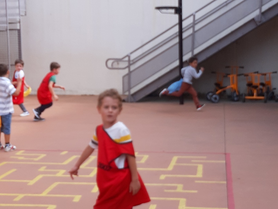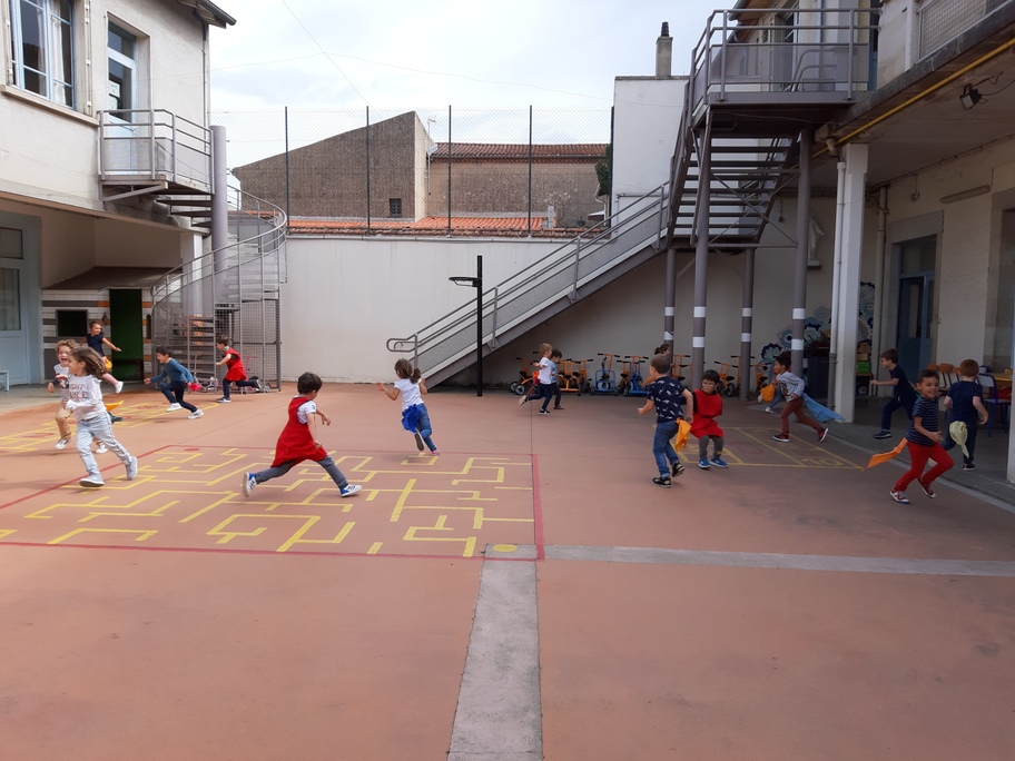Nous avons joué à nous déplacer dans toute la cour en suivant un code sonore (marche lente, trot et course) puis nous avons joué aux renards/ poules et coqs : courir avec un foulard accroché dans le dos sans se le faire attraper!