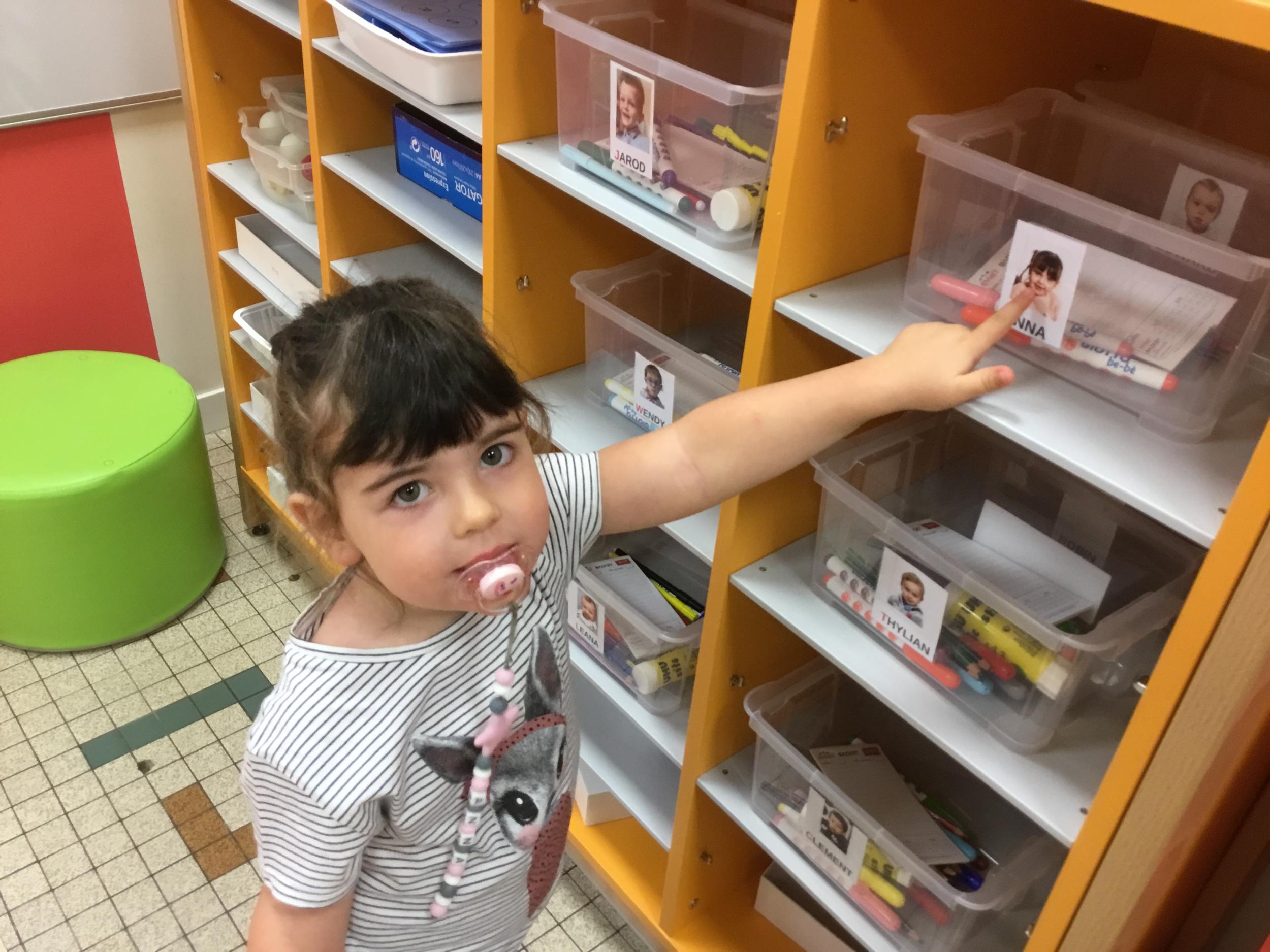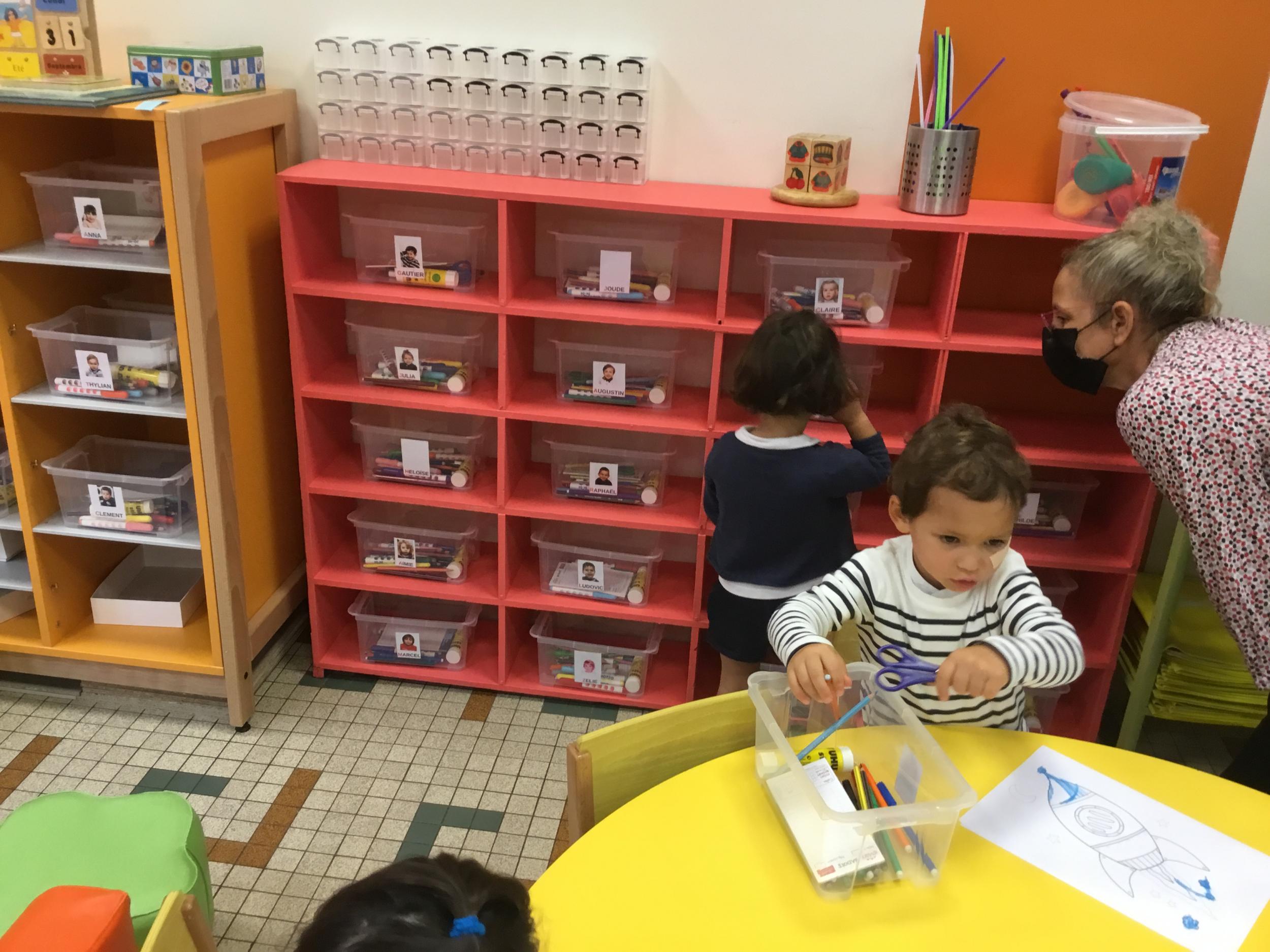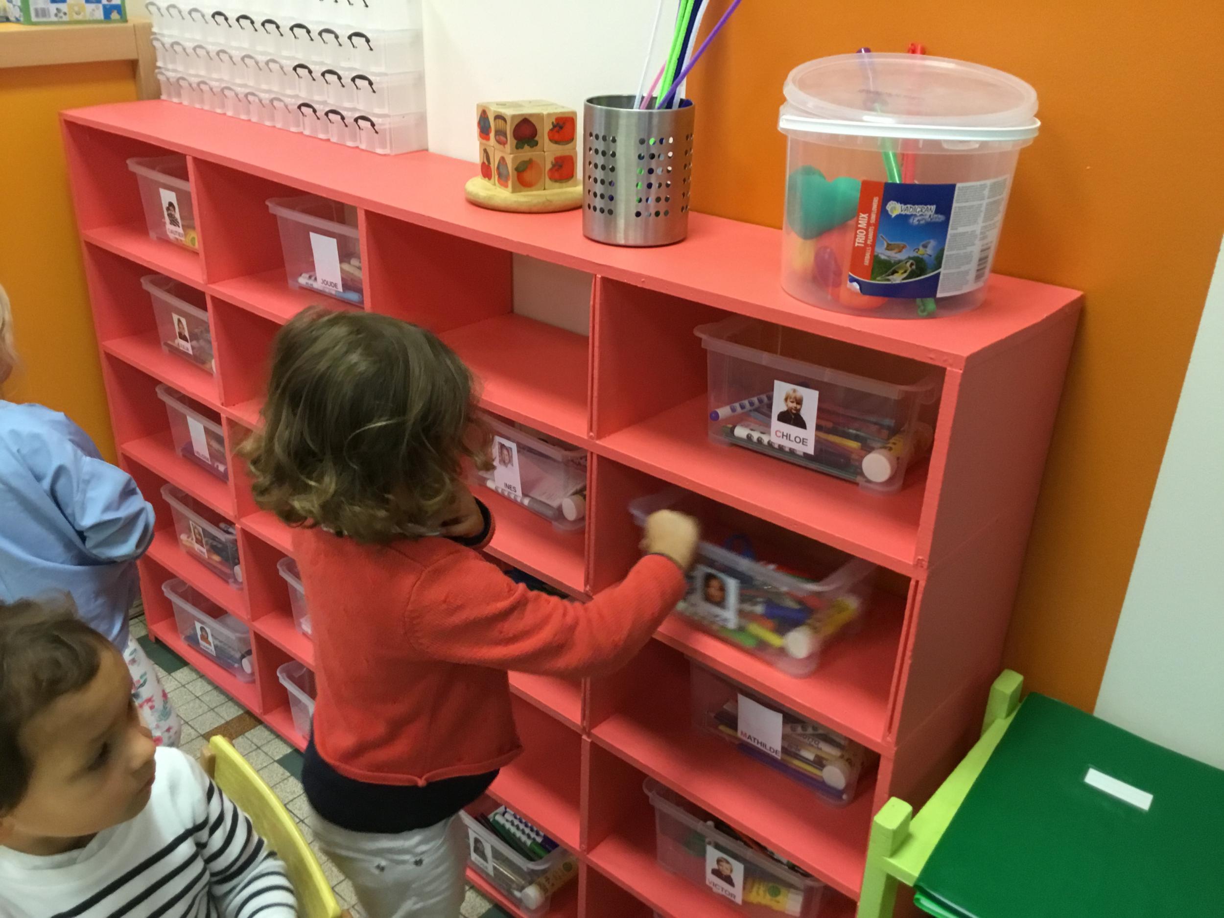 ils ont pu découvrir la classe et ses coins de jeux. Les étagères où se trouvent leur boîte individuelle de matériel.