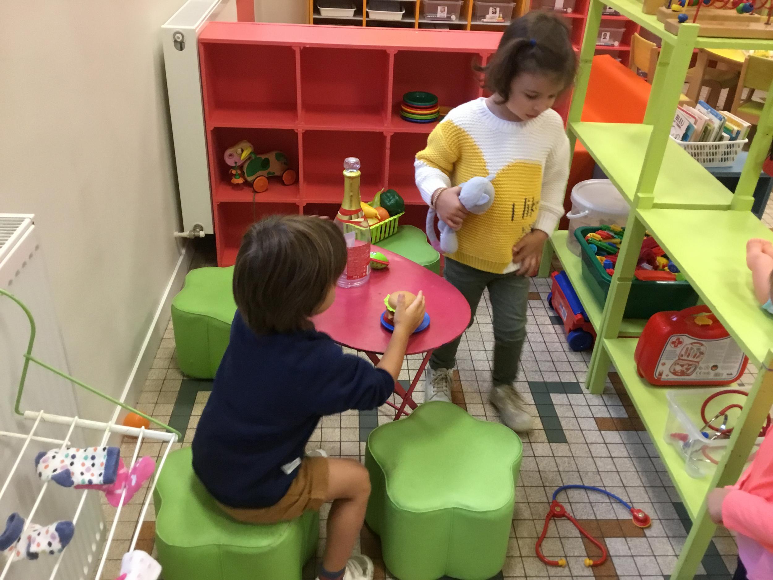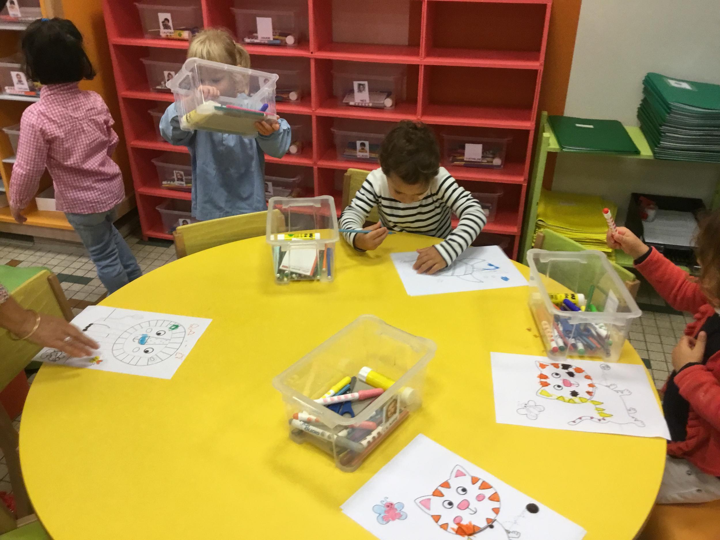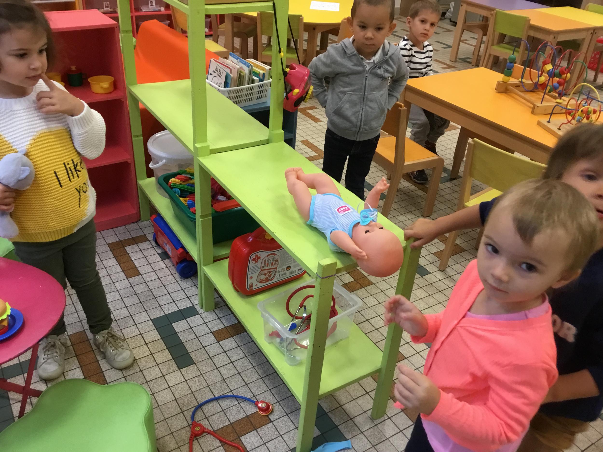 ils ont pu découvrir la classe et ses coins de jeux. Les étagères où se trouvent leur boîte individuelle de matériel.