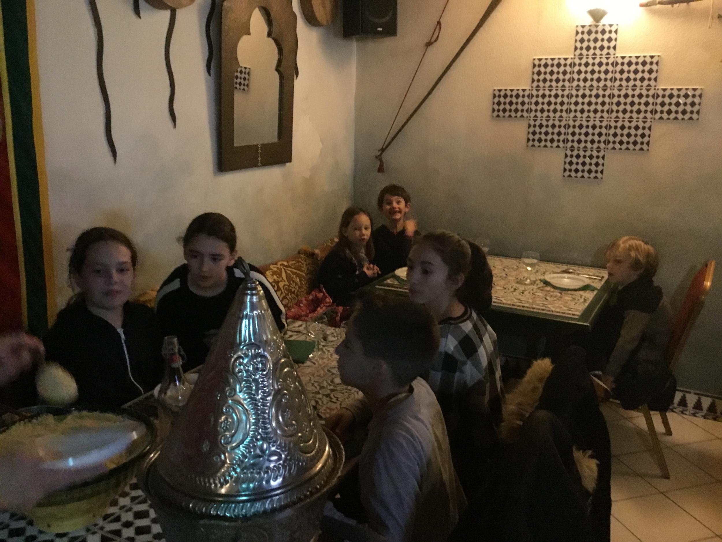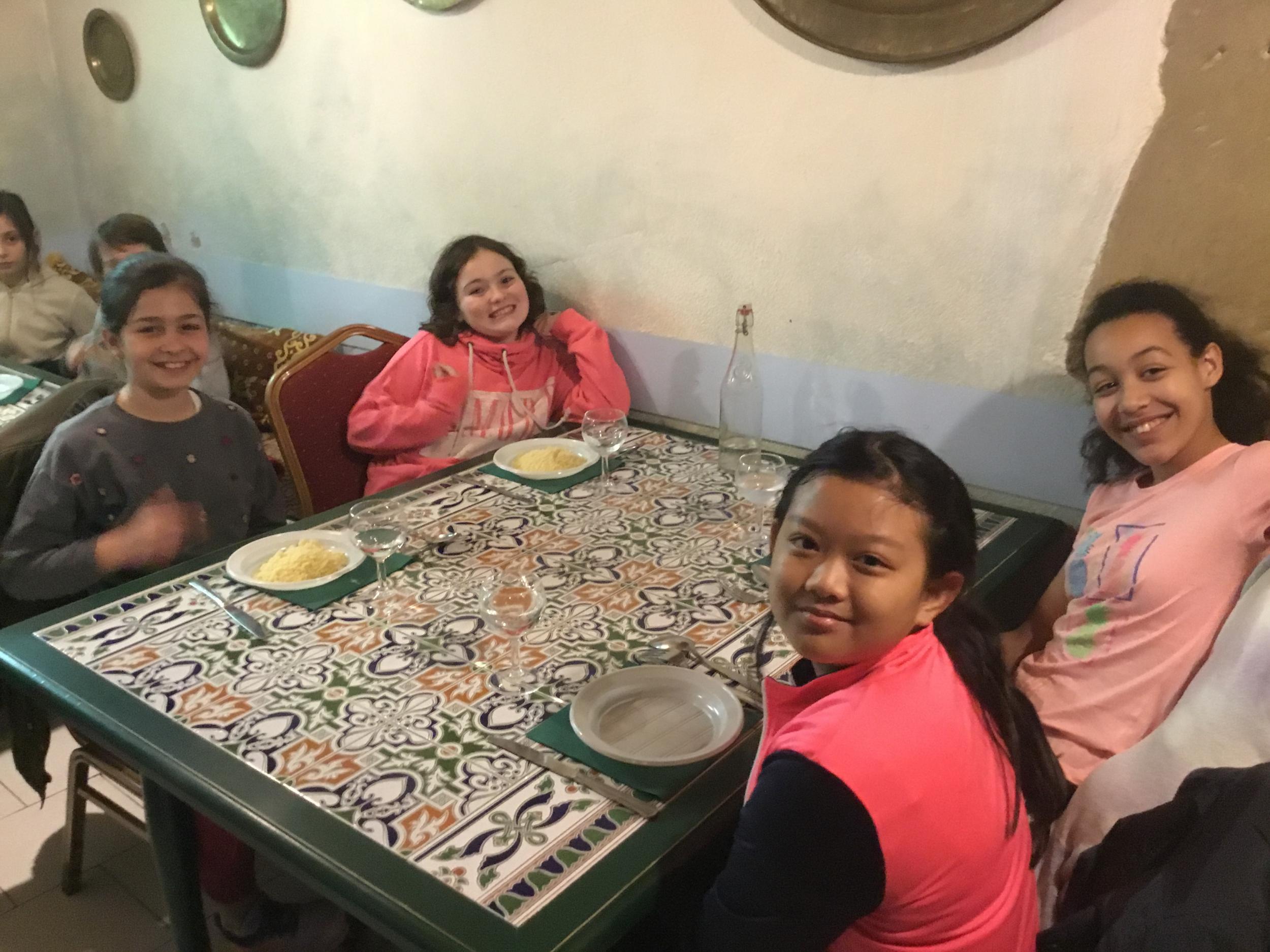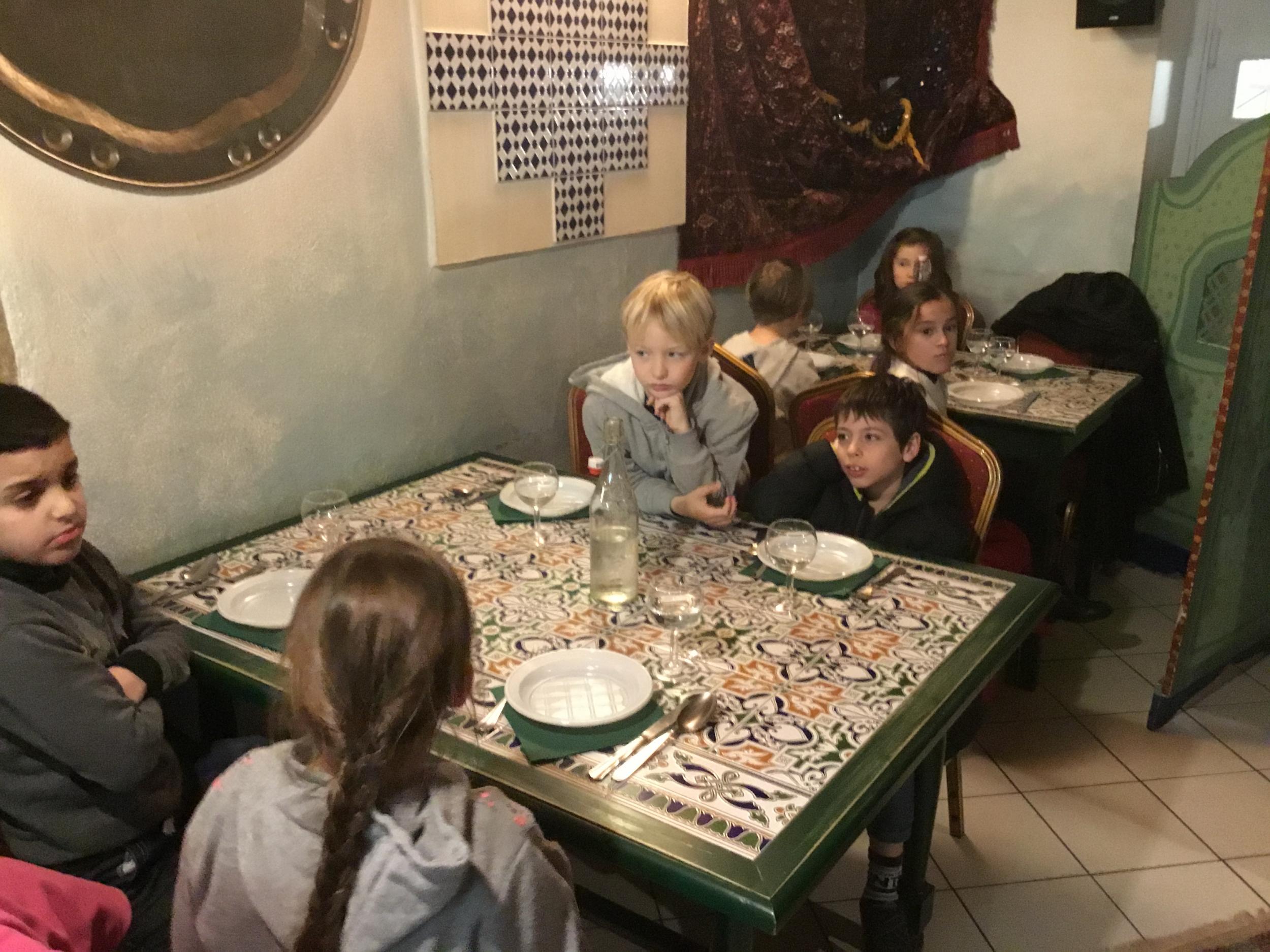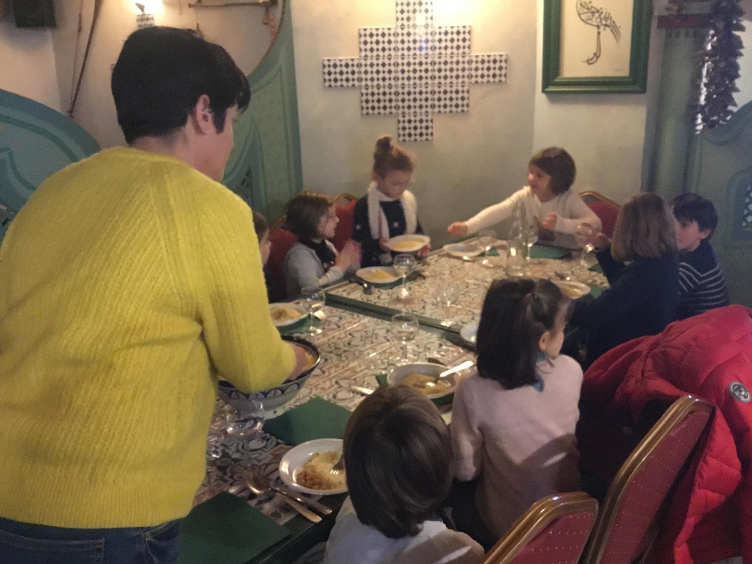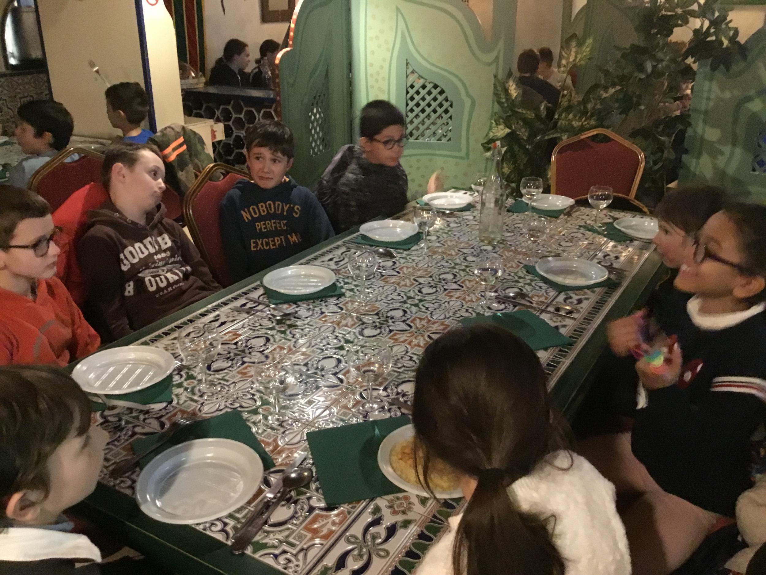 Vendredi 28 février, le collège DeLa Salle fêtait ses 250 ans et ne pouvait pas accueillir nos élèves pour le déjeuner de midi. Avec la complicité du Marrakech, nous avons organisé un repas surprise au restaurant pour les élèves du primaire, déjeunant ce jour là à la cantine. Repas tenu secret, le nombre de places au restaurant étant limité ! Les petits, quant à eux, ont bénéficié d’un délicieux couscous au poulet servi à L’ECOLE par le restaurant. Un grand MERCI au restaurant Le Marrakech .Un grand Merci, également, aux enseignants qui ont encadré et servi les élèves, le Marrakech n’ayant pas le personnel pour recevoir et servir 80 personnes en même temps .....