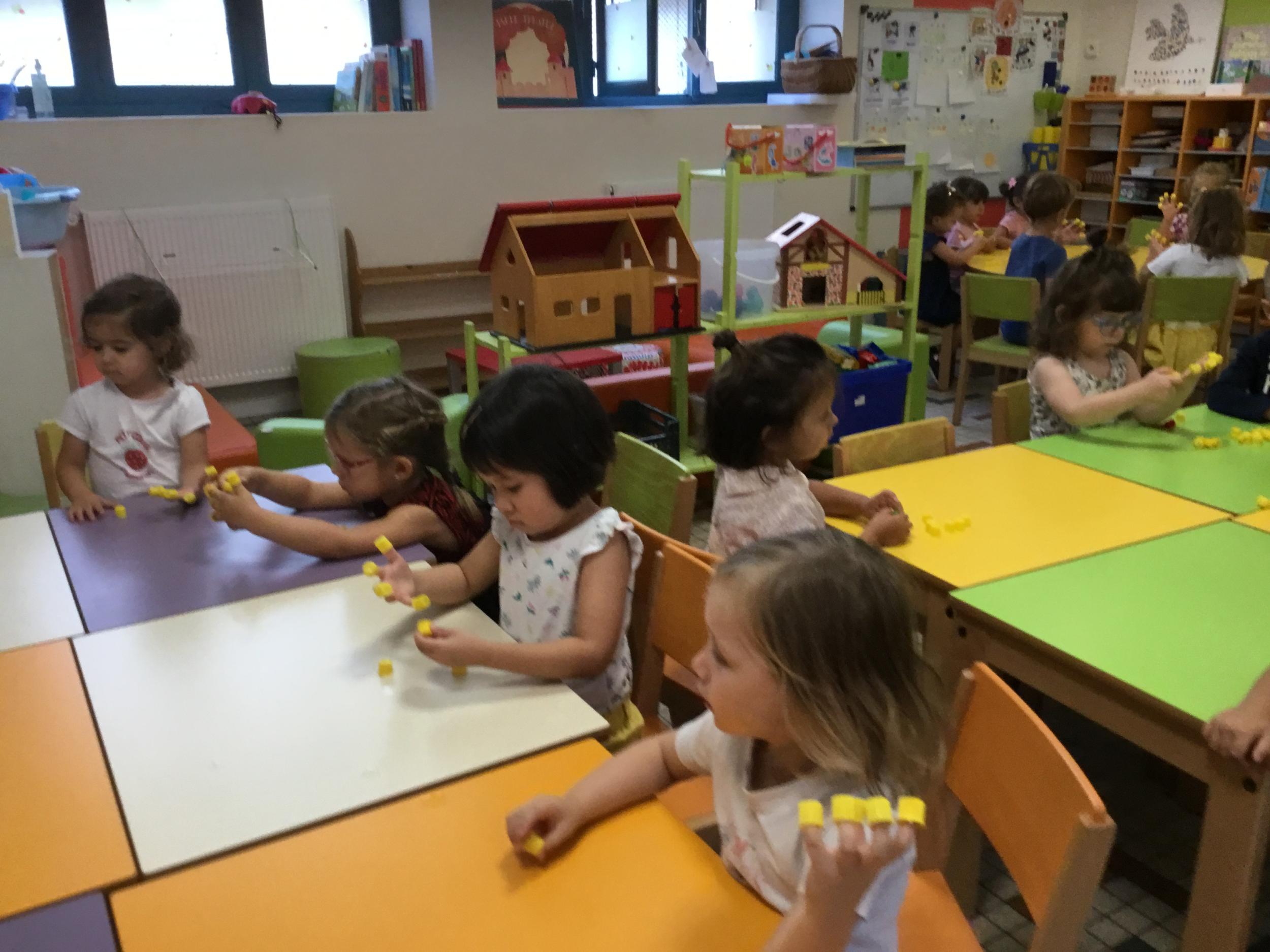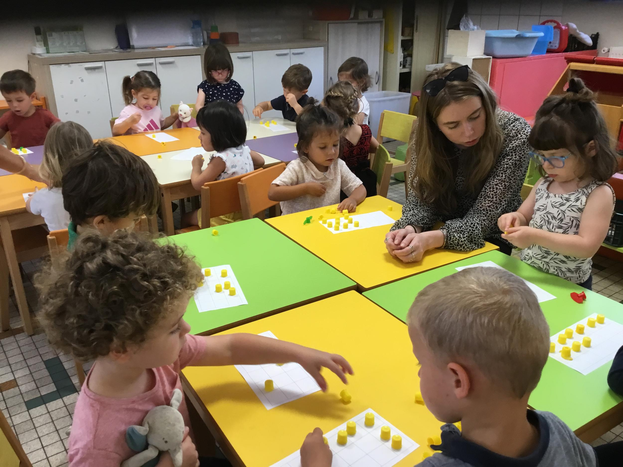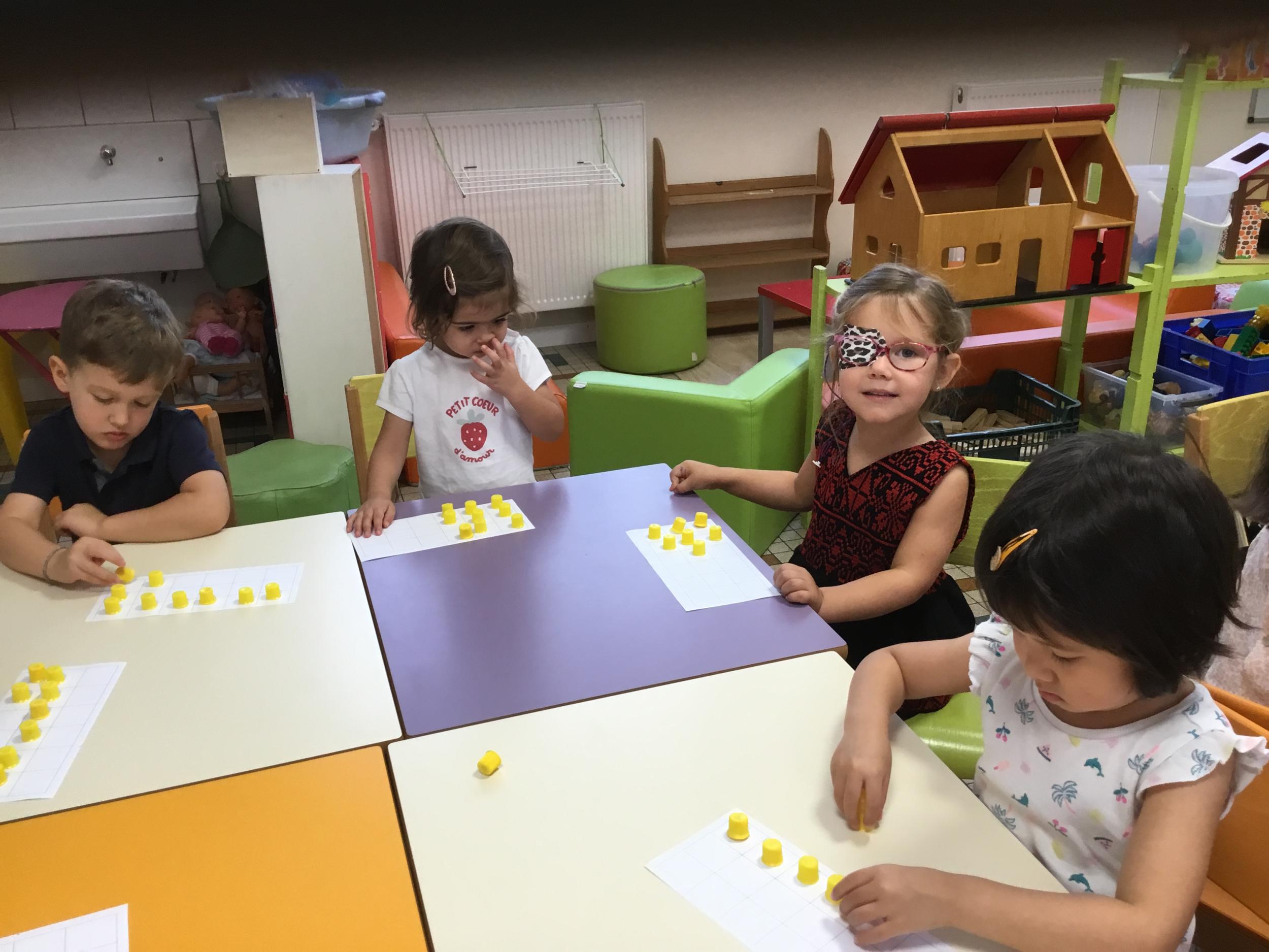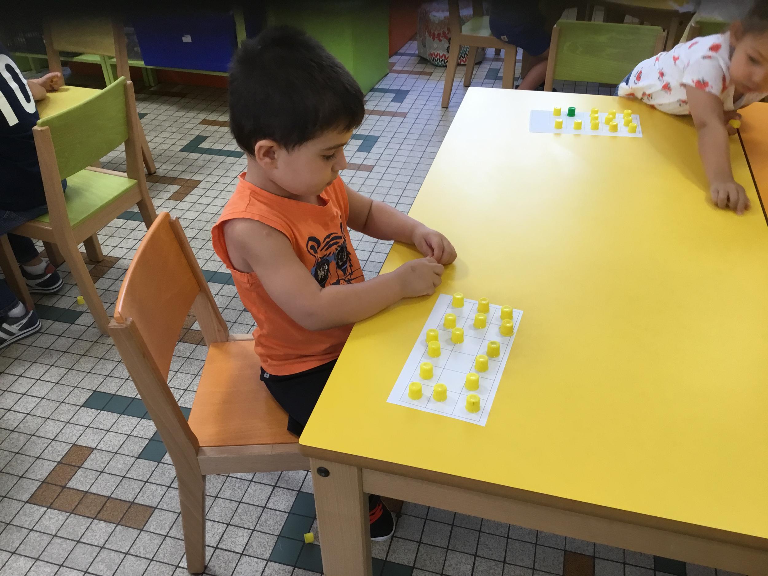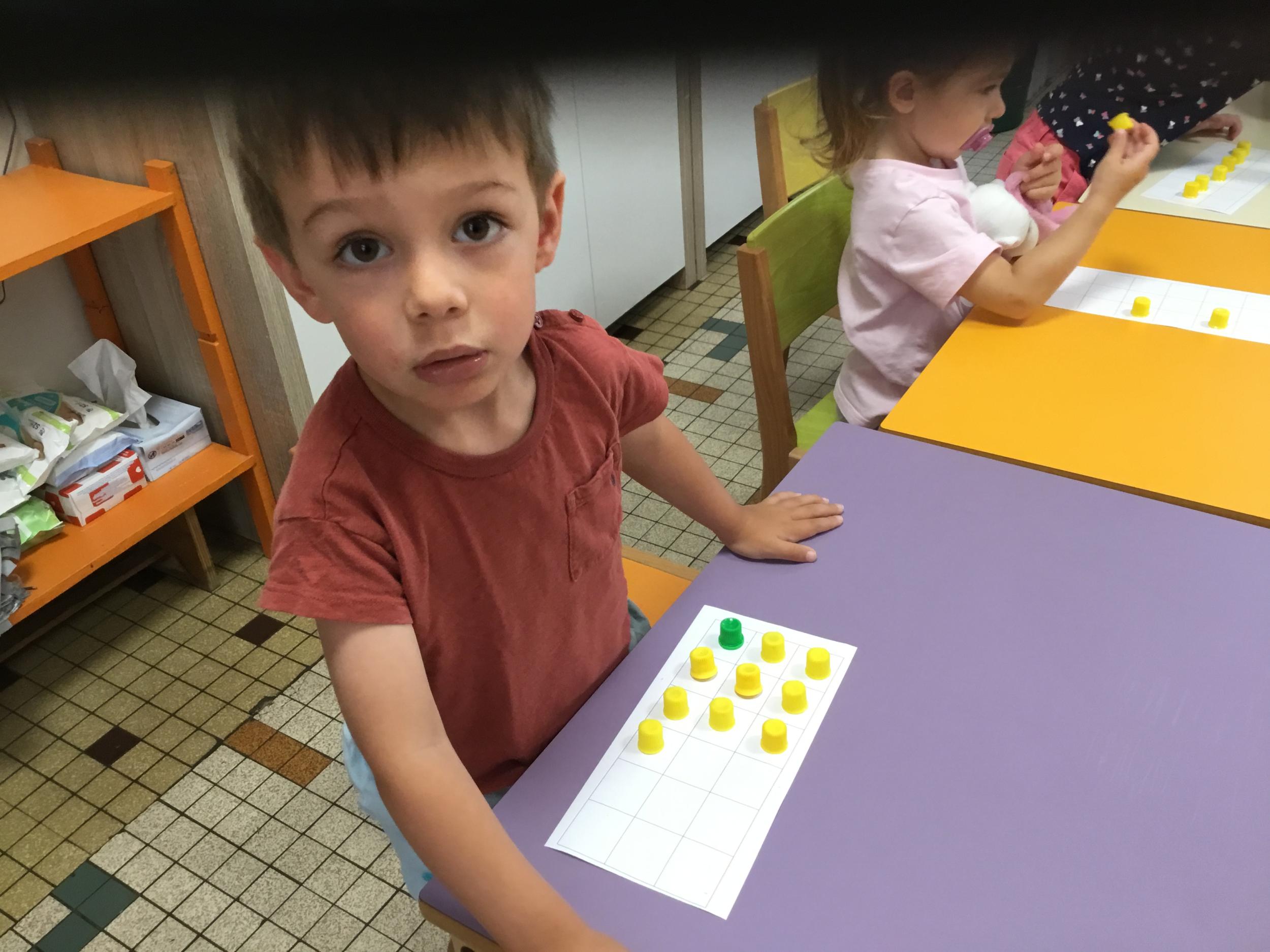 Pour comprendre les notions de « trop » ou « pas assez » nous avons travaillé avec des bouchons . La maîtresse a distribué des bouchons et chacun devait les placer au bout des doigts ….. Un petit chapeau sur chaque doigt … l’occasion de travailler la motricité fine mais surtout d’observer si « j’en ai trop ou pas assez » Puis nous avons continué en posant un bouchon sur chaque case d un quadrillage .