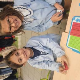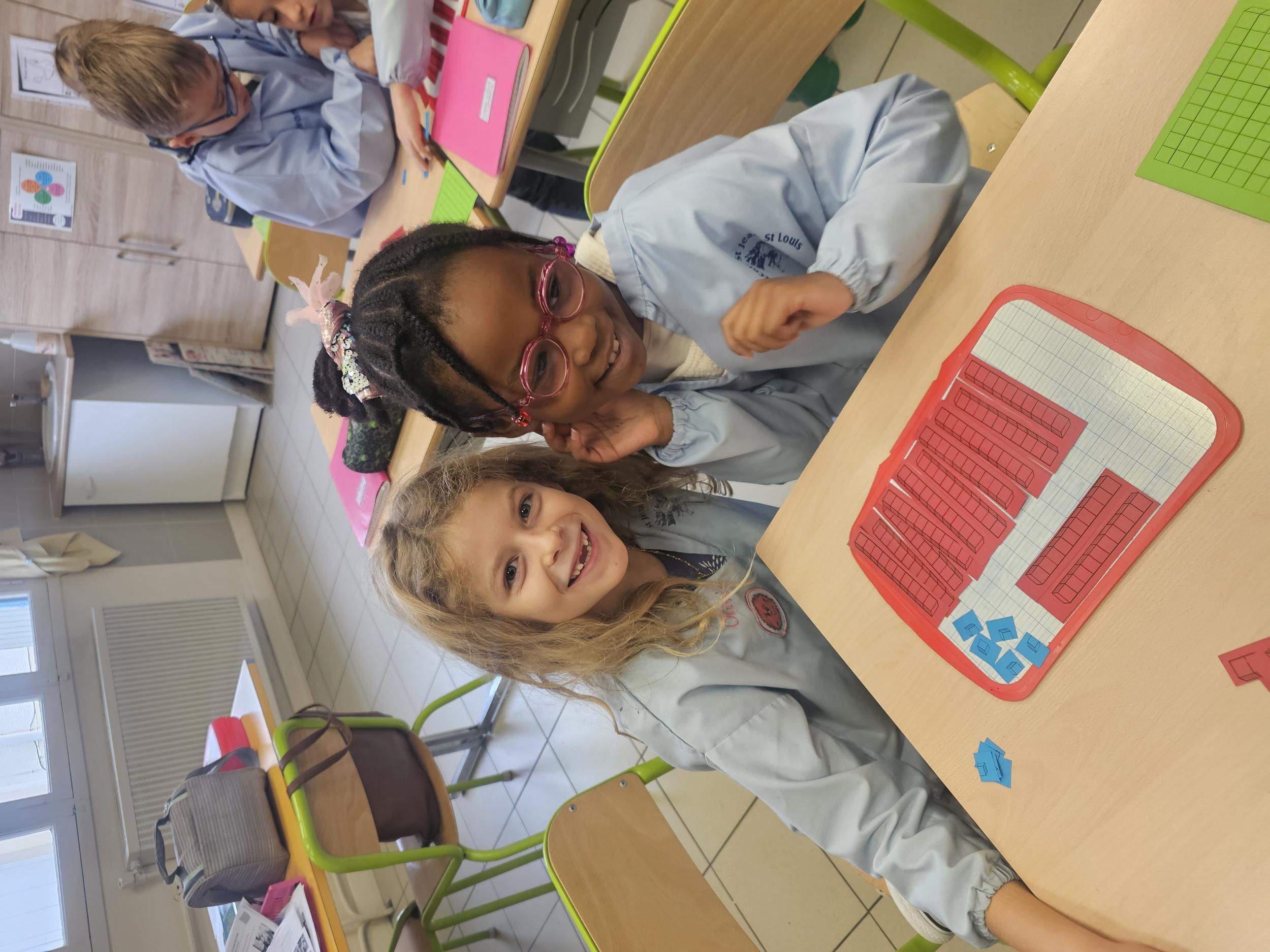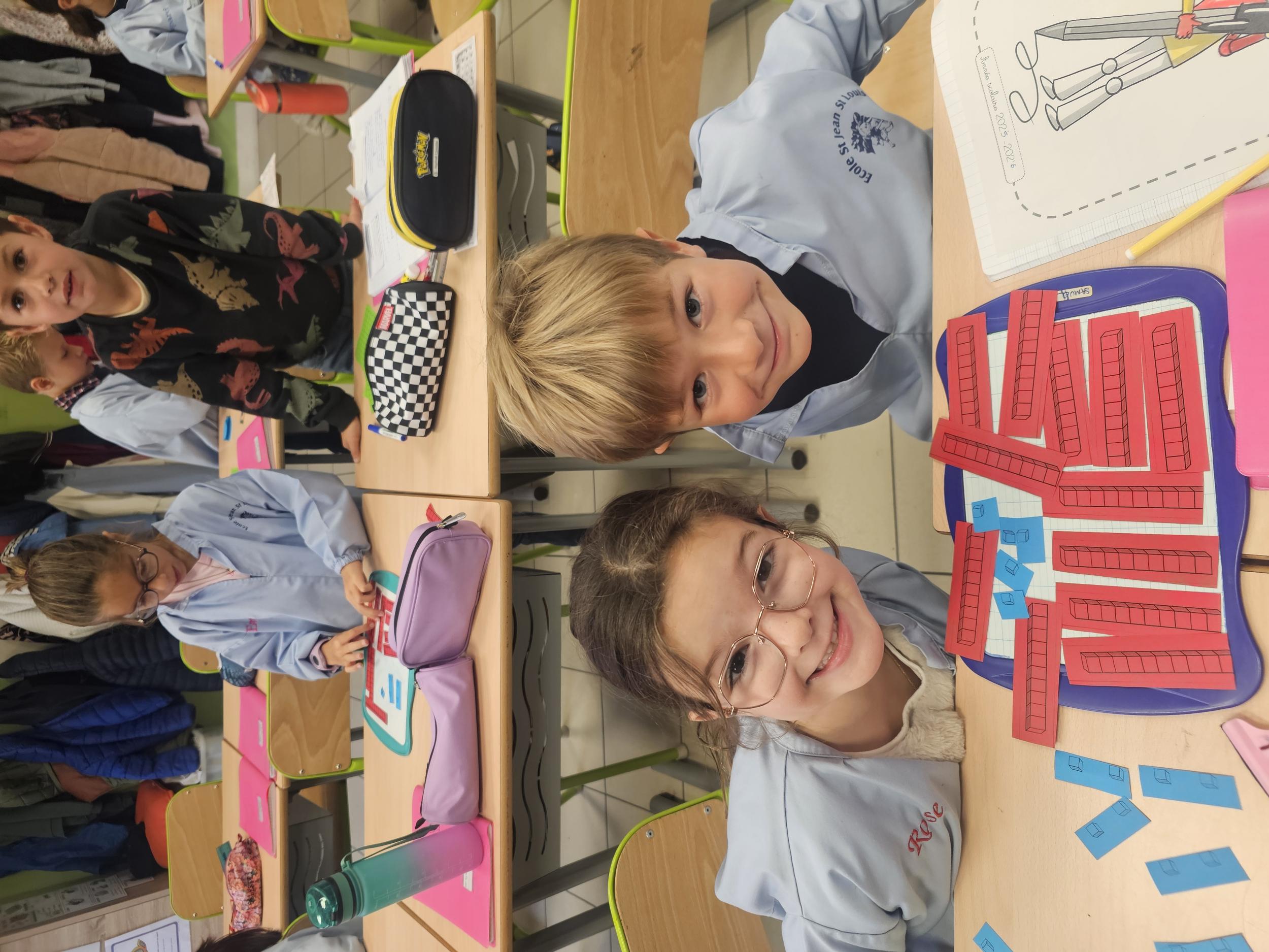 En CP, les élèves ont vu les nombres jusqu'à 100. Durant la première période de CE1 nous avons revu ces notions mais nous sommes rapidement allés au delà mais en passant beaucoup par la manipulation. Pour que l'abstraction soit possible en mathématiques il faut que l'enfant se représente le nombre de différentes manières. Ici l'unité est le cube bleu, la dizaine est une barre rouge (assemblage de 10 cubes) et la centaine est un carré vert (assemblage de 100 cubes). L'enseignante écrit un nombre au tableau, les élèves le représentent à l'aide du matériel. Le travail en binôme favorise les échanges, l'entraide et la réflexion collective.