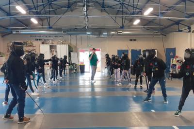 Après des échauffements sous forme de jeux (mobilisant aussi coopération et calcul mental), les élèves travaillent les techniques d'attaque, de parade et de riposte, pour mener de petits duels.